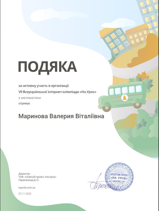 Студенти першого та другого курсів Відокремленого структурного підрозділу «Фахового коледжу Миколаївського національного університету імені В.О.Сухомлинського», під керівництвом викладача математики Марінової Валерії Віталіївни активно долучились до участі у Всеукраїнській інтернет-олімпіаді з математики «Осінь 2020».