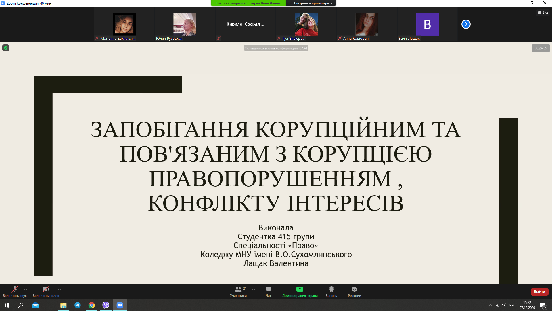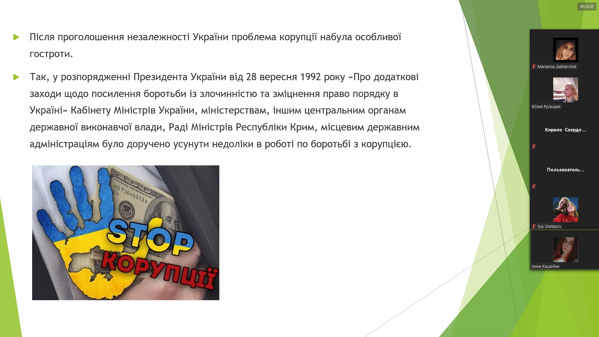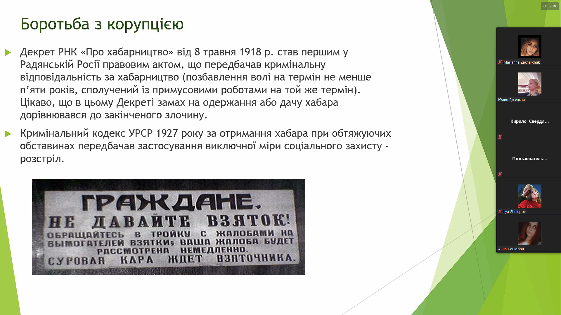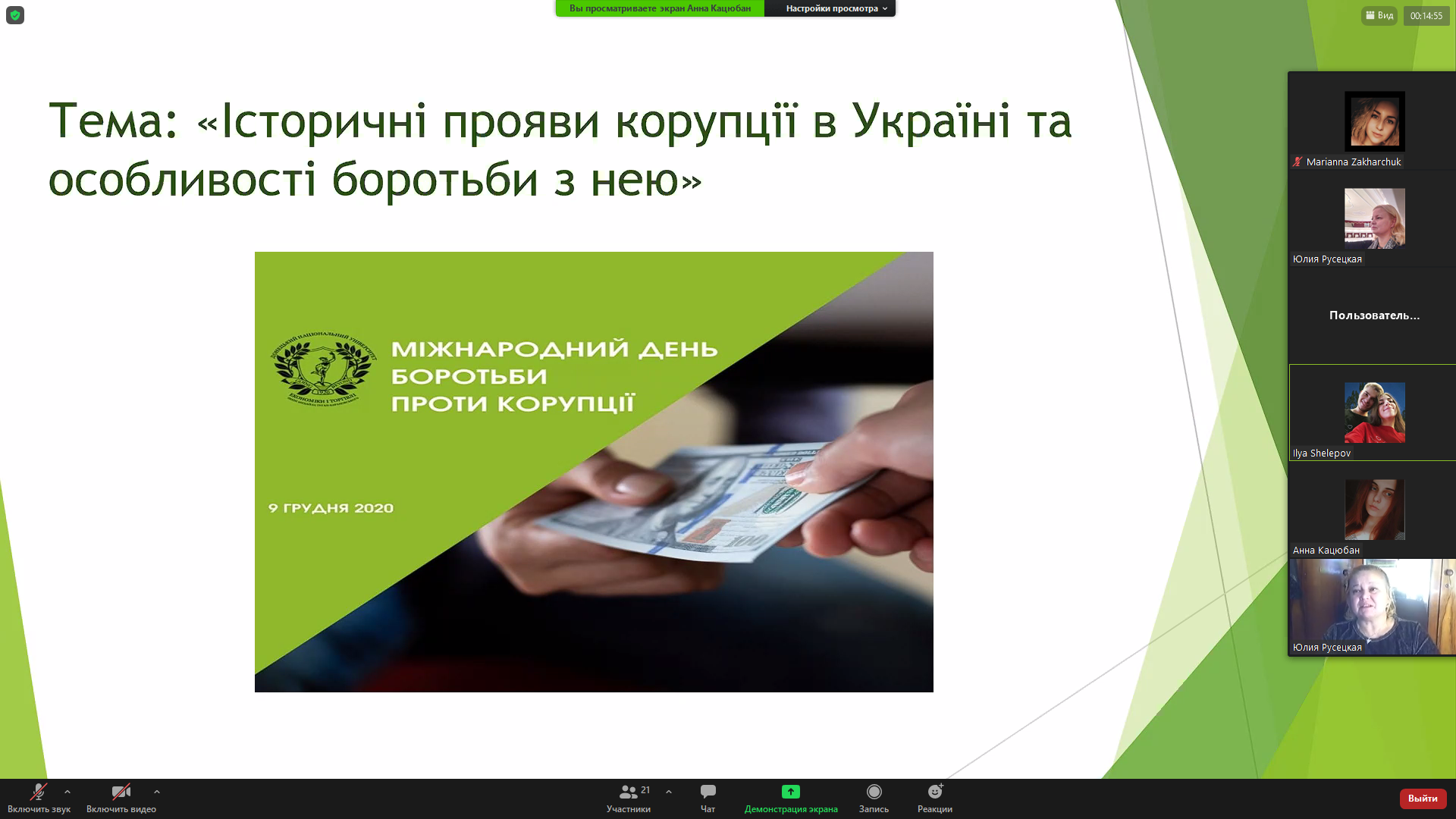 Сьогодні, 7 грудня 2020 року, у Відокремленому структурному підрозділі «Фаховому коледжі Миколаївського національного університету імені В.О.Сухомлинського» обговорювали цю тему на правовому онлайн-лекторії-диспуті студенти спеціальності «Право» під керівництвом викладача вищої категорії правових дисциплін Русецької Ю.Л. На таких заходах захоплює обізнаність і активність студентів з цієї тематики, їх пропозиції та рекомендації щодо поліпшення ситуації з корупцією в Україні.