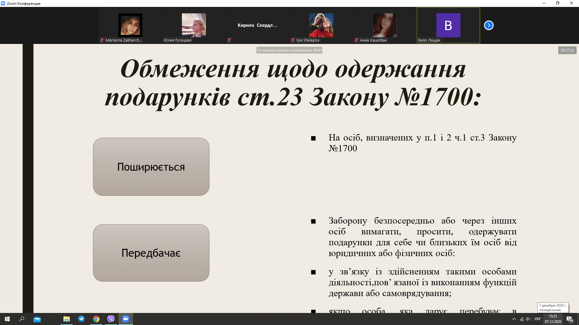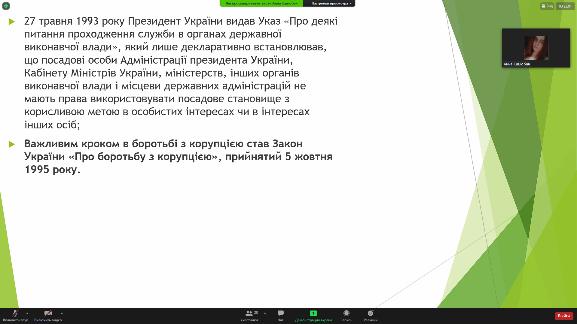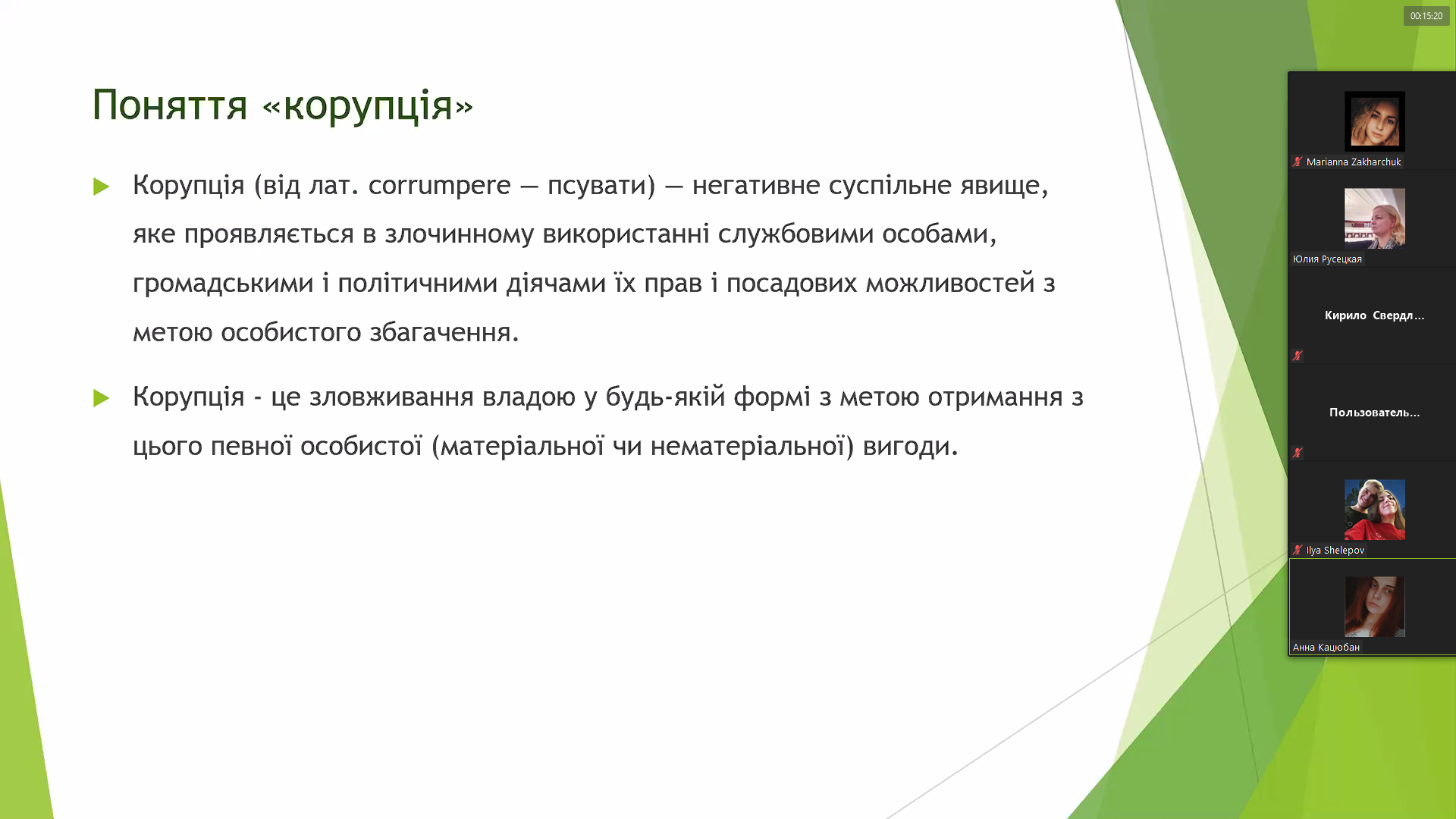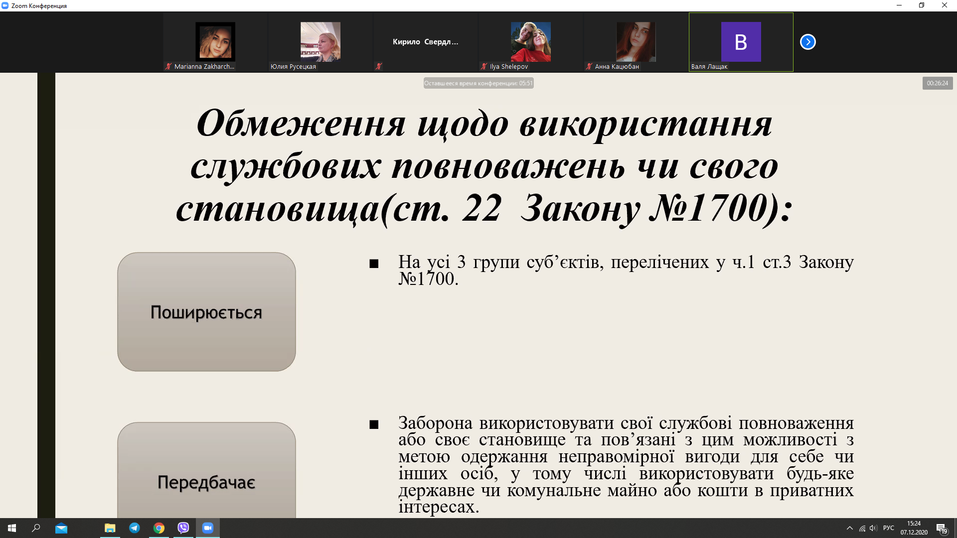 Сьогодні, 7 грудня 2020 року, у Відокремленому структурному підрозділі «Фаховому коледжі Миколаївського національного університету імені В.О.Сухомлинського» обговорювали цю тему на правовому онлайн-лекторії-диспуті студенти спеціальності «Право» під керівництвом викладача вищої категорії правових дисциплін Русецької Ю.Л. На таких заходах захоплює обізнаність і активність студентів з цієї тематики, їх пропозиції та рекомендації щодо поліпшення ситуації з корупцією в Україні.