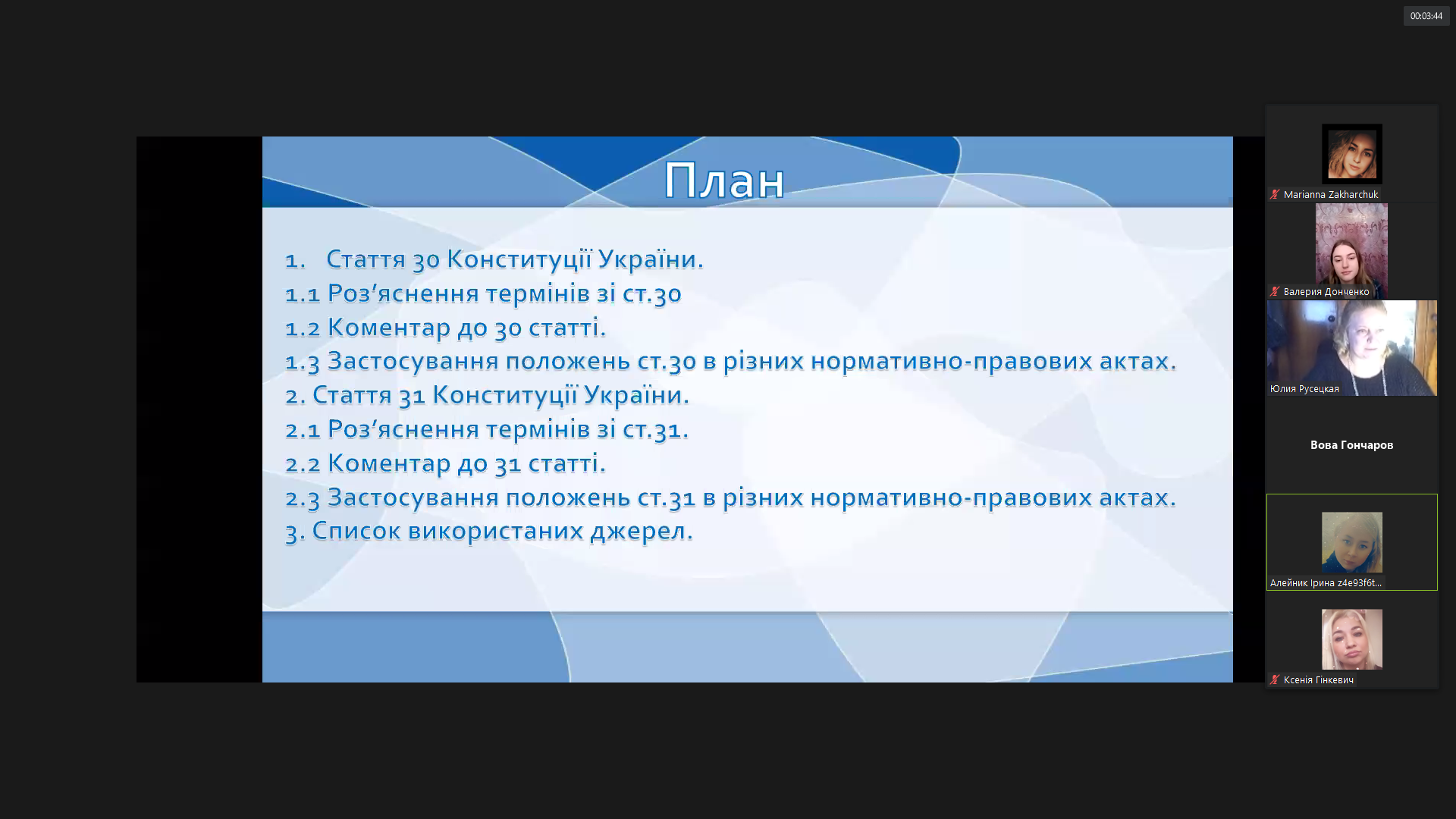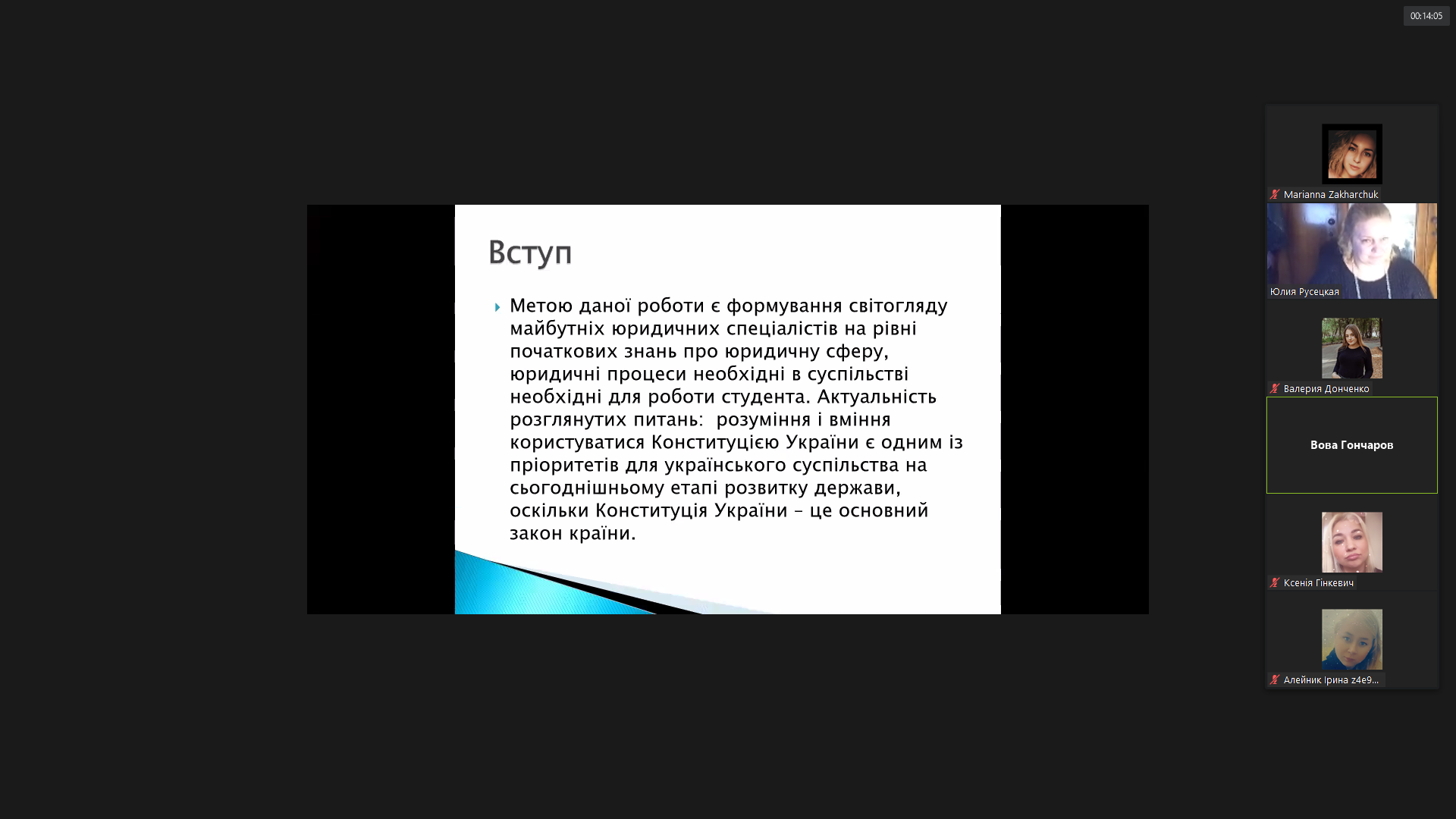 Метою круглого столу було: розглянути та дослідити основні положення другого розділу Конституції України, який закріплює систему прав, свобод і обов’язків, що поділяється на особисті (природні, громадянські), політичні, соціальні, економічні, культурні, екологічні та сімейні права і обов’язки. Сукупність конституційних норм, що закріплюють ці права і обов’язки визначає конституційно правовий статус людини і громадянина.