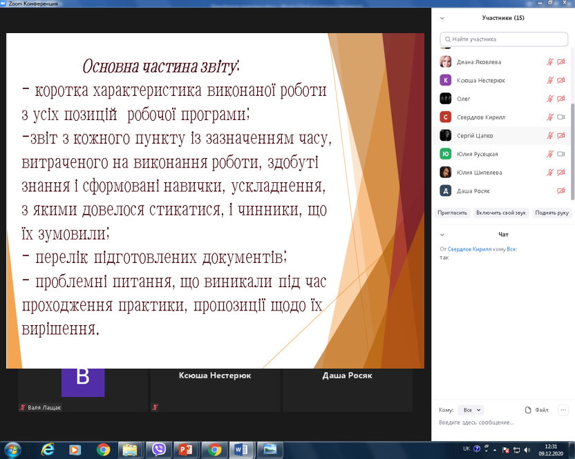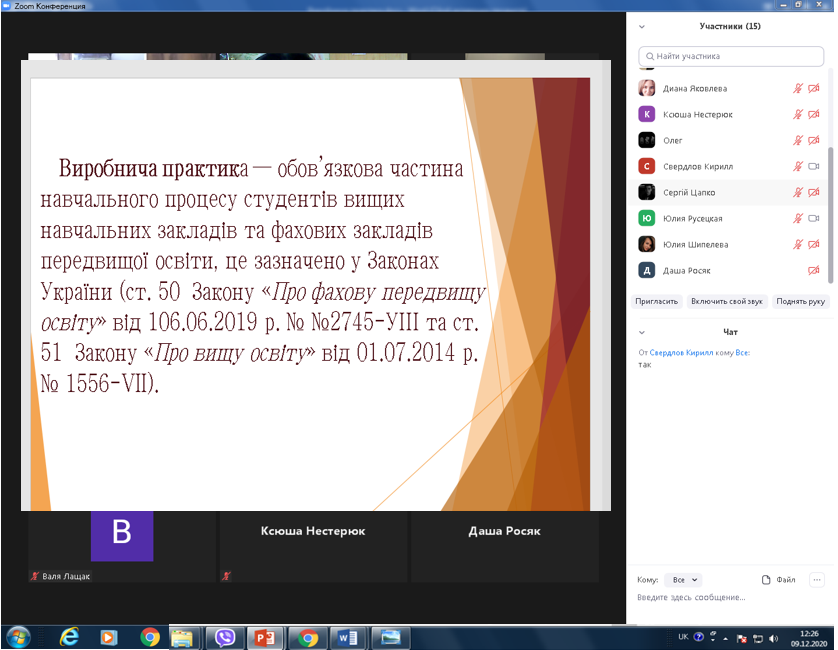 Онлайн-зустріч розпочала Олена Олексіївна Царенко, директор фахового коледжу, кандидат політичних наук, керівник виробничої практики від коледжу, яка ознайомила учасників з особливостями проходження виробничої практики в умовах карантину, вимогами до проходження виробничої практики, порядку її проходження, формування звітної документації та термінах її проходження.
