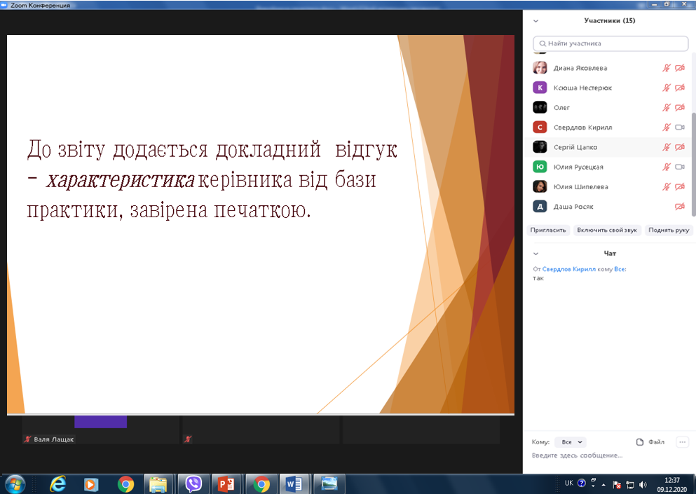 Олена Миколаївна Сахарова, провідний фахівець коледжу, зазначила, що після закінчення виробничої практики студент(ка) складає залік (захищає звіт) з оцінкою, що диференціюється, викладачу – керівнику практики від коледжу під час підсумкової онлайн-конференції.