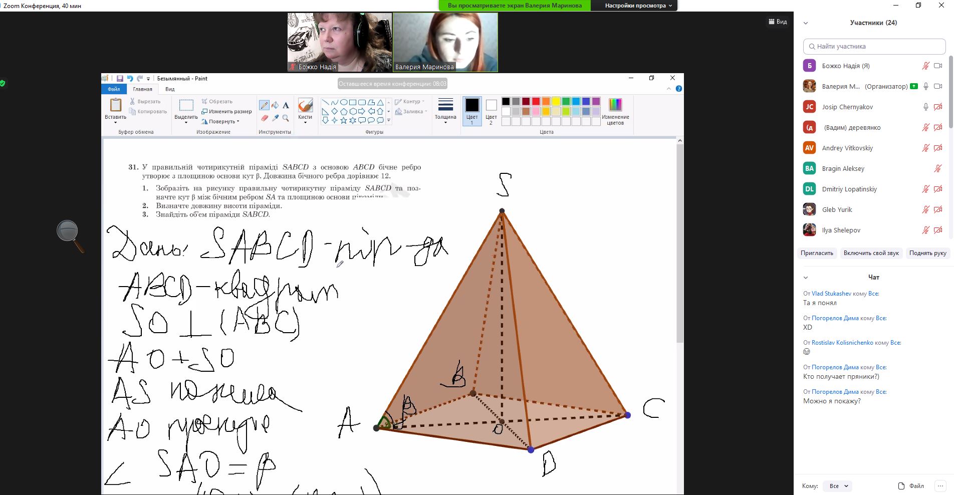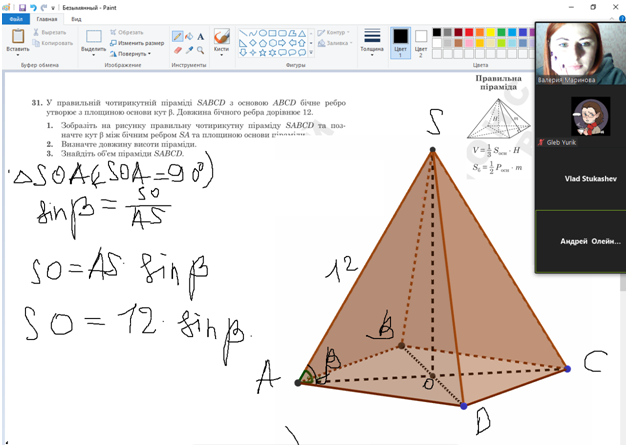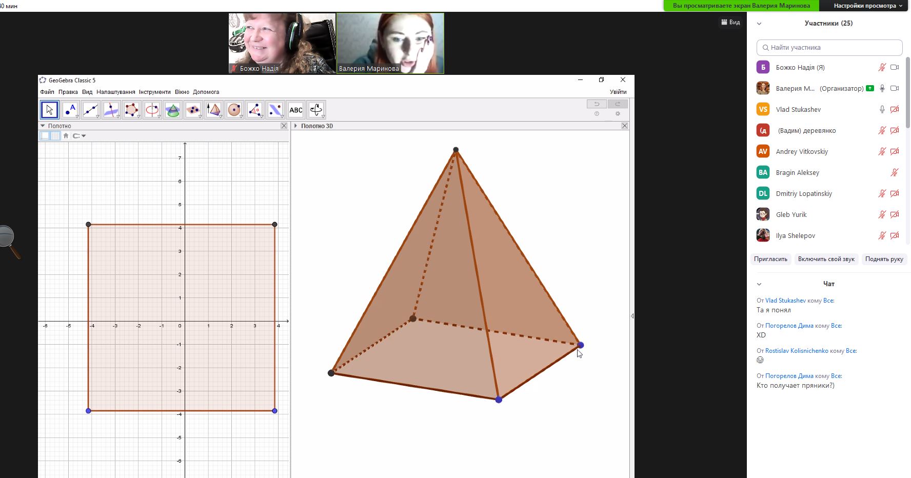 В рамках дистанційної освіти викладачі нашого коледжу завжди підвищують рівень своїх навичок та компетенцій, щоб навчання в умовах сьогодення не ускладнювало, а полегшувало опанування таких фундаментальних тем студентами. За допомогою програми GeoGebra студенти, разом з викладачем математики МАРІНОВОЮ ВАЛЕРІЄЮ ВІТАЛІЇВНОЮ, розібрали завдання третьої частини ЗНО та розвитку просторової уяви. Просторове мислення — вид розумової дiяльностi, що забезпечує створення просторових образiв i оперування ними в процесi розв’язання рiзних практичних i теоретичних задач. Робота з подібними програмами. Крiм позитивного впливу на засвоєння курсу математики, сприяє пiдвищенню ефективностi заняття.