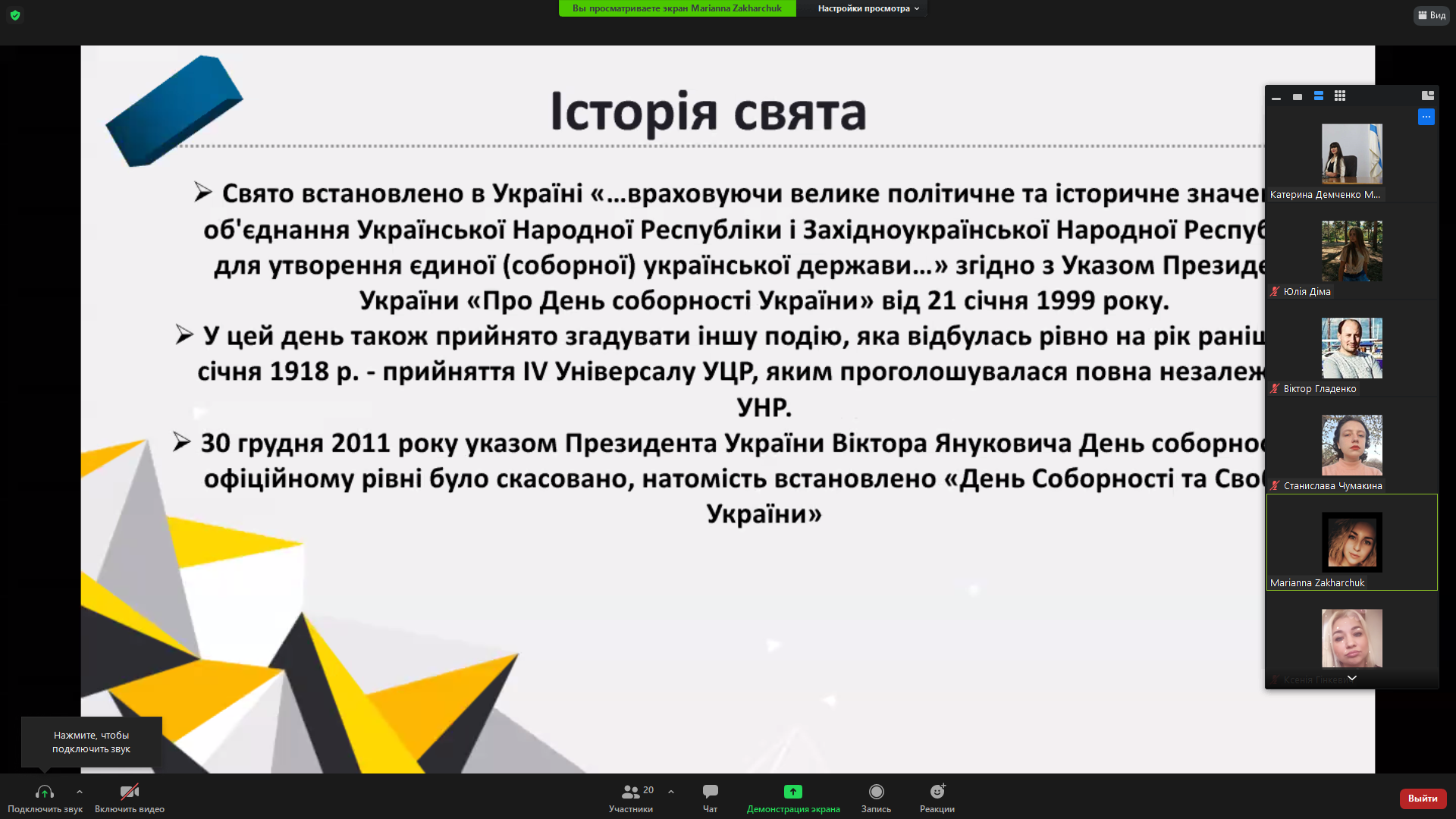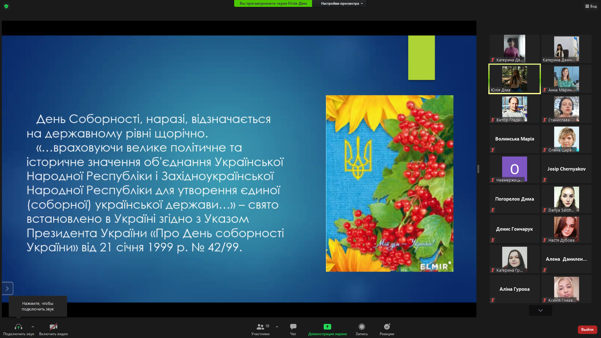 22 січня 1919 року на Софійській площі у Києві відбулося офіційне проголошення Акта Злуки: «Однині во єдино зливаються століттям одірвані одна від одної частини єдиної України – Західно-Українська Народня Республіка (Галичина, Буковина, і Угорська Україна) і Наддніпрянська Велика Україна. Здійснились віковічні мрії, якими жили і за які умирали кращі сини України. Однині є єдина незалежна Українська Народня республіка», – йшлося в Універсалі Директорії УНР. Наступного дня Всеукраїнський Трудовий Конгрес офіційно затвердив об’єднання західно- та східноукраїнських земель в одній державі.