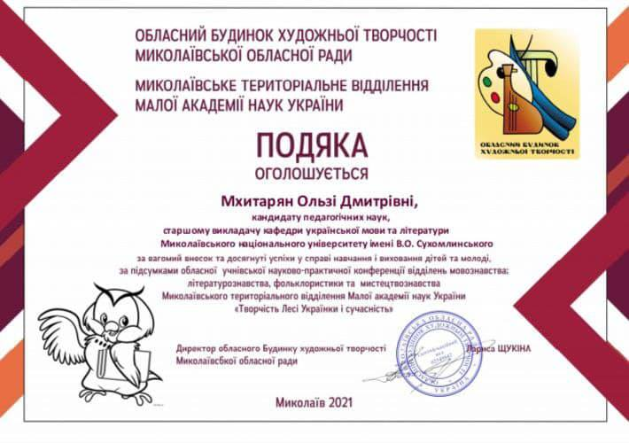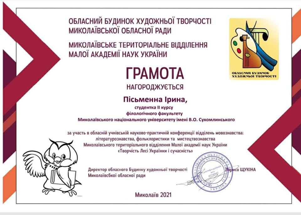 23 січня 2021 року студентки 216 групи Анастасія Єрмак та Ірина Пісьменна під керівництвом старшого викладача О. Д.Мхитарян взяли участь у VІІ обласній науково-практичній онлайн-конференції «Творчість Лесі Українки і сучасність», приуроченої 150-й річниці з дня народження видатної української поетеси, драматургині та перекладачки.