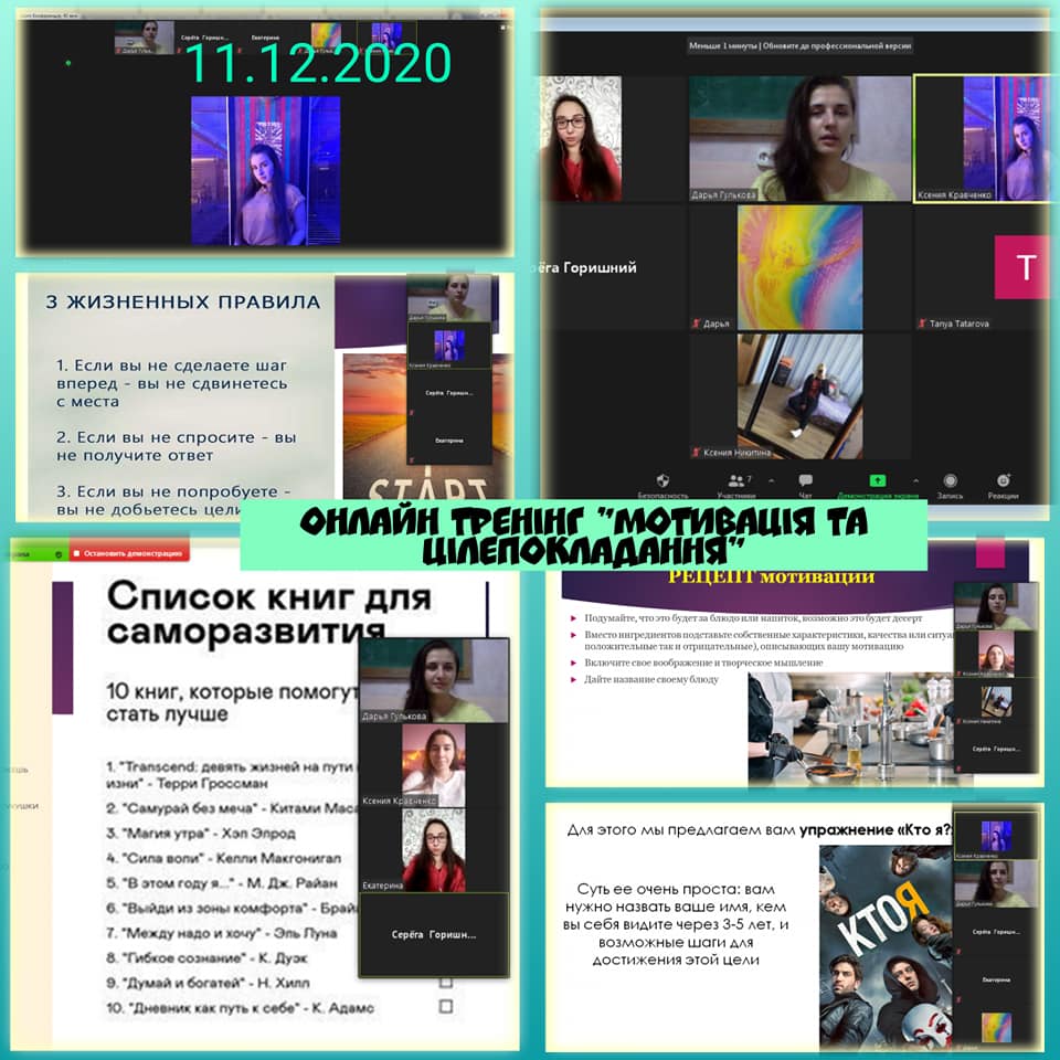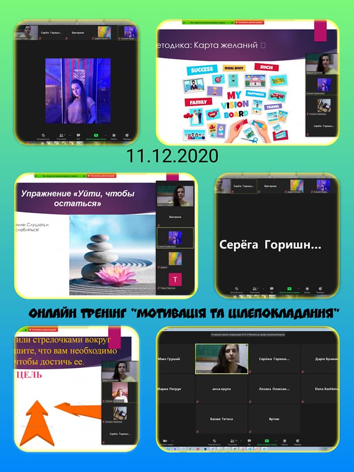 11 грудня 2020 року був проведений онлайн-тренінг на тему «Цілепокладання та мотивація» для студентів 1, 2 та 3 курсів факультету педагогіки та психології спеціальності «Психологія», «Музичне мистецтво», 3 курсу спеціальності «Спеціальна освіта. Хімія та біологія» факультету фізичної культури і спорту.