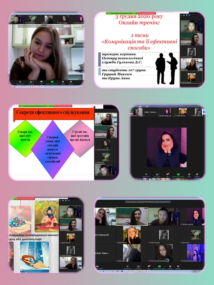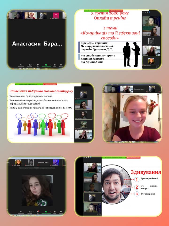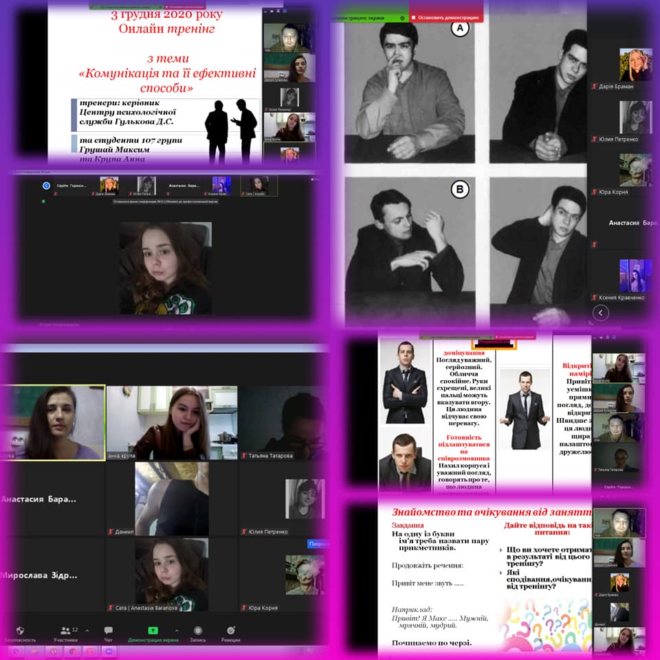 2 грудня 2020 року для студентів 267 групи факультету педагогіки та психології спеціальності «Логопедія» та 107, 317 групи спеціальності «Психологія» був проведений онлайн-тренінг «Ефективні навички комунікації».