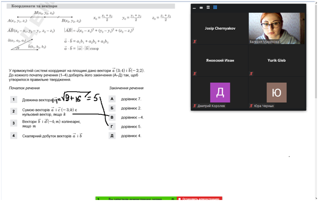 Викладацький склад Відокремленого структурного підрозділу «Фахового коледжу Миколаївського національного університету імені В.О.Сухомлинського» піклується про успішну здачу ДПА у формі ЗНО нашими студентами. І тому, вже доброю традицією є проведення предметних майстер-класів з підготовки до зовнішнього незалежного оцінювання знань студентів (ЗНО). Тож, 16 лютого 2021 року відбувся черговий майстер-клас з математики «Успішна підготовка до ЗНО. Вектори та координати в просторі», де викладач математики МАРІНОВА ВАЛЕРІЯ ВІТАЛІЇВНА разом зі студентами І та ІІ курсів розглянула основні проблеми завдань з даної теми. Під час заходу розв’язували завдання минулих років та акцентували увагу на методі виключення варіантів у тестових завданнях.