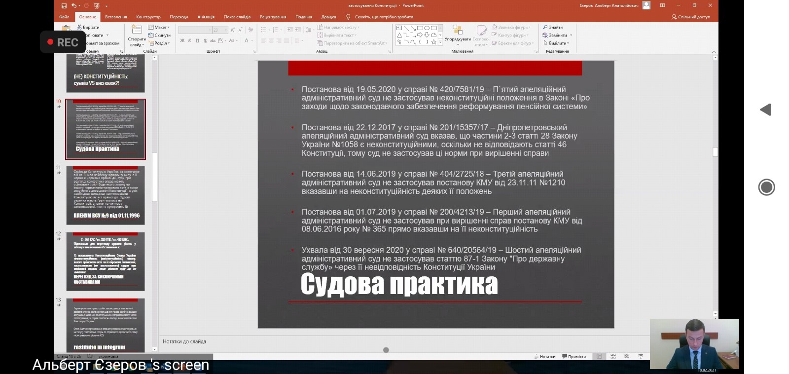 18 лютого 2021 року студенти-правники Відокремленого структурного підрозділу «Фахового коледжу Миколаївського національного університету імені В.О.Сухомлинського» разом з викладачами долучились до чергової онлайн-зустрічі із серії вебінарів, присвячених обговоренню останньої практики Верховного Суду. Тематика цієї зустрічі: «Застосування Конституції України під час здійснення адміністративного судочинства».
