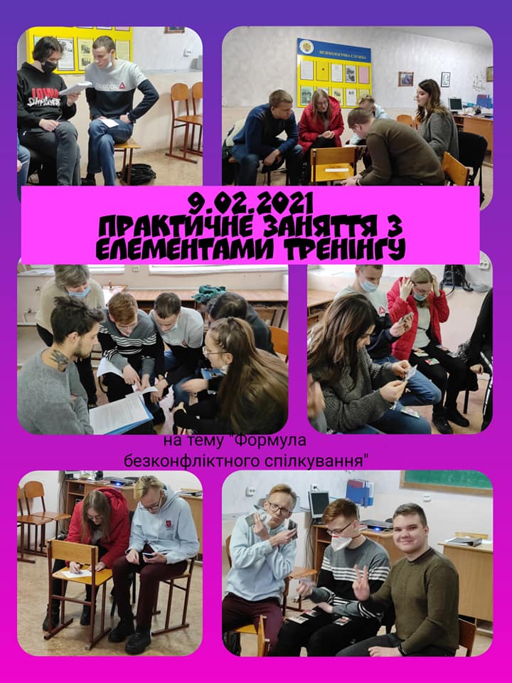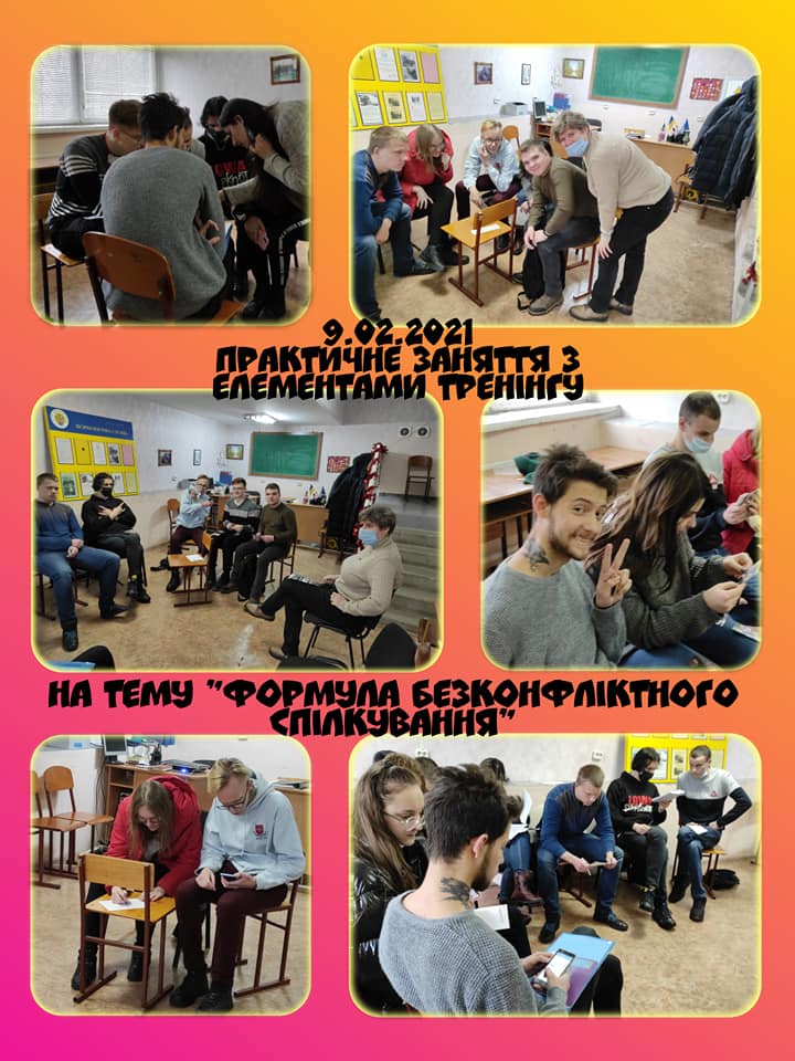 9 та 10 лютого 2021 року в рамках Центру психологічної служби продовжується цикл тренінгових занять. Тема другої зустрічі «Формула безконфліктного спілкування» зі студентами 218-К групи спеціальності «Початкова освіта» факультету педагогічної та соціальної освіти та 262 групи спеціальності «Комп’ютерна інженерія» механіко-математичного факультету та 217 групи спеціальності «Психологія» факультету педагогіки та психології .