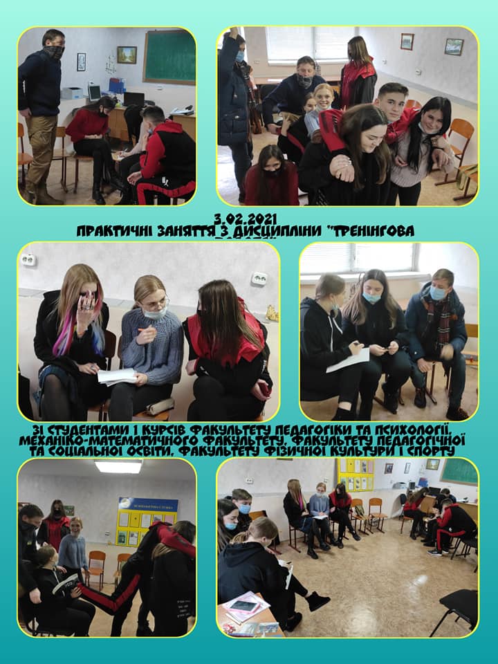 3 лютого 2021 року для студентів 1 курсів механіко-математичного факультету, факультету соціальної та педагогічної освіти, факультету фізичної культури і спорту, факультету педагогіки та психології розпочалися практичні заняття з дисципліни «Тренінгова робота».
