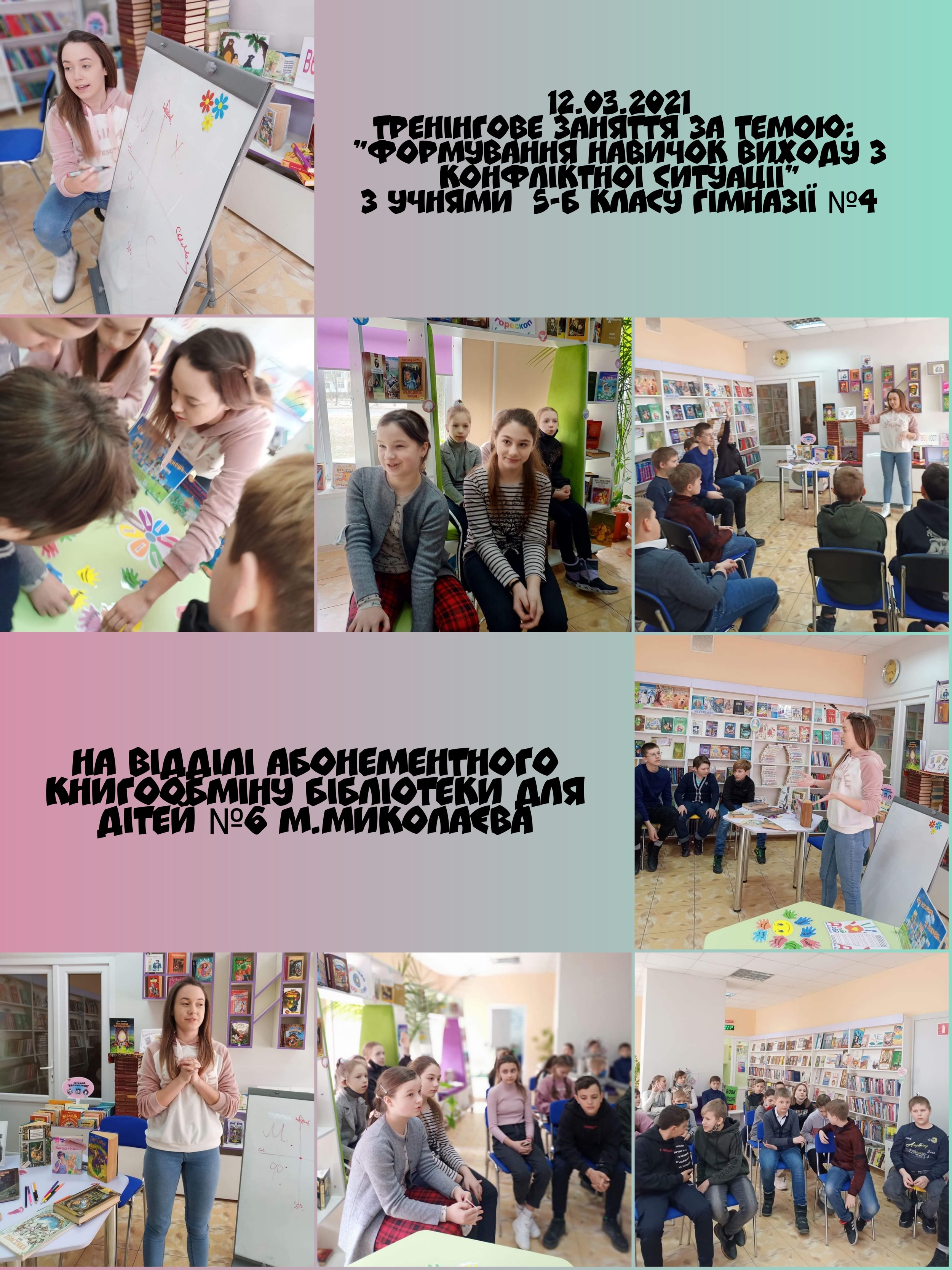 12 березня 2021 року у відділі абонементного книгообміну бібліотеки для дітей №6 м. Миколаєва, спільно з партенерами Миколаївського національного університету імені В. О. Сухомлинського, кафедри психології та соціальних наук відбулось тренінгове заняття за темою: «Формування навичок виходу з конфліктної ситуації».