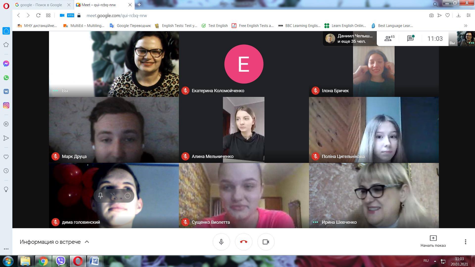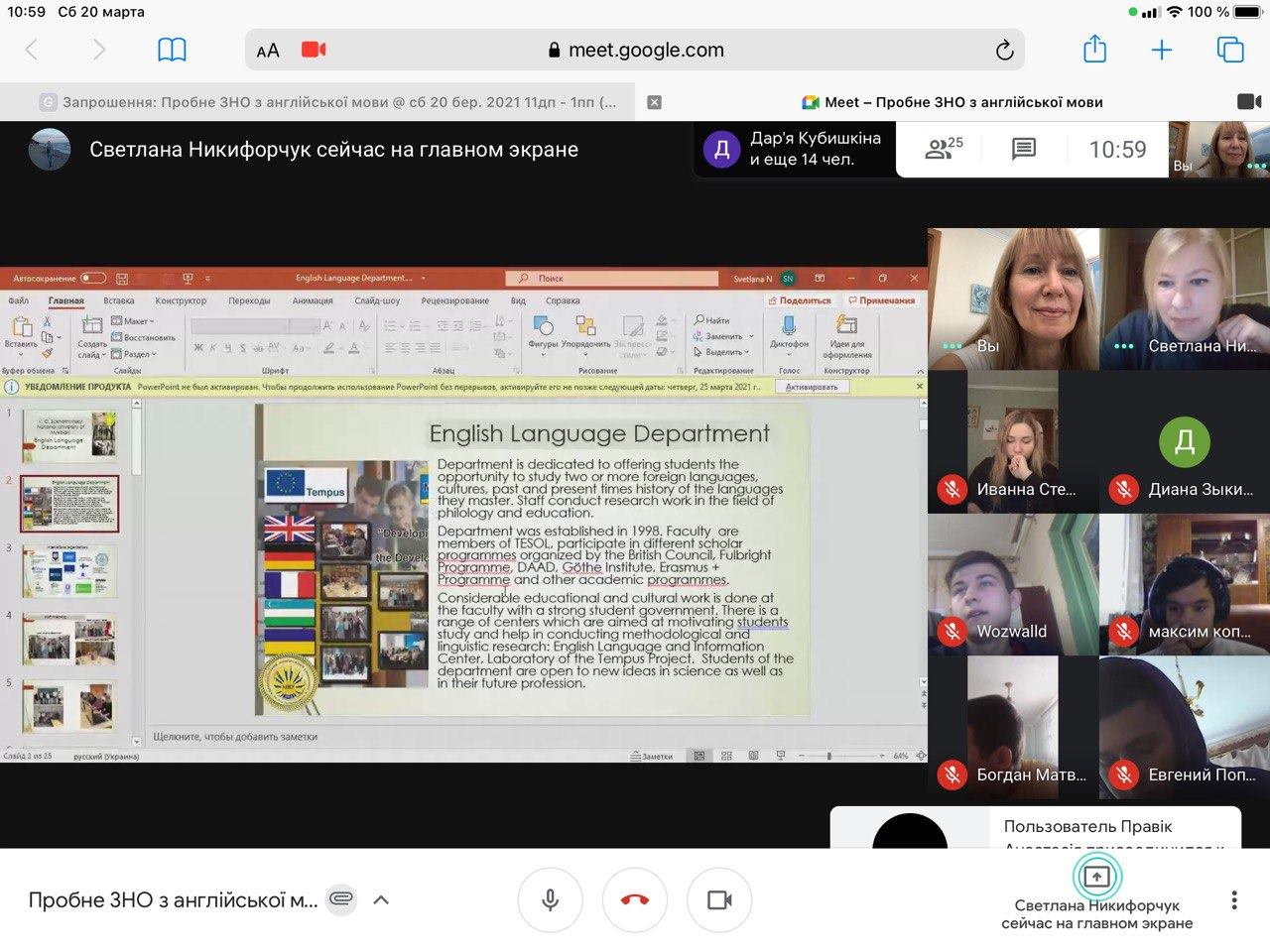 20 березня 2021 року викладачі кафедри англійської мови і літератури філологічного факультету МНУ імені В.О. Сухомлинського провели онлайн пробне ЗНО з англійської мови для старшокласників міста Миколаєва і Миколаївської області. У заході взяли участь понад 80 осіб. Майбутнім абітурієнтам необхідно було виконати 3 види завдань: завдання з аудіювання, лексико-граматичне і письмове завдання. Кожний учень мав можливість перевірити свої знання, виявити прогалини, поставити запитання викладачам, які проводили іспит, і одержати поради щодо покращення підготовки до ЗНО з англійської мови. Пробне ЗНО з англійської мови було підготовлено і проведено к.п.н., доц. Добровольскою Л.С., к.п.н., ст.викладачем Шевченко І.В., к.п.н., ст. викладачем Щербаковою О.Л. і викладачем Нікіфорчук С.С. Нагадуємо, що консультація щодо виконаних завдань з письма відбудеться 27 березня о 9.30. Чергове заняття на онлайн курсах по підготовкі до ЗНО з англійської мови відбудеться 10 квітня об 11.00. Приєднуйтесь! Чекаємо на Вас!