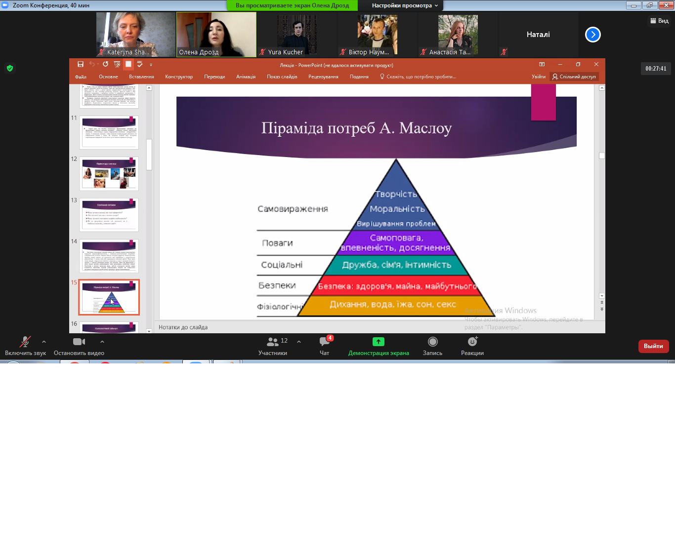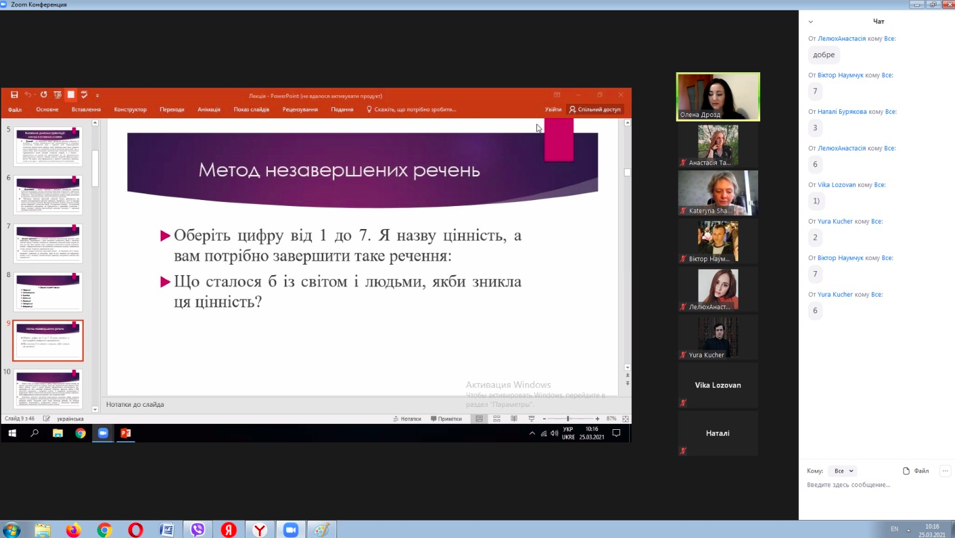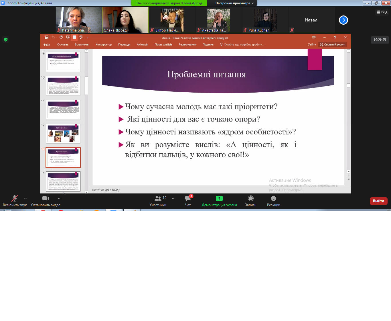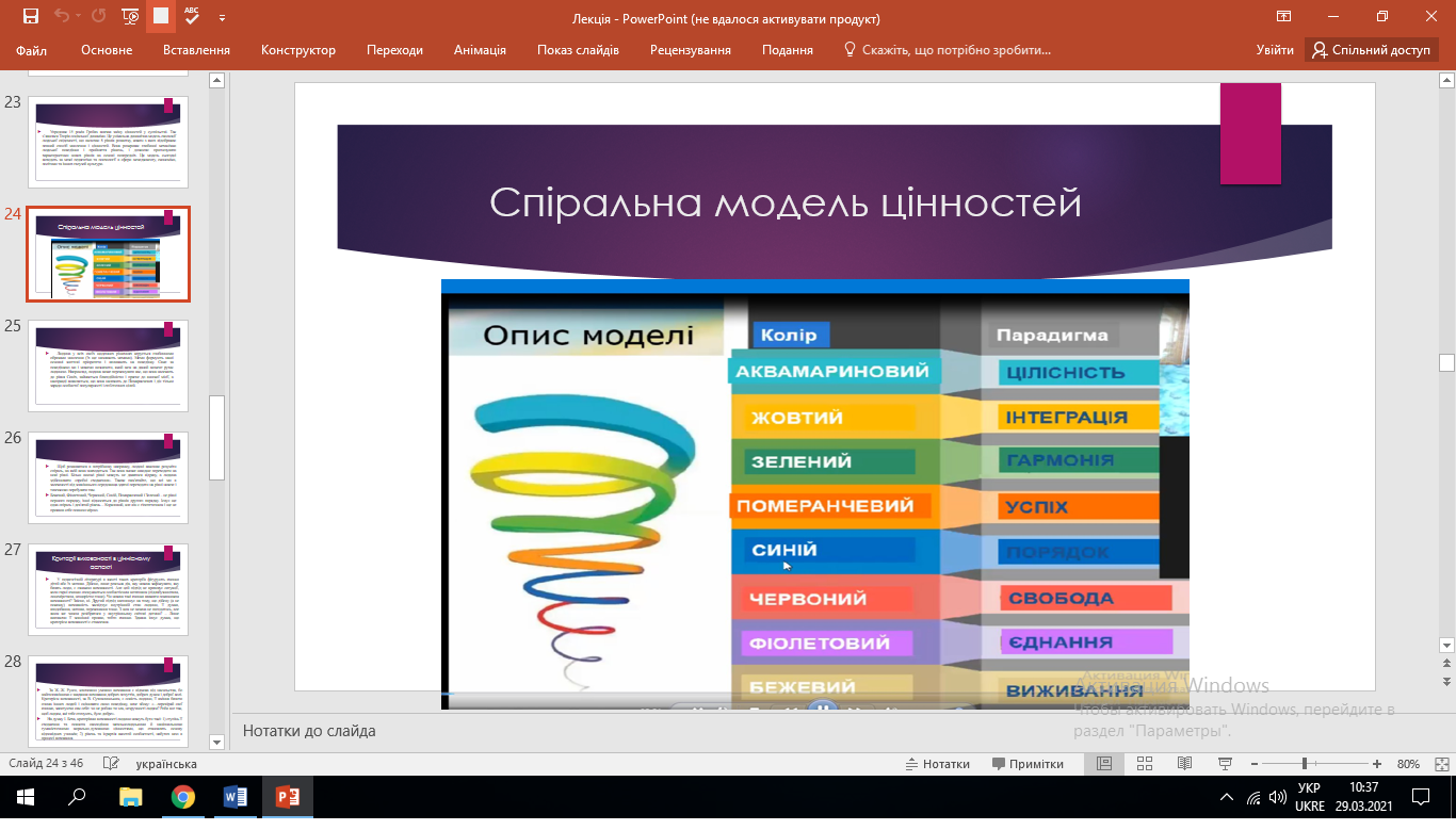 Неоднозначні думки і судження у студентів викликало знайомство зі «Спіральною моделлю цінностей» Клера Грейвза, зацікавив присутніх метод незавершених речень, прикрасили зміст лекції цитати видатних людей і поезія Ліни Костенко.