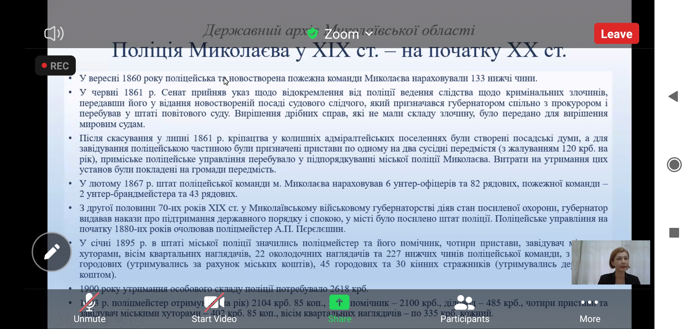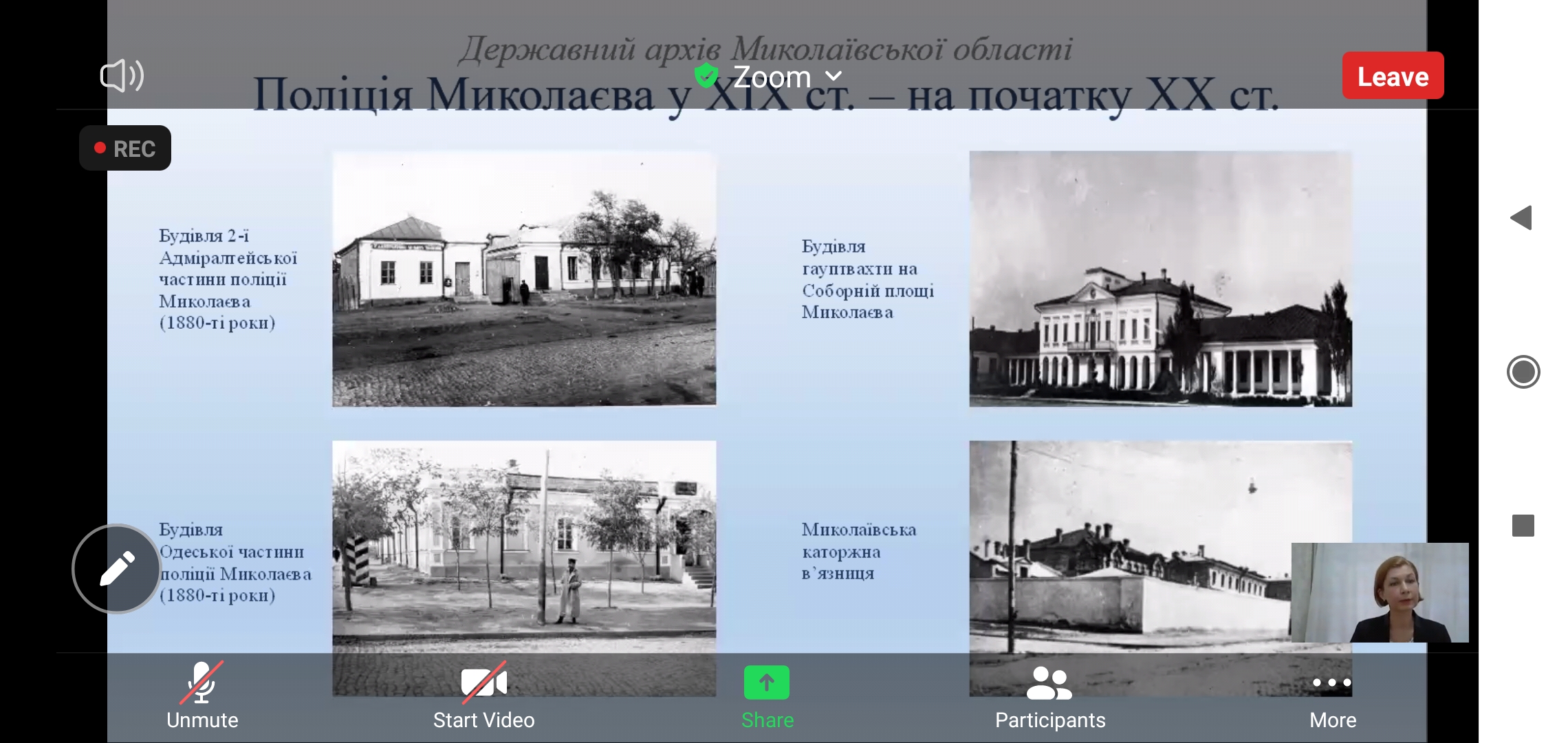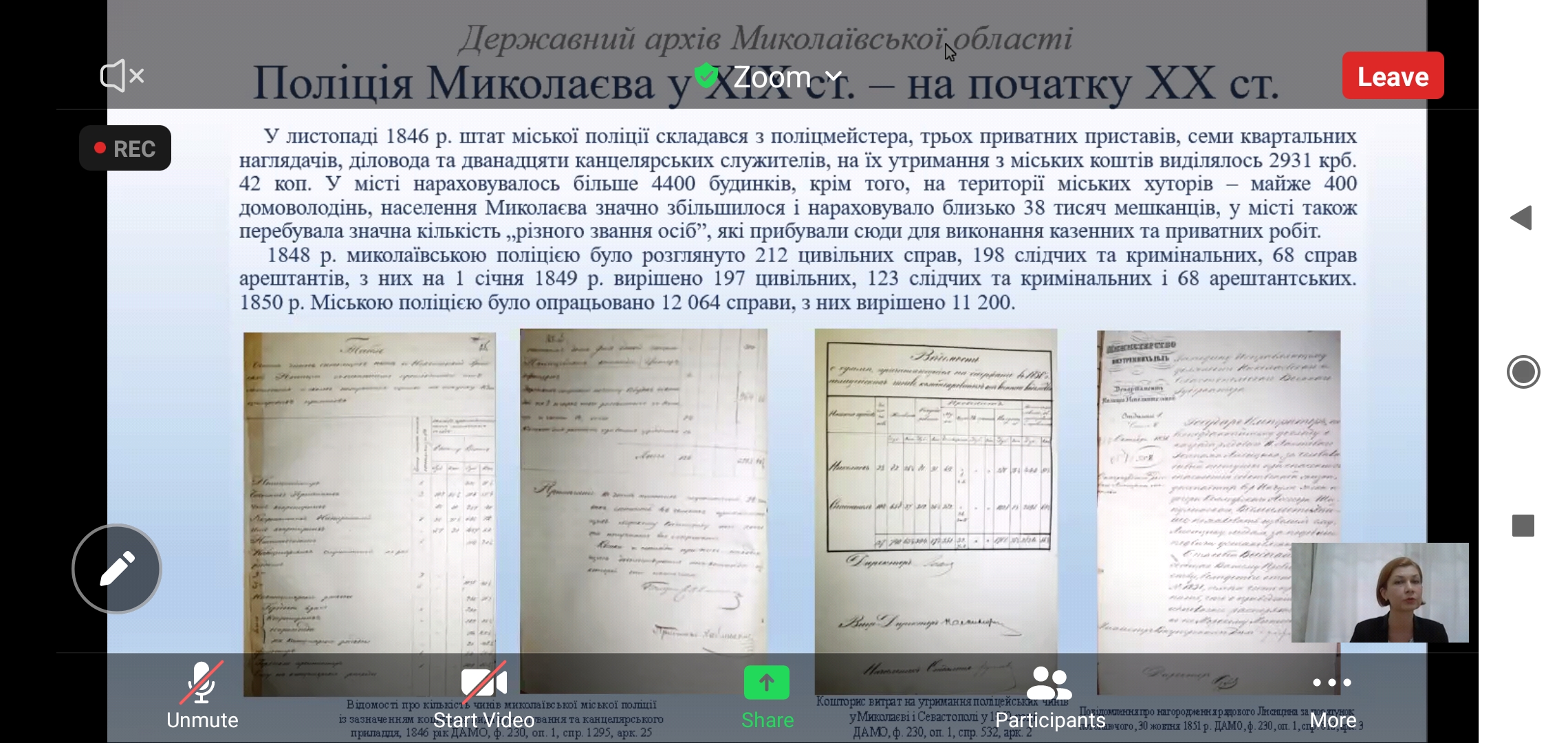 Начальник відділу інформації та використання документів державного архіву Миколаївської області Мельник Марина розповіла учасникам заходу про становлення органів поліції у Миколаєві. Увага присутніх була акцентована на унікальних архівних документах з історії розвитку окремих служб та підрозділів правоохоронних органів Миколаївщини у зазначений період.