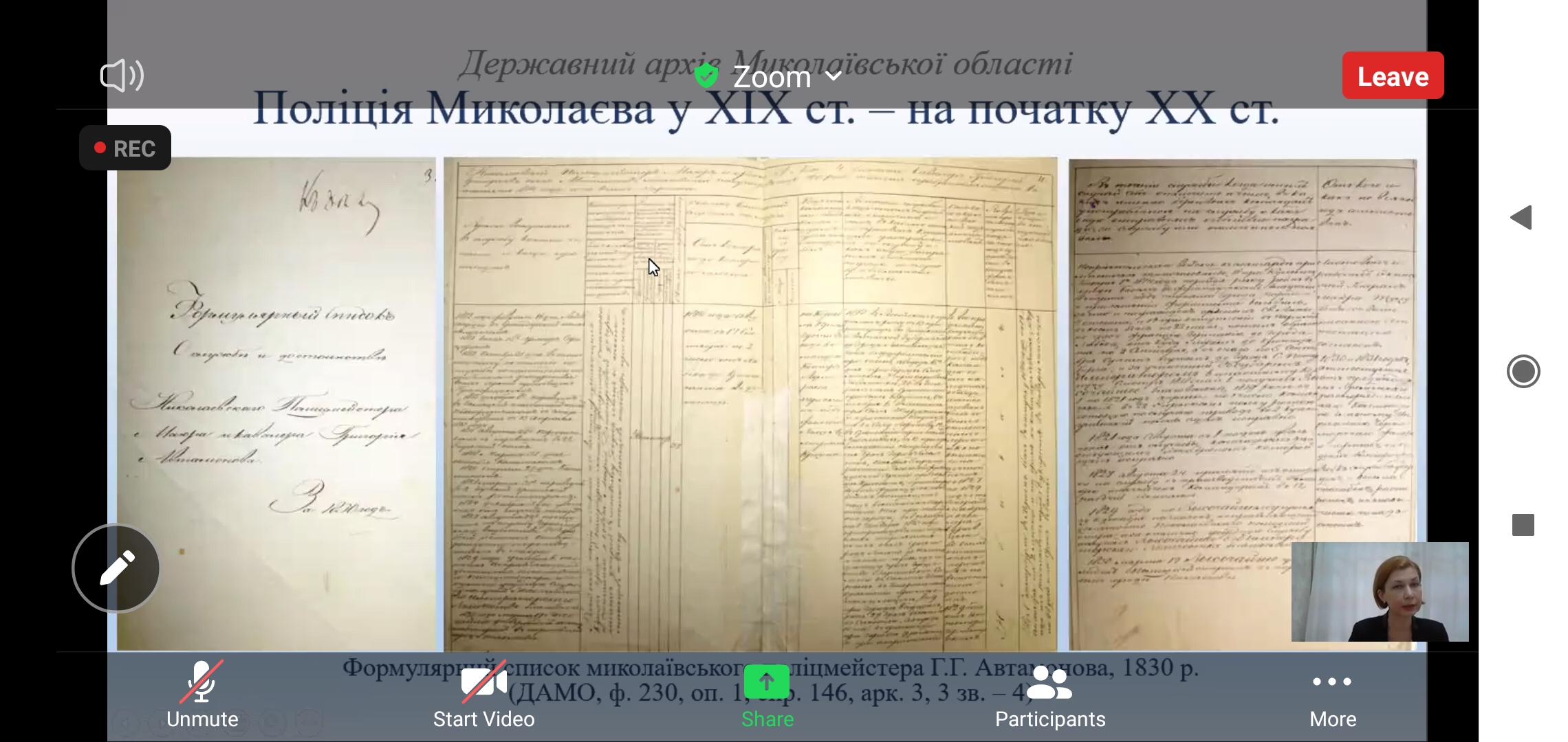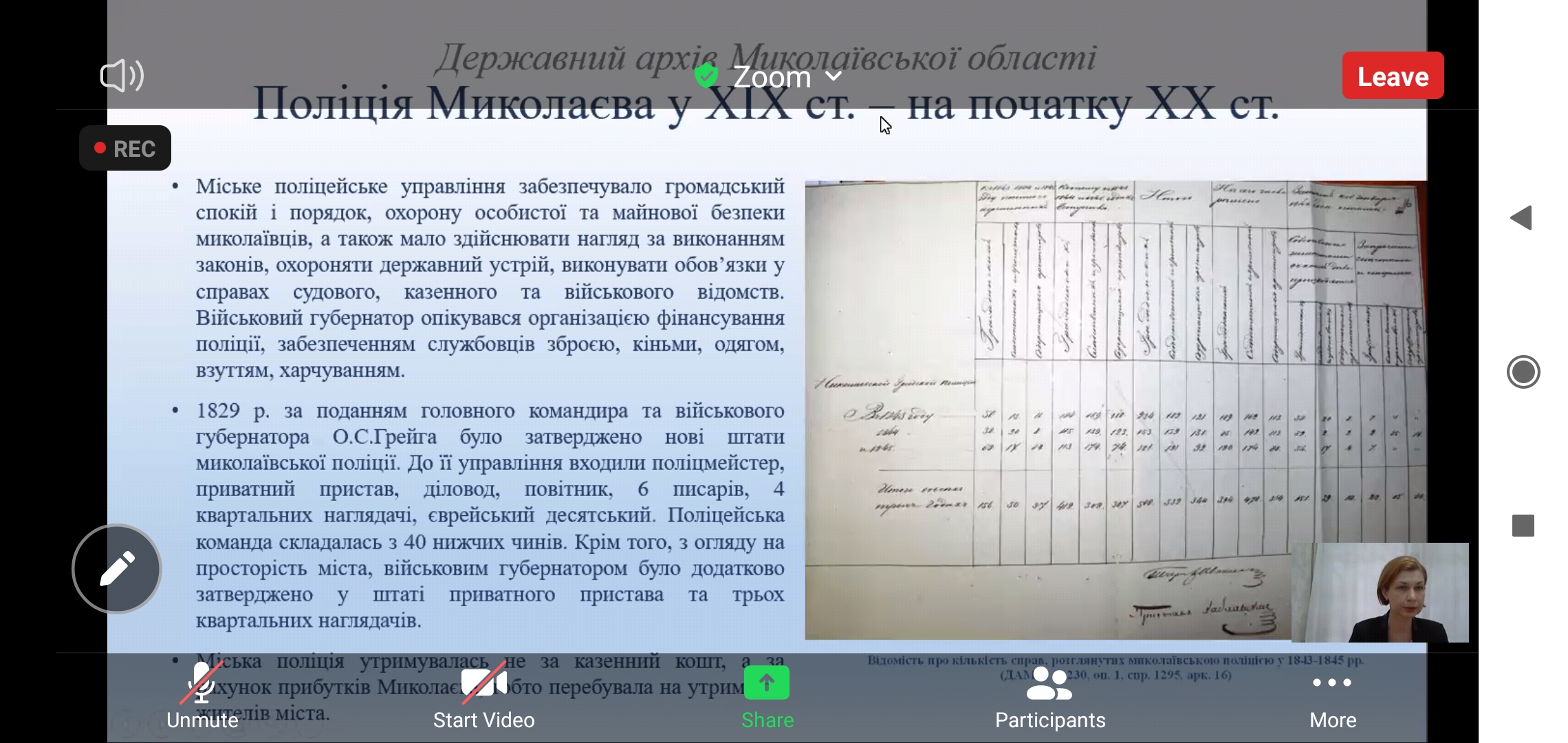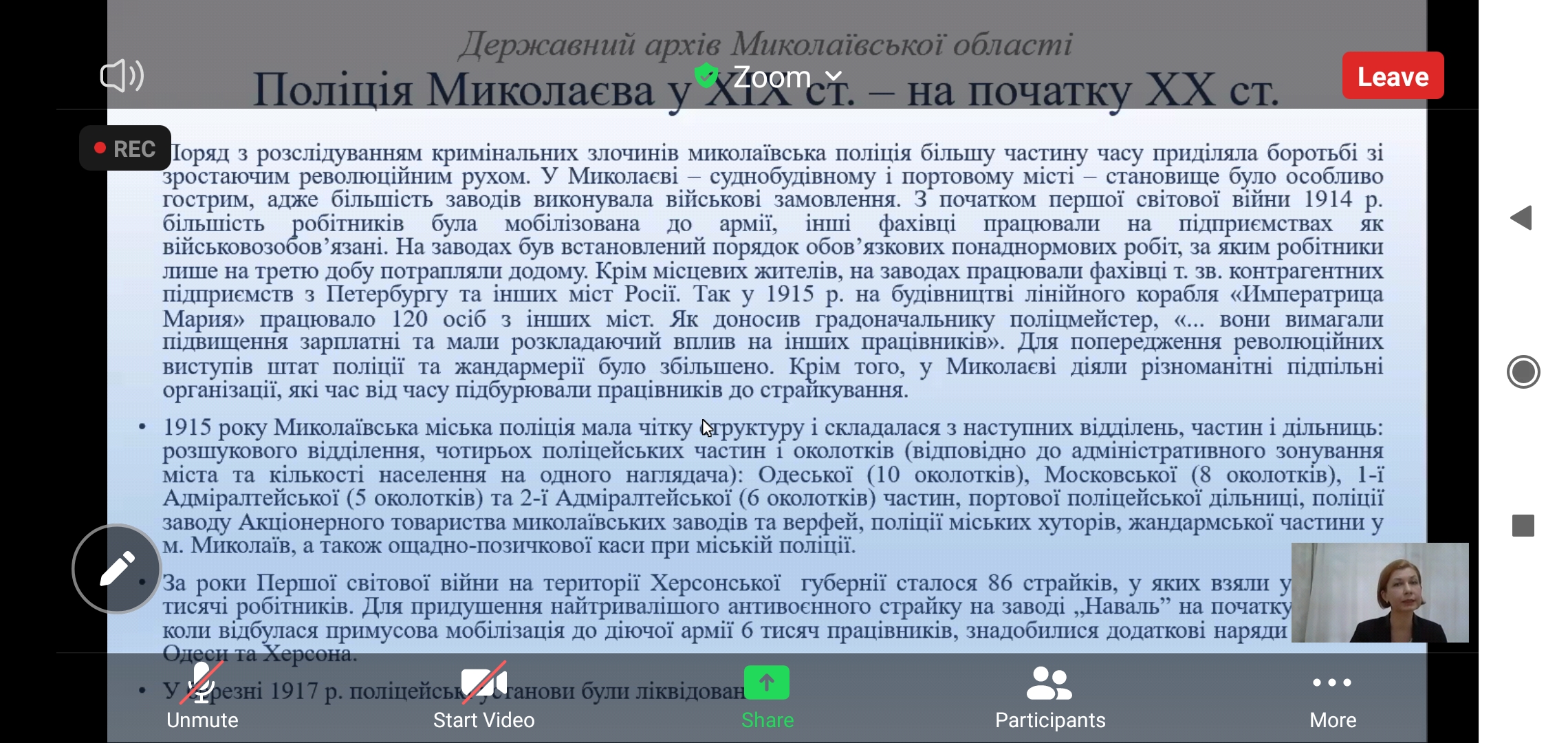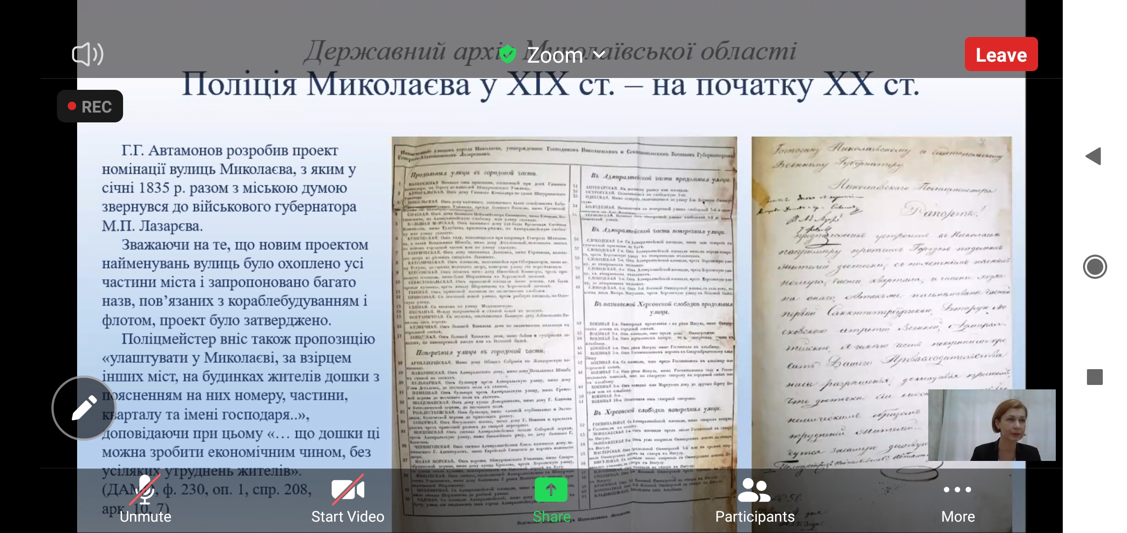 Начальник відділу інформації та використання документів державного архіву Миколаївської області Мельник Марина розповіла учасникам заходу про становлення органів поліції у Миколаєві. Увага присутніх була акцентована на унікальних архівних документах з історії розвитку окремих служб та підрозділів правоохоронних органів Миколаївщини у зазначений період.