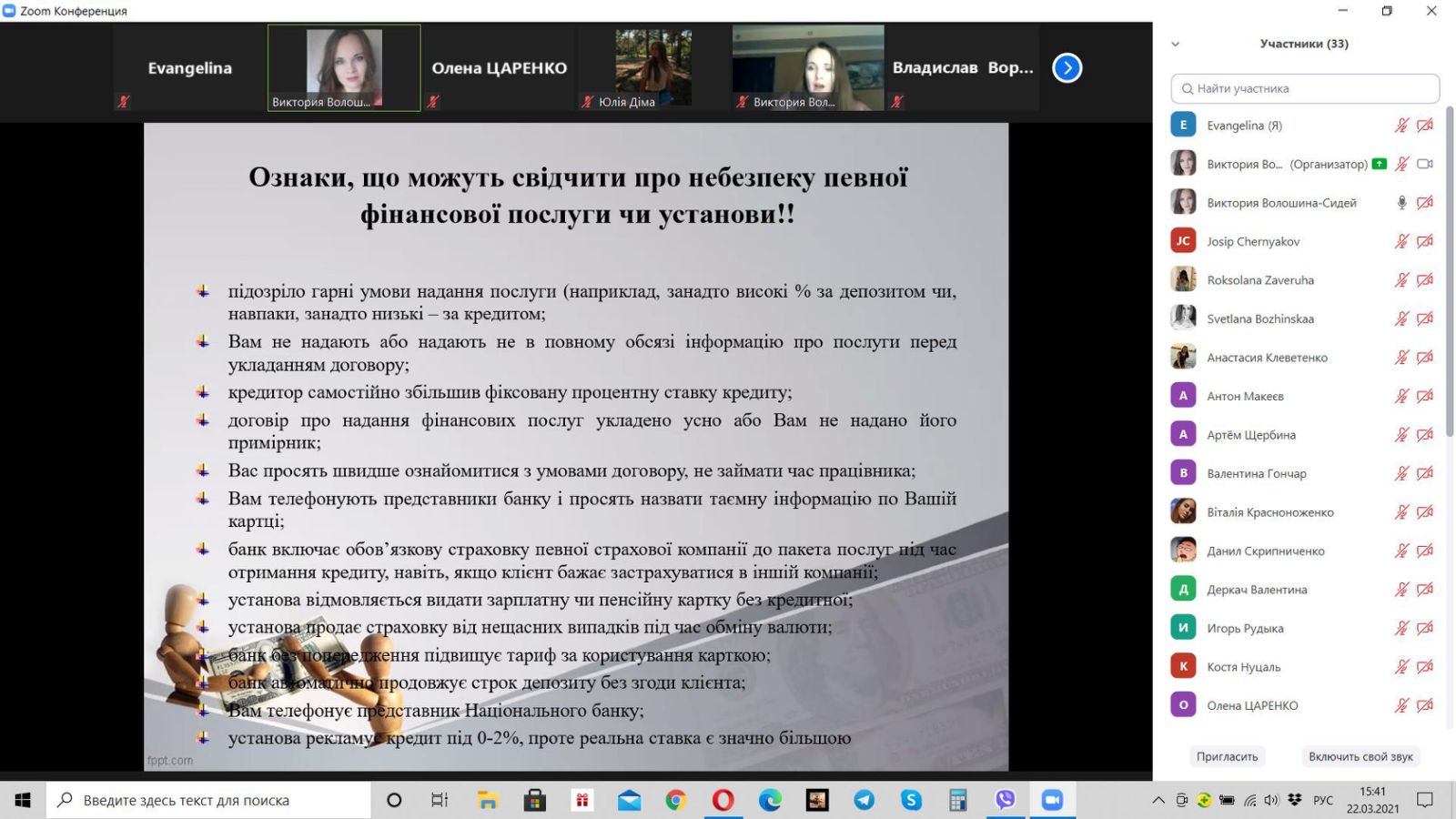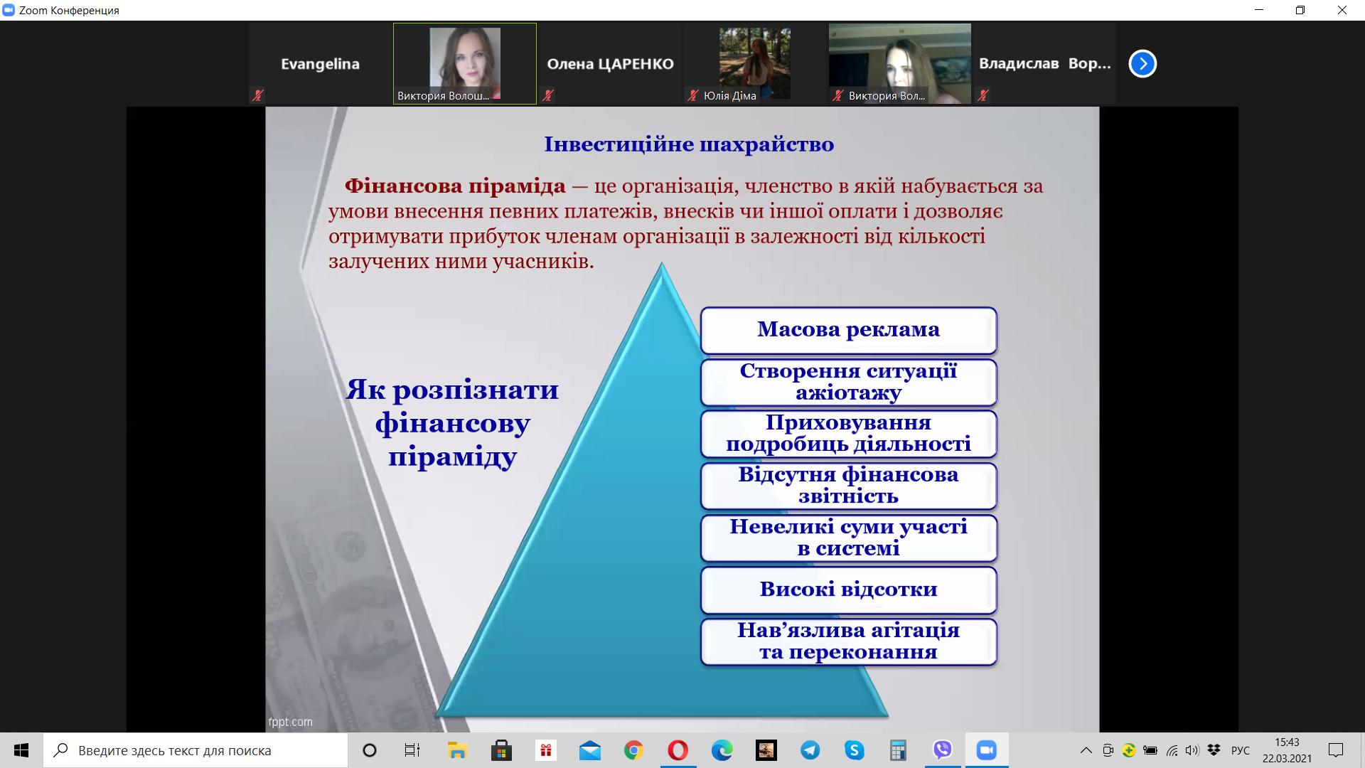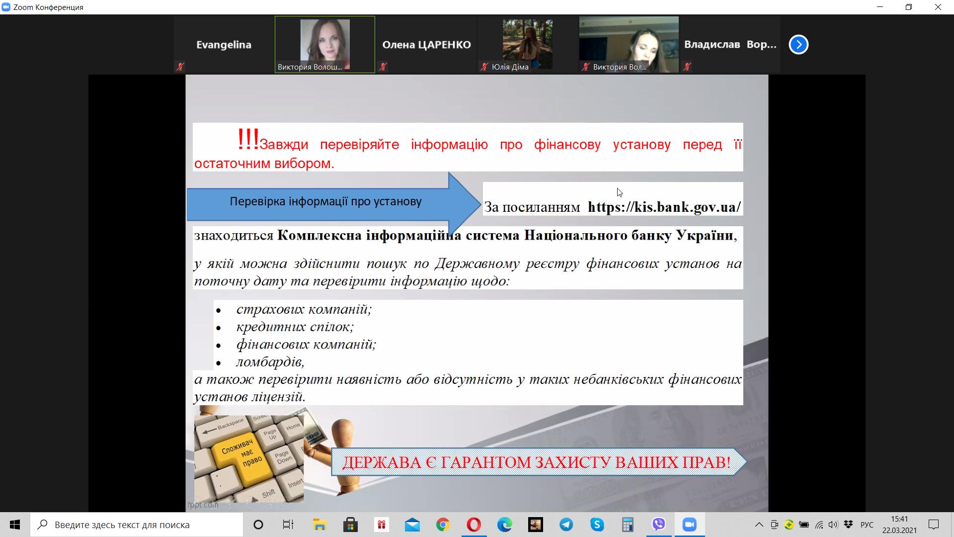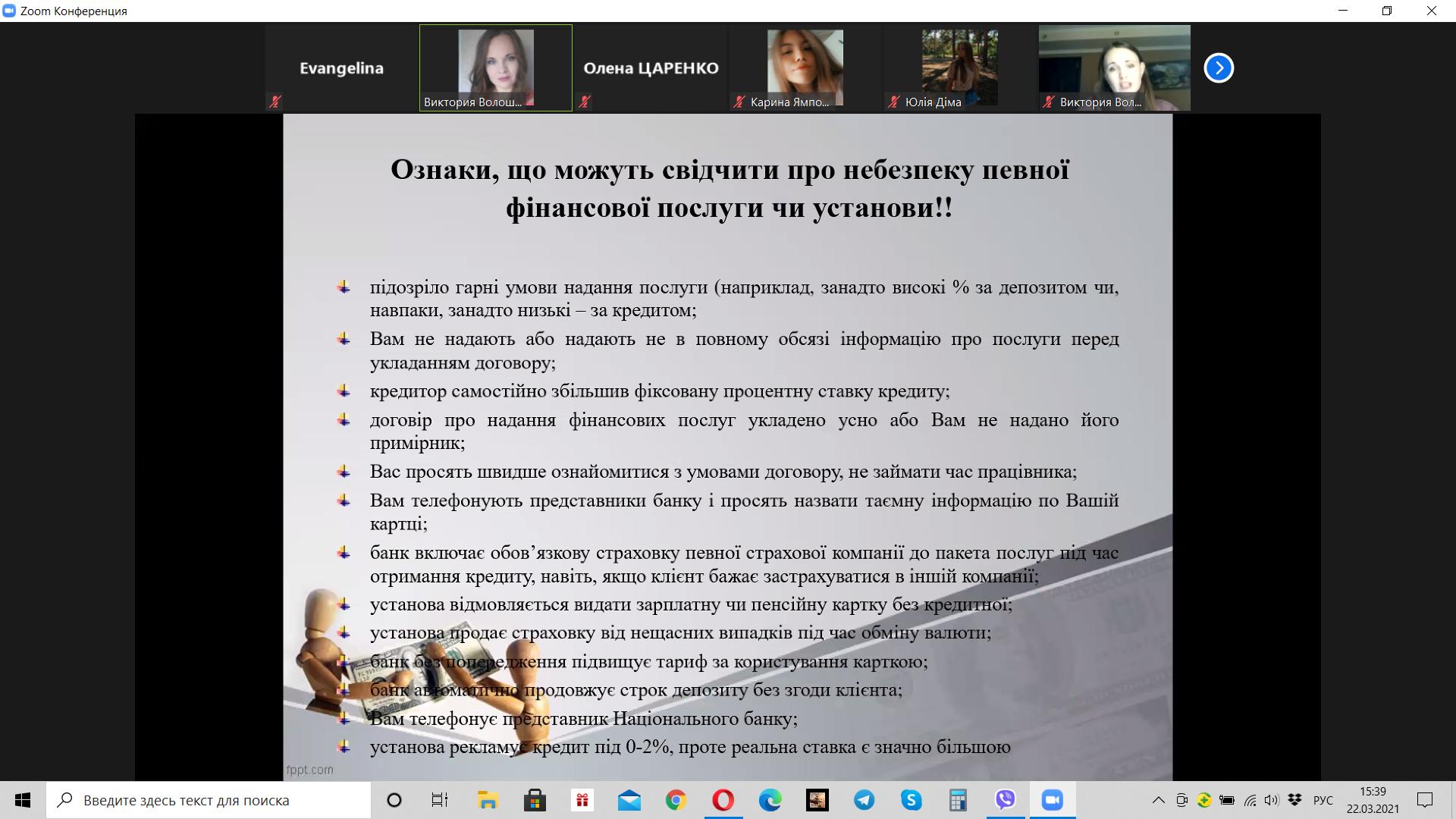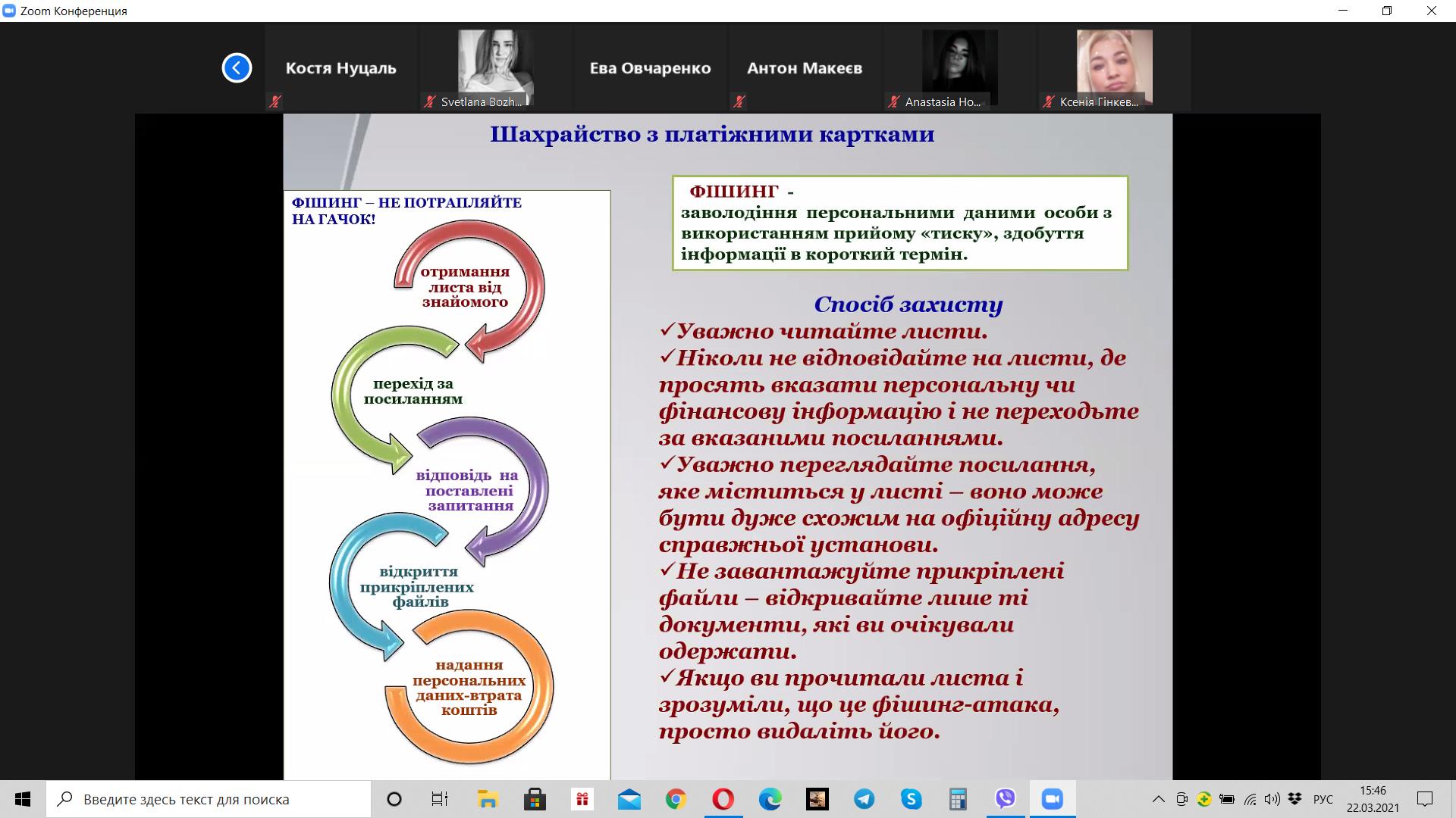 Викладач Волошина-Сідей В.В. розповіла про найпопулярніші схеми фінансово шахрайства (скімінг, фішинг, фармінг, смішинг, трепінг, інтернет шахрайство та інші). Особливу увагу було приділено критеріям вибору надійної фінансової установи.