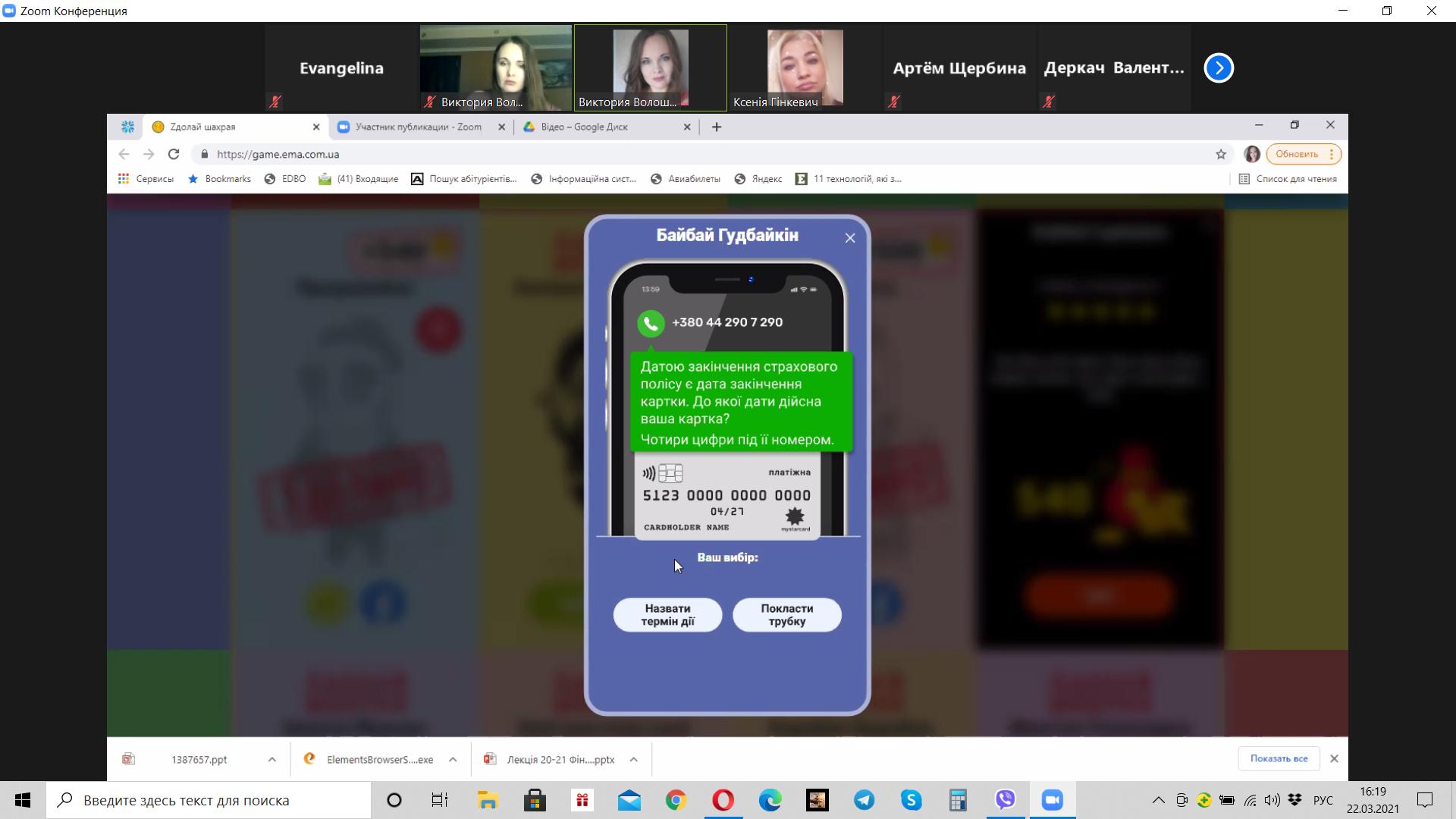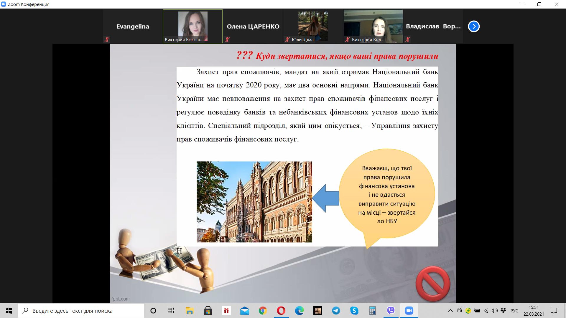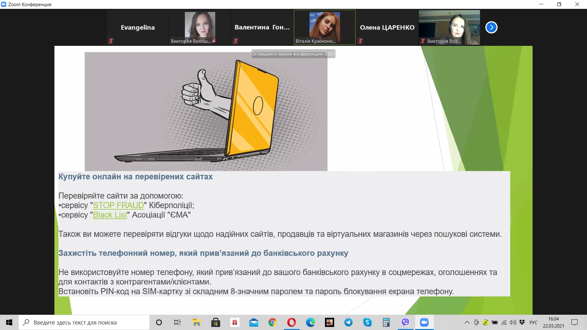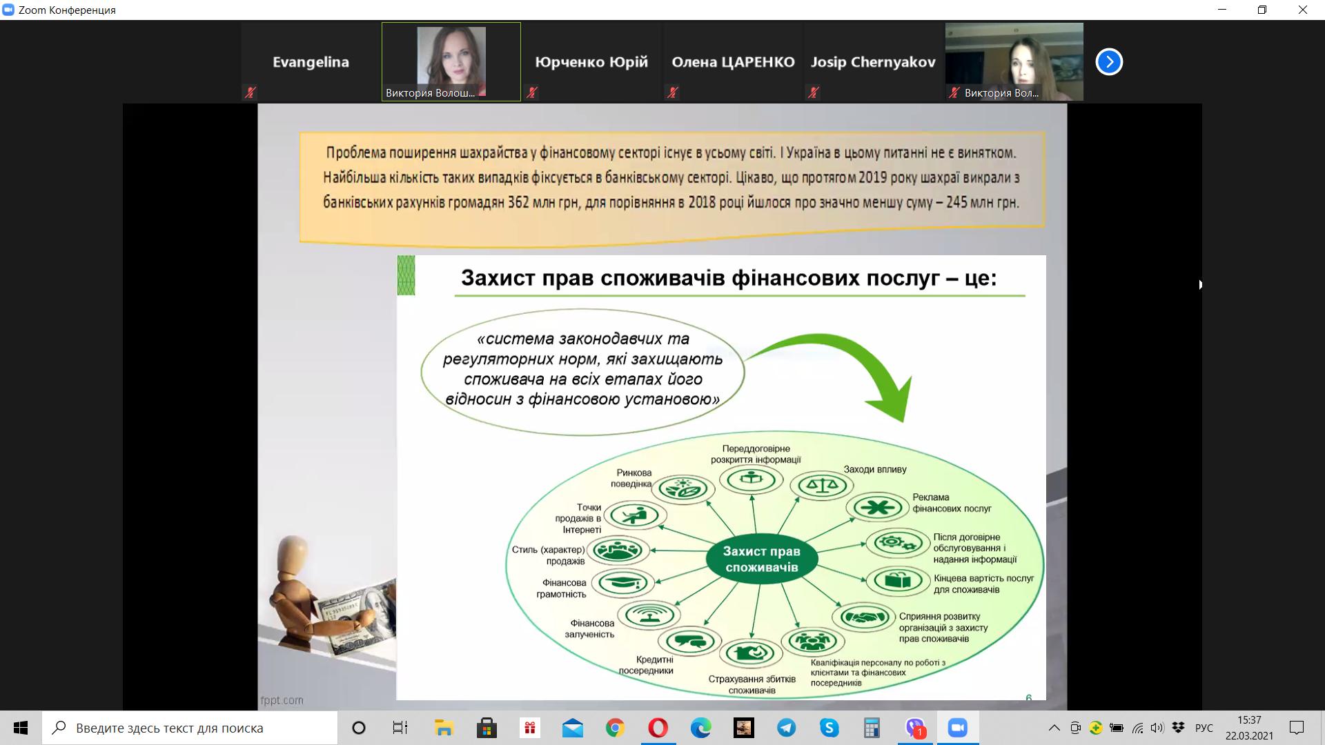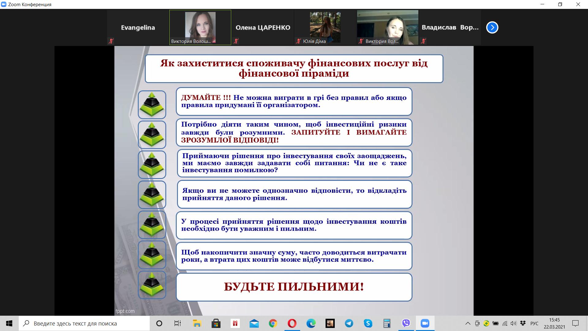Викладач Волошина-Сідей В.В. розповіла про найпопулярніші схеми фінансово шахрайства (скімінг, фішинг, фармінг, смішинг, трепінг, інтернет шахрайство та інші). Особливу увагу було приділено критеріям вибору надійної фінансової установи.