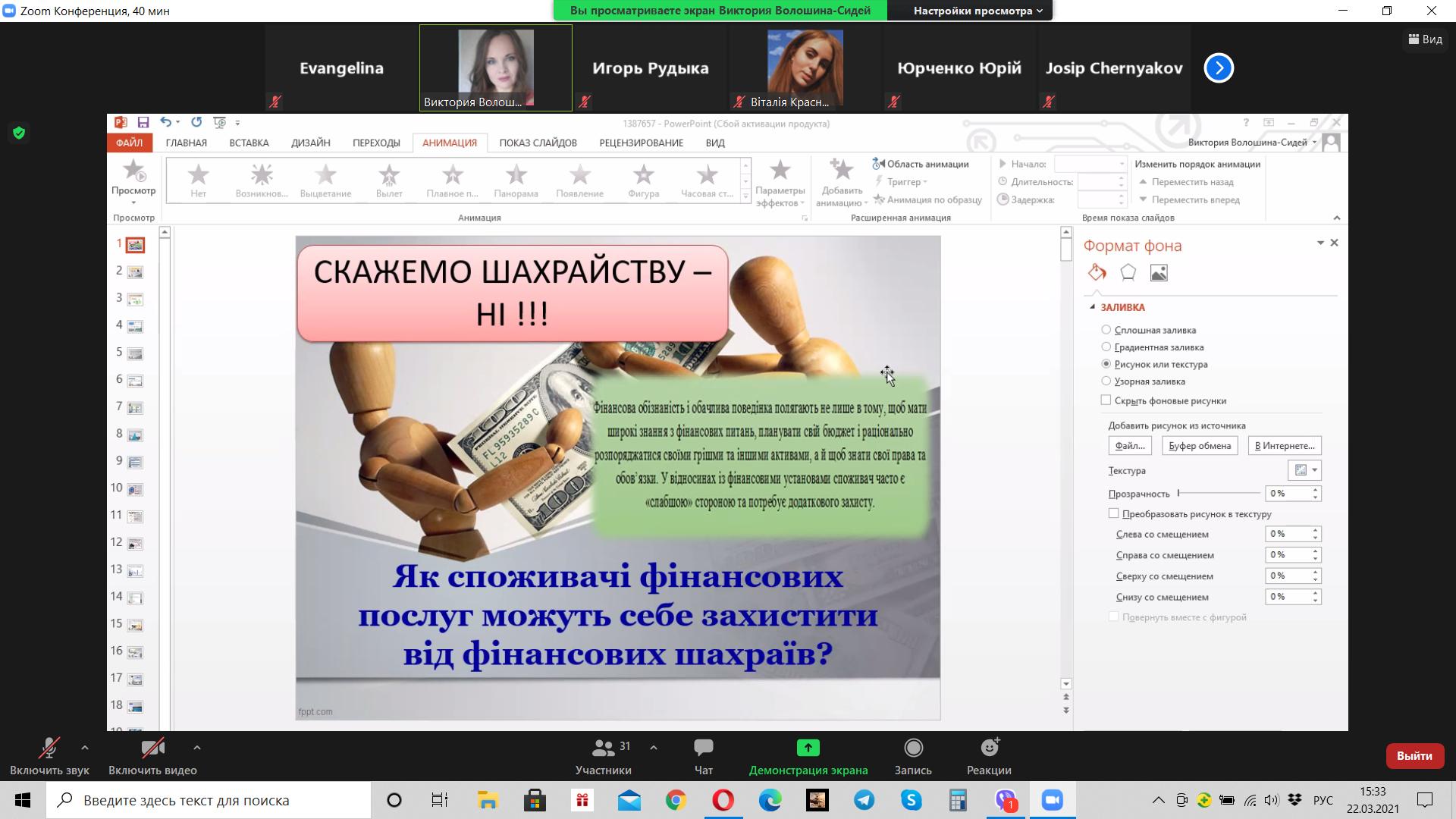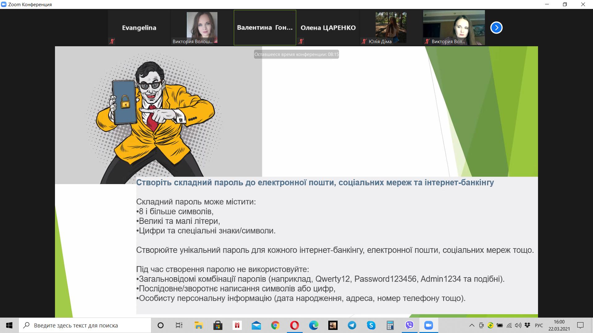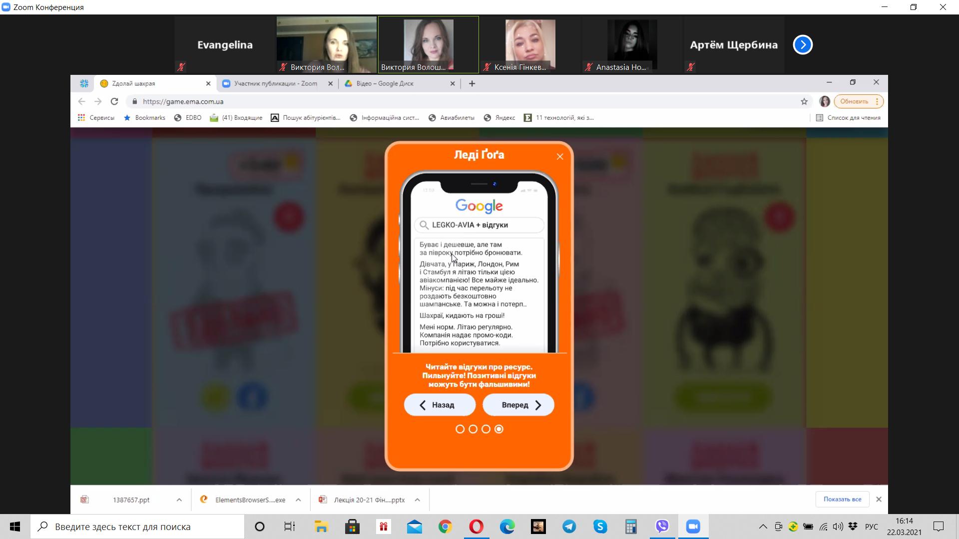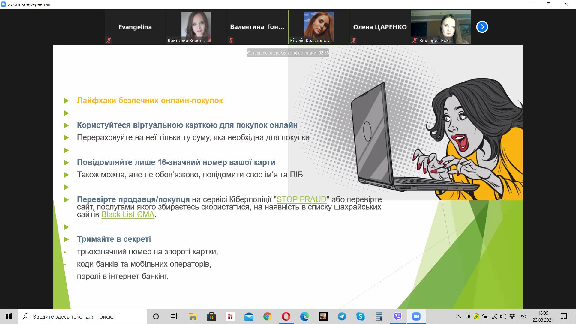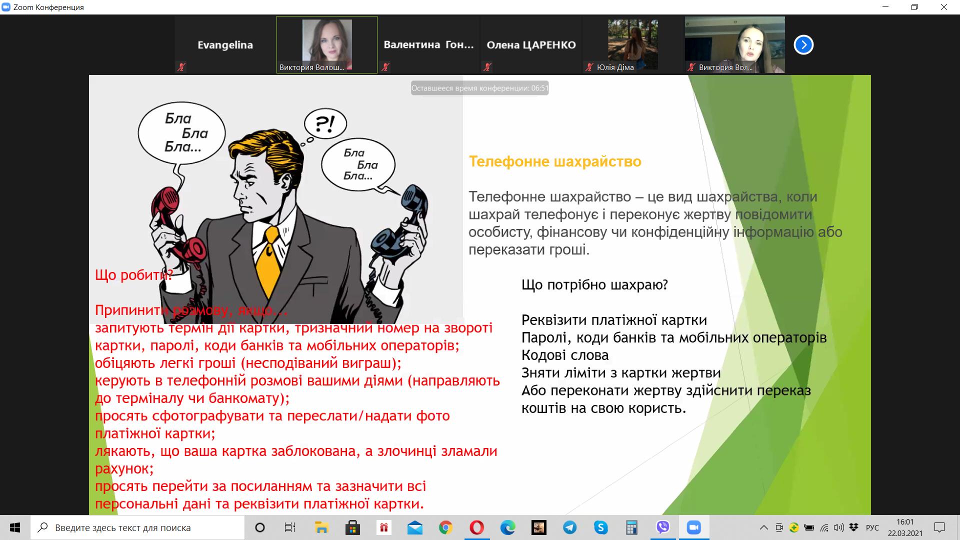 Викладач Волошина-Сідей В.В. розповіла про найпопулярніші схеми фінансово шахрайства (скімінг, фішинг, фармінг, смішинг, трепінг, інтернет шахрайство та інші). Особливу увагу було приділено критеріям вибору надійної фінансової установи.