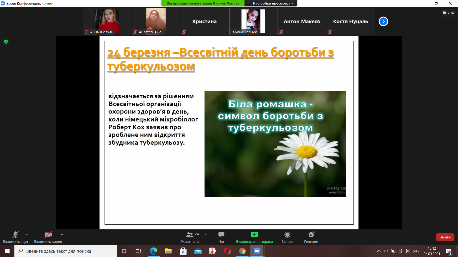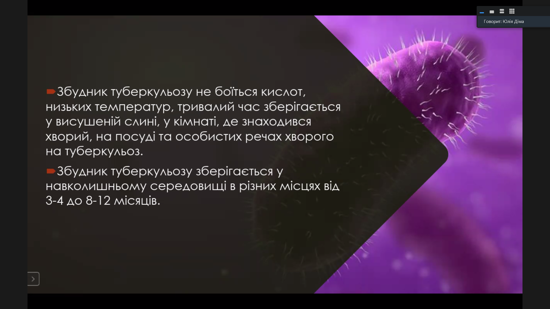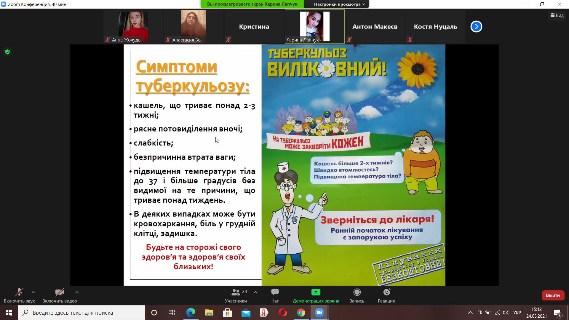 З цієї нагоди у Відокремленому структурному підрозділі «Фаховому коледжі Миколаївського національного університету імені В.О. Сухомлинського», під керівництвом ВОЙТОВСЬКОЇ АНАСТАСІЇ МИХАЙЛІВНИ було проведено круглий стіл онлайн, в якому до обговорення активно долучились студенти спеціальності «Соціальна робота». Були висвітленні нагальні питання, які стосуються профілактики, лікування, способів передачі туберкульозу та методів захисту власного здоров’я. Разом обговорили актуальні питання, що стосуються алгоритму дій хворого, особливостей захисту інших людей у разі інфікування та особливостей зміцнення імунітету, також роз’яснили важливу інформацію щодо соціальних гарантій для всіх осіб, які захворіли на цю недугу, зокрема і для студентської молоді.
