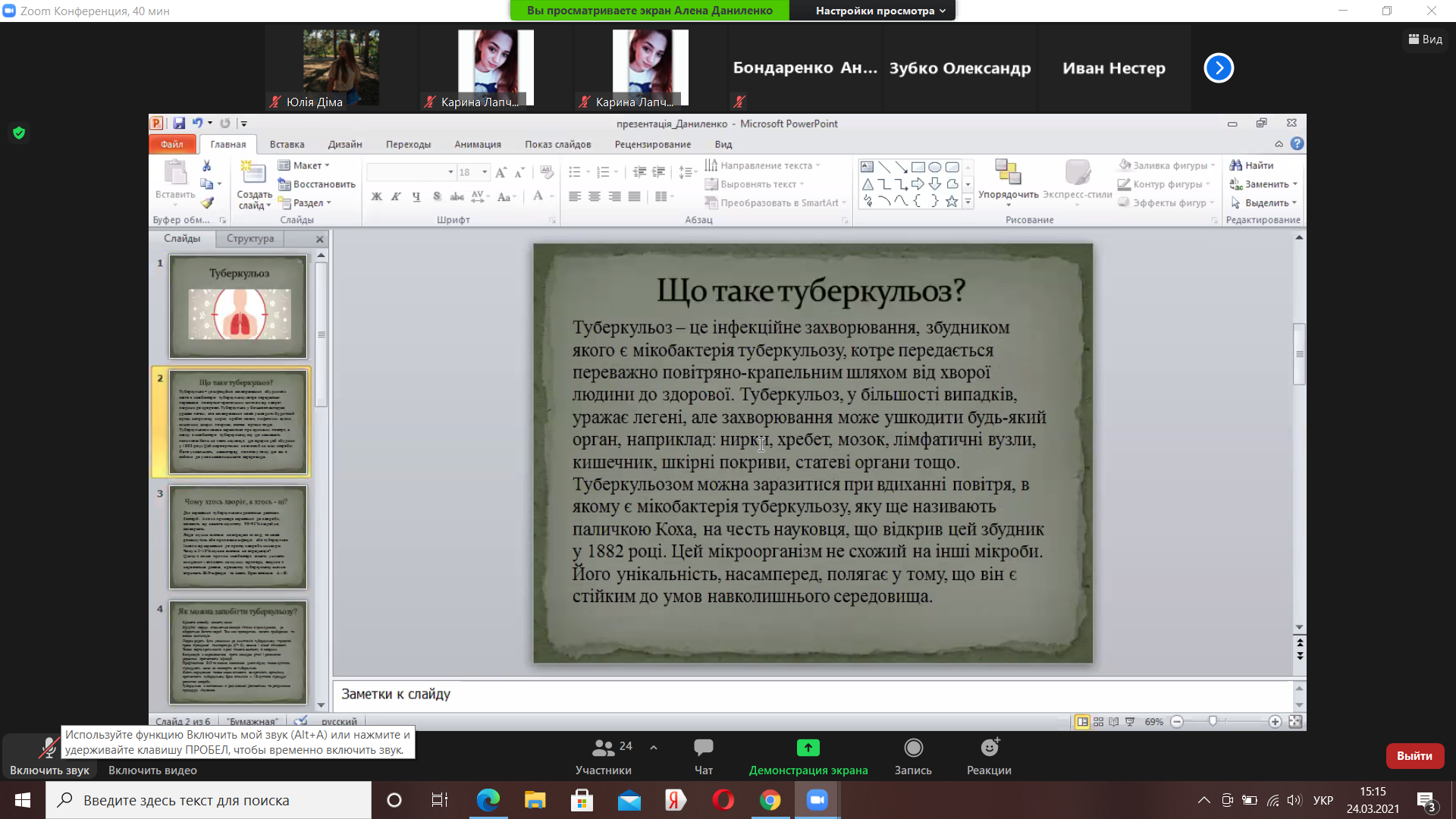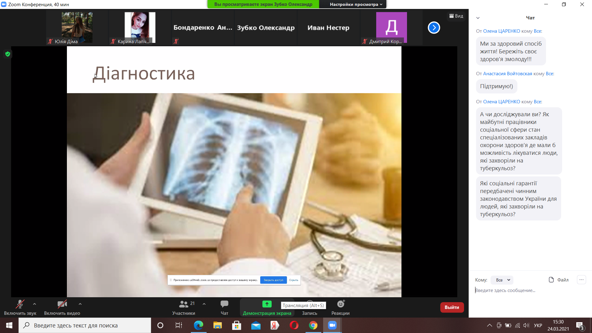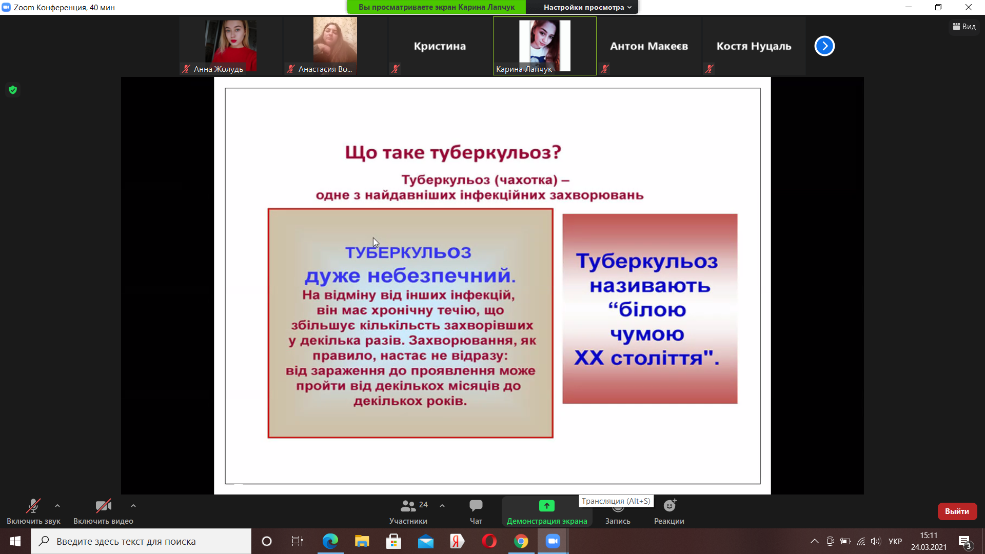 З цієї нагоди у Відокремленому структурному підрозділі «Фаховому коледжі Миколаївського національного університету імені В.О. Сухомлинського», під керівництвом ВОЙТОВСЬКОЇ АНАСТАСІЇ МИХАЙЛІВНИ було проведено круглий стіл онлайн, в якому до обговорення активно долучились студенти спеціальності «Соціальна робота». Були висвітленні нагальні питання, які стосуються профілактики, лікування, способів передачі туберкульозу та методів захисту власного здоров’я. Разом обговорили актуальні питання, що стосуються алгоритму дій хворого, особливостей захисту інших людей у разі інфікування та особливостей зміцнення імунітету, також роз’яснили важливу інформацію щодо соціальних гарантій для всіх осіб, які захворіли на цю недугу, зокрема і для студентської молоді.