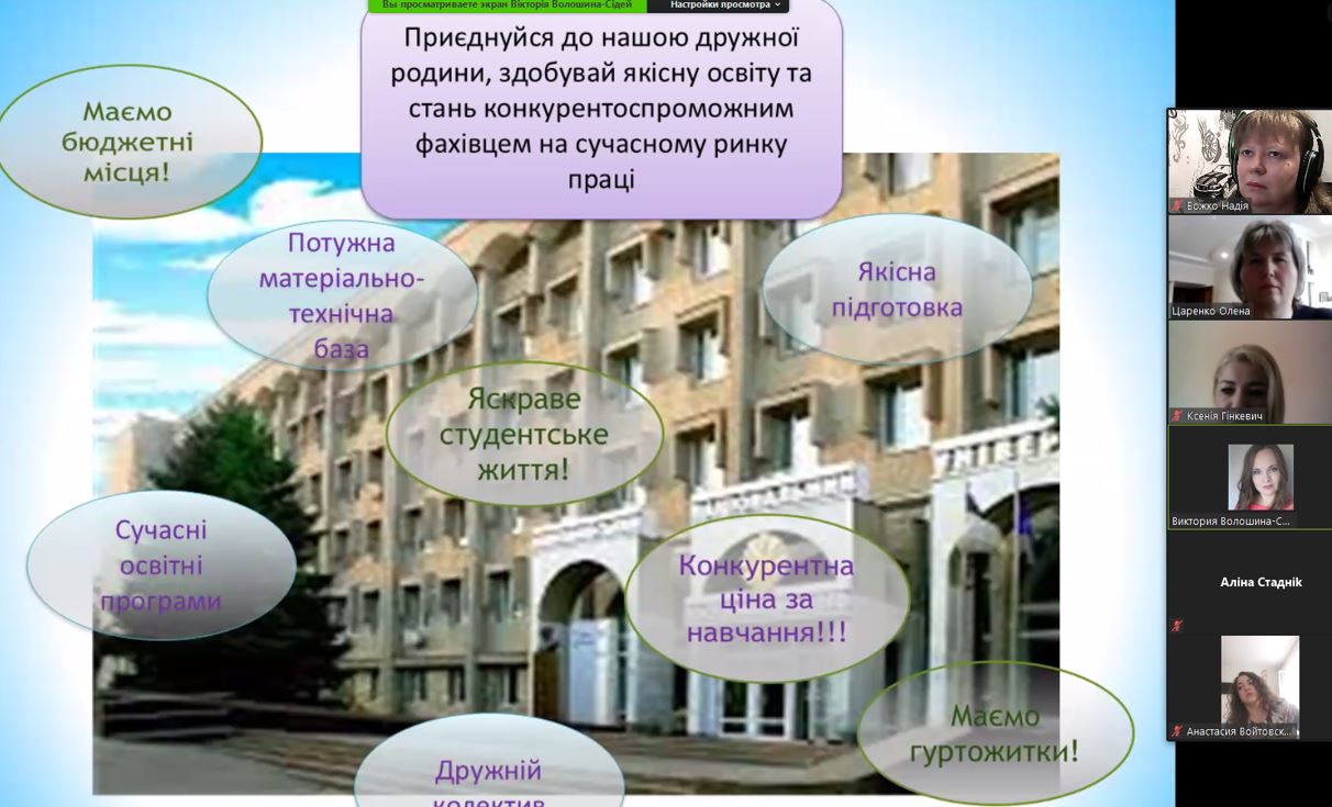Наступним етапом заходу була зустріч із відповідальним секретарем приймальної комісії коледжу Оксаною Валентинівною Гінкевич, яка ознайомила учасників заходу із особливостями та новаціями Вступної кампанії 2021 року.