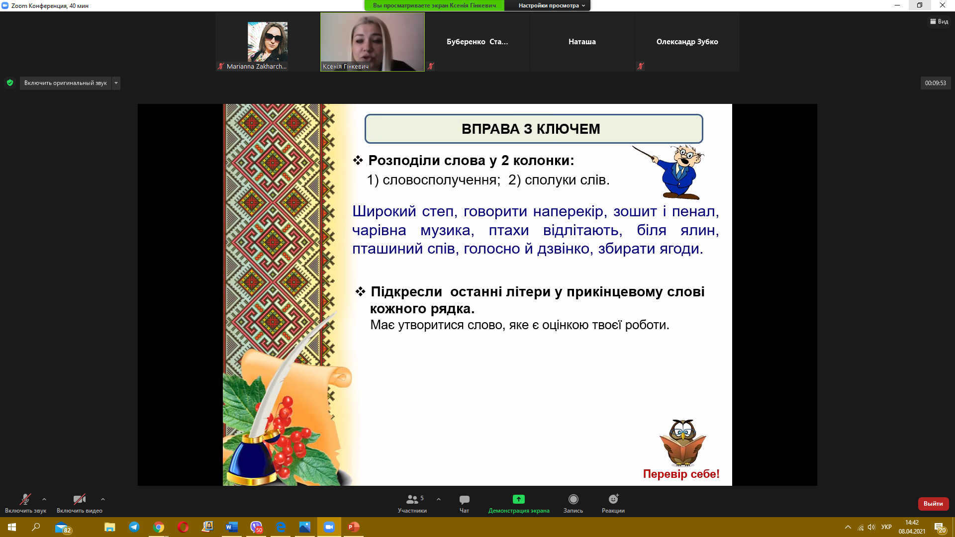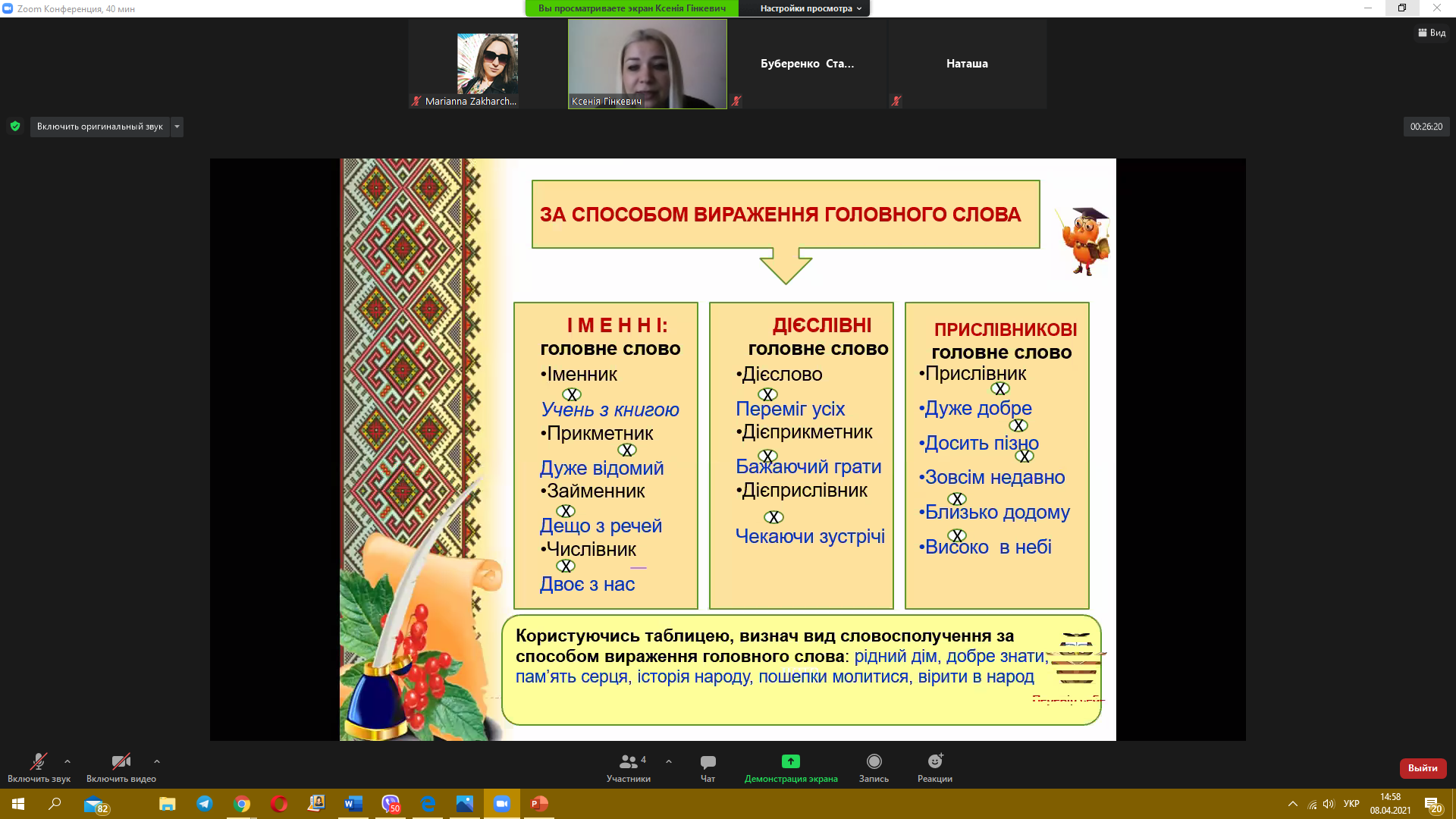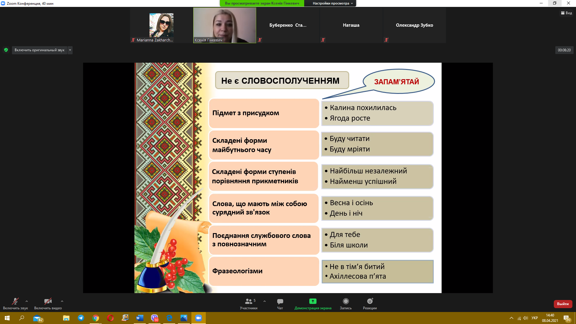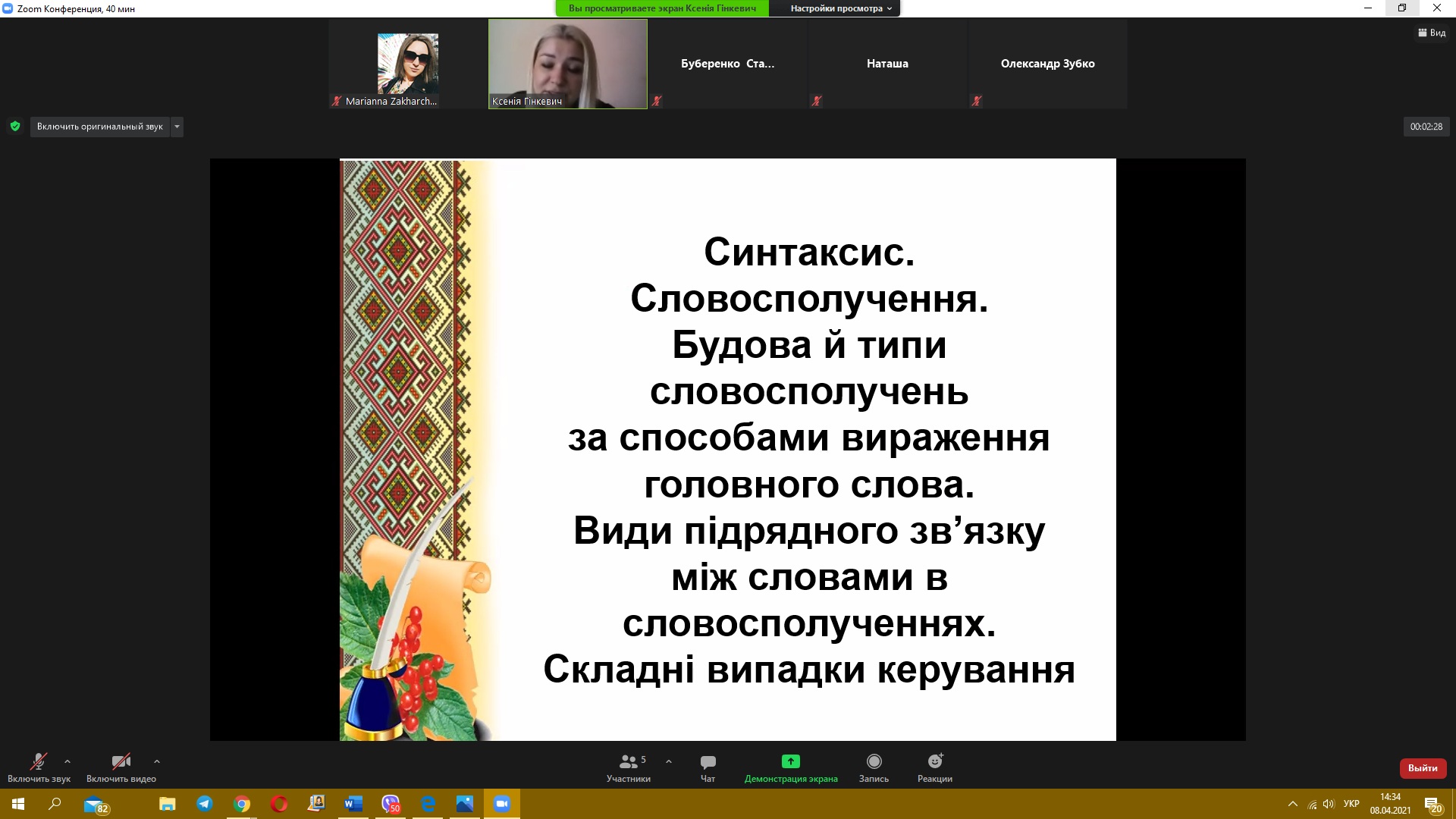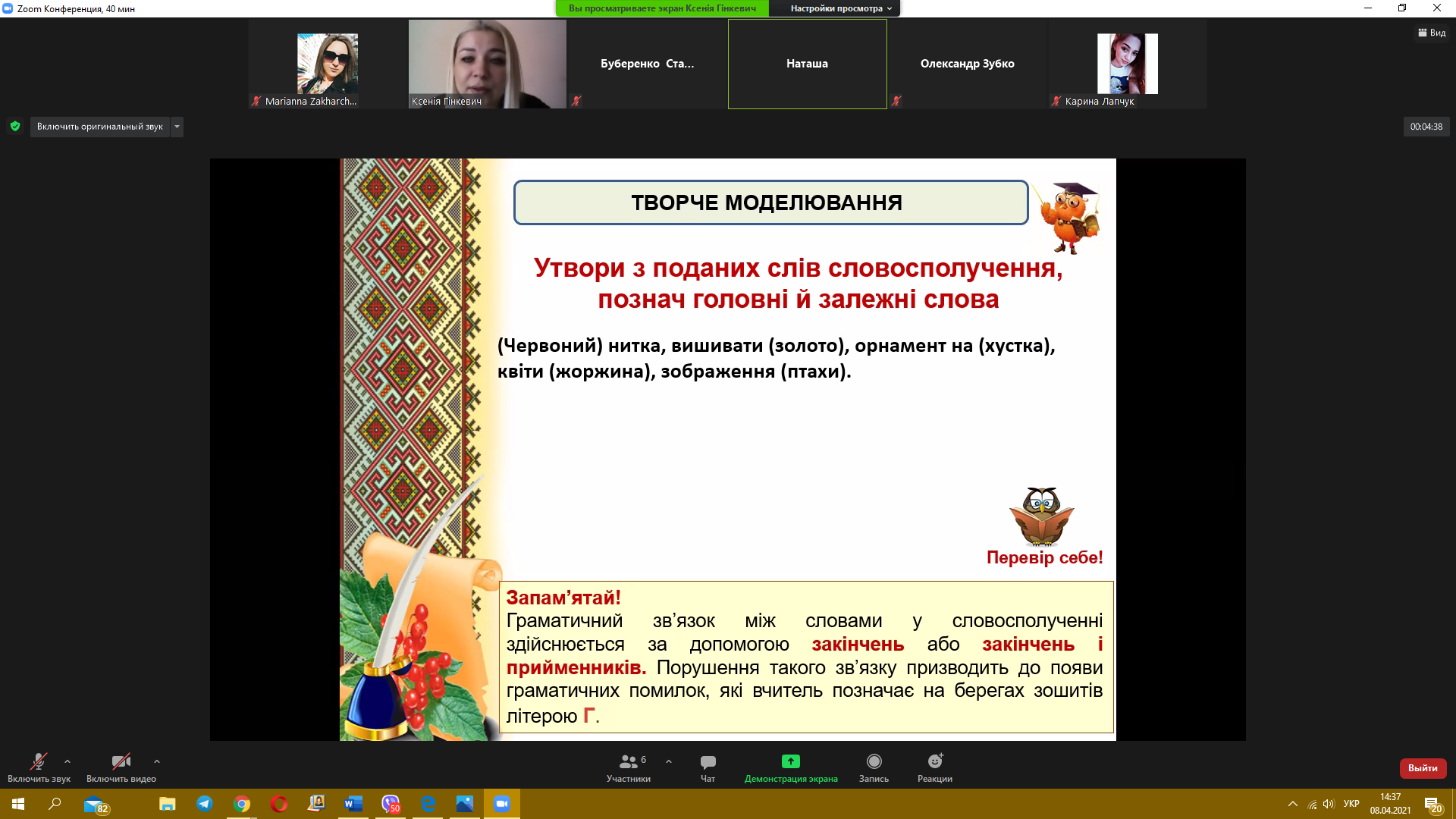 8 квітня 2021 року пройшов черговий майстер-клас з теми «Синтаксис. Словосполучення» від викладача української мови Гінкевич Оксани Валентинівни. Ми звертаємо увагу на методи виконання типових завдань та на помилки, яких найчастіше допускають при розв’язанні студенти, надаємо поради, як їх уникнути.