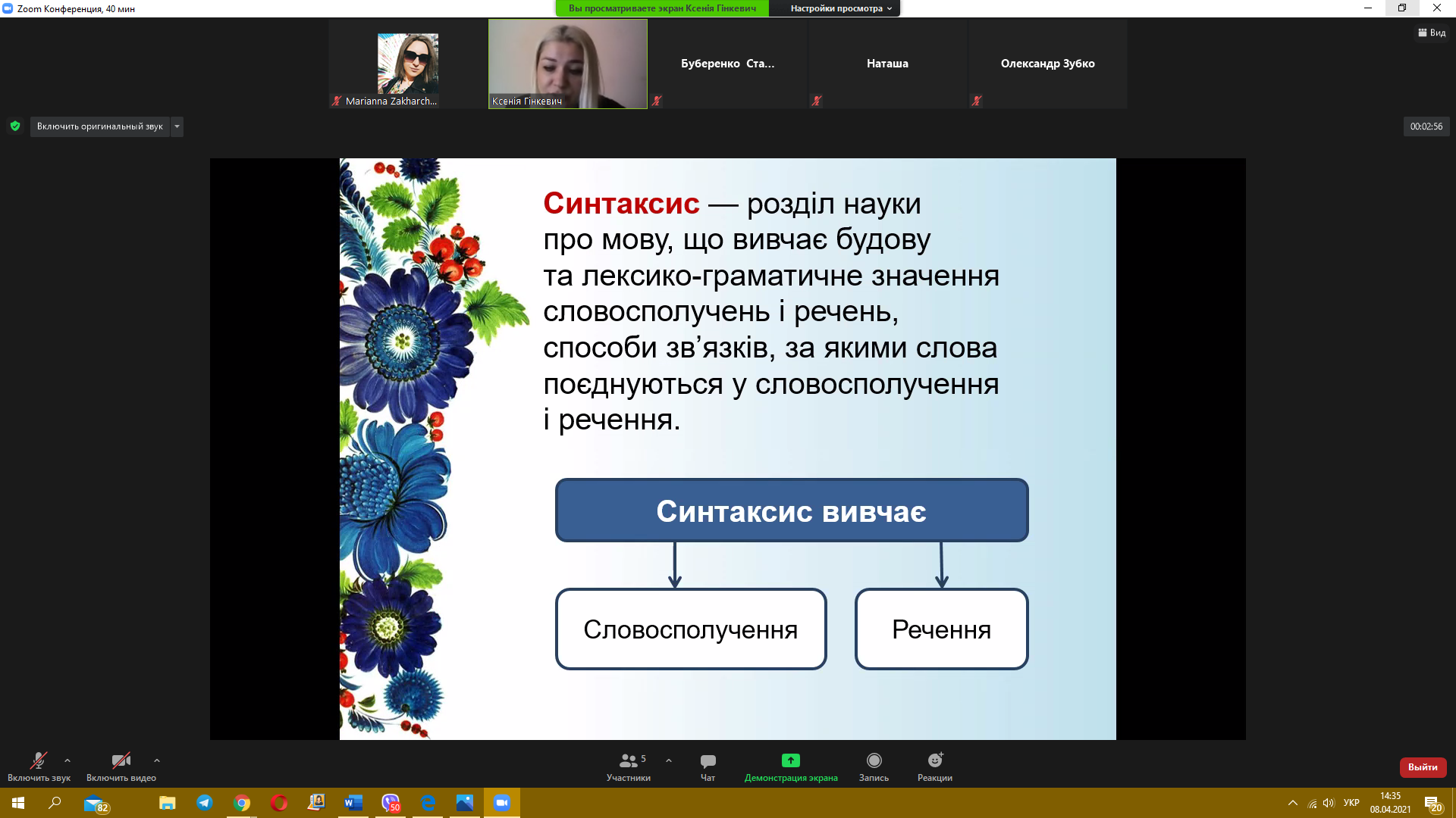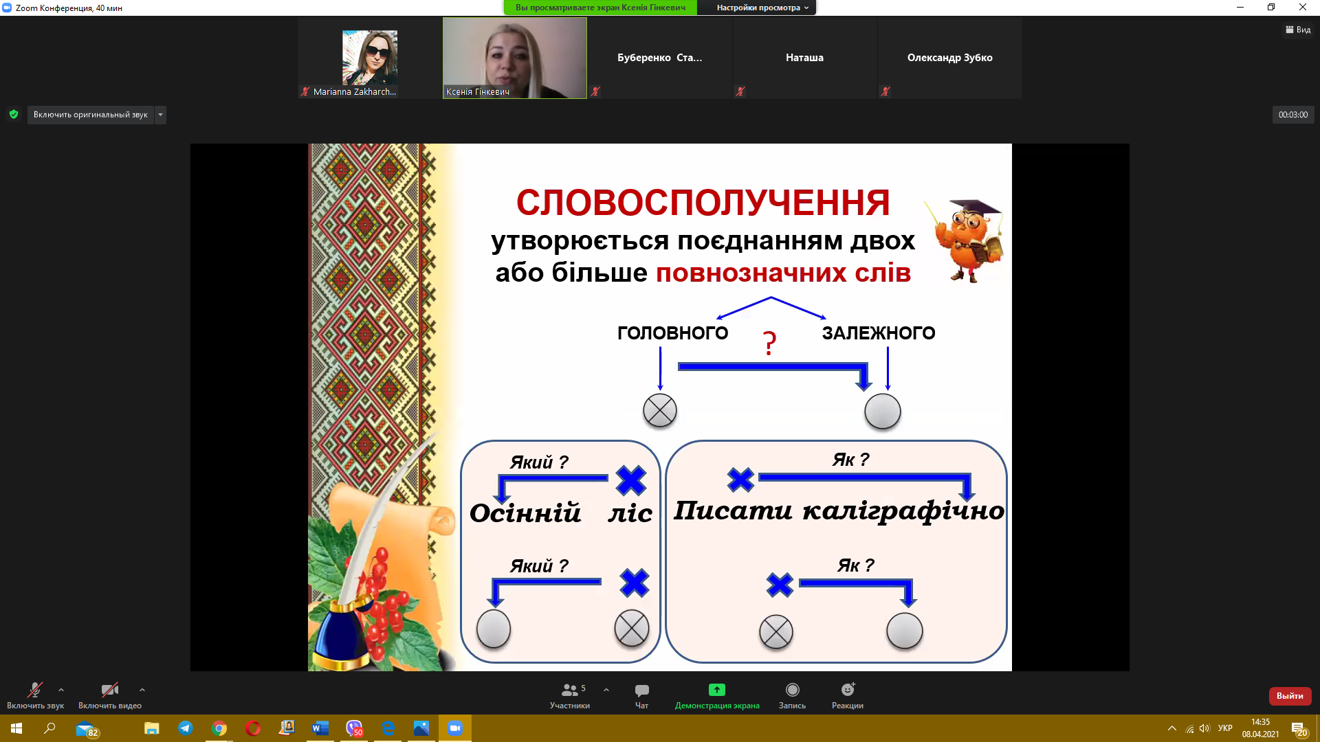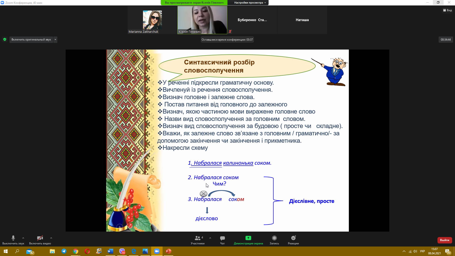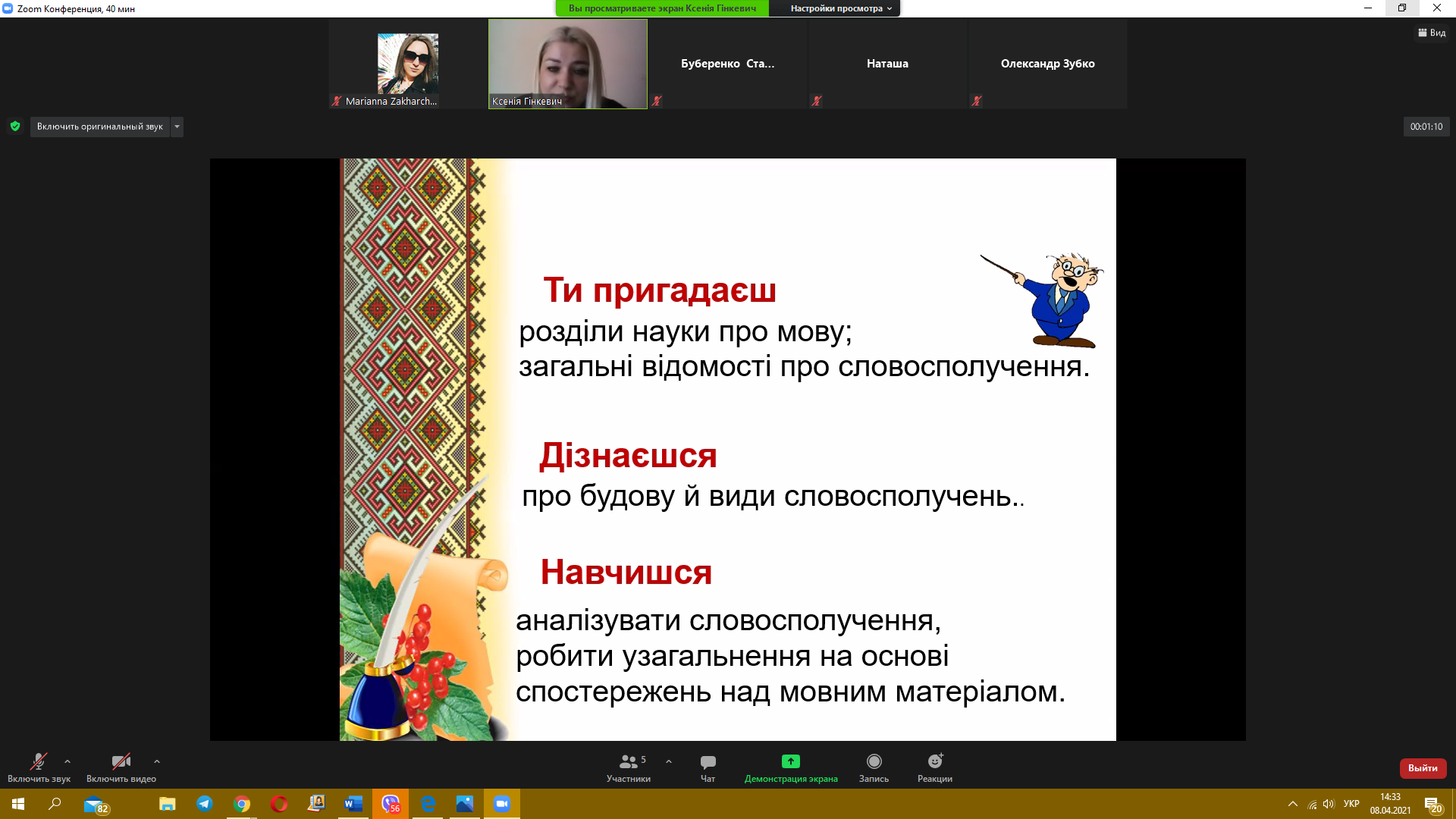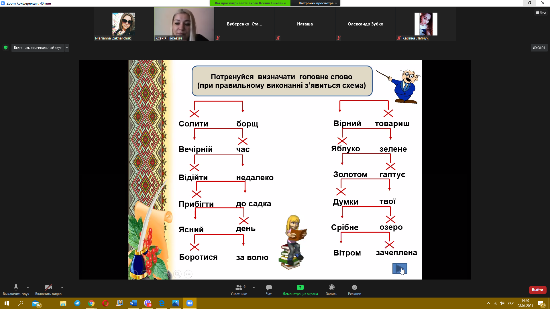 8 квітня 2021 року пройшов черговий майстер-клас з теми «Синтаксис. Словосполучення» від викладача української мови Гінкевич Оксани Валентинівни. Ми звертаємо увагу на методи виконання типових завдань та на помилки, яких найчастіше допускають при розв’язанні студенти, надаємо поради, як їх уникнути.