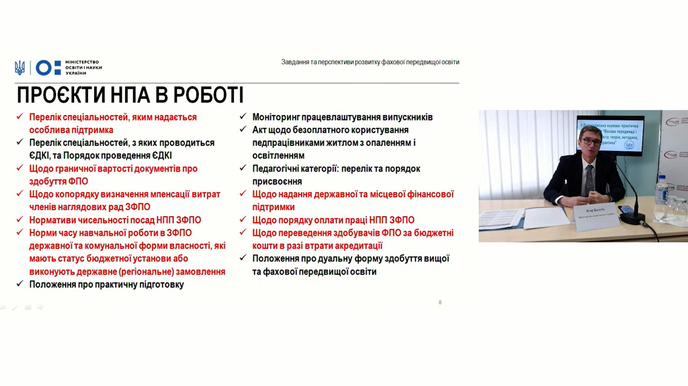 Володимир ЗЕЛЕНИЙ, канд. іст. наук, координатор сектору фахової передвищої освіти Науково-методичної ради МОН України, директор Верхньодніпровського коледжу Дніпровського ДАЕУ з проблемним питанням: «Імплементація ЗУ «Про фахову передвищу освіту: горизонт-2025»