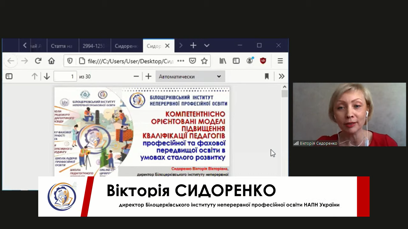 Вікторія СИДОРЕНКО, д-р пед. наук, професор кафедри педагогіки, психології та менеджменту, директор Білоцерківського інституту неперервної професійної освіти НАПН України з темою доповіді: «Компетентісно орієнтовані моделі підвищення кваліфікації педагогів професійної та фахової передвищої освіти в умовах сталого розвитку»