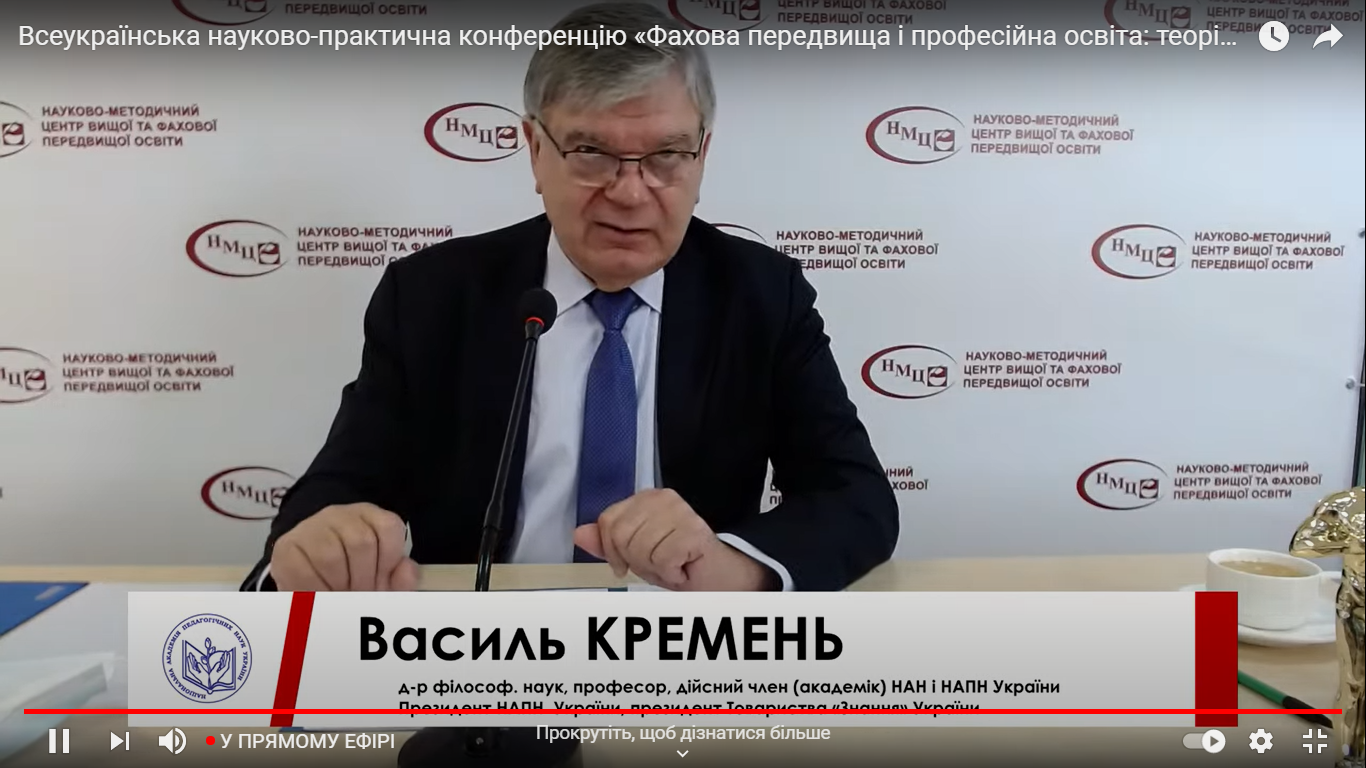 Василь КРЕМЕНЬ, д-р філософ. наук, професор, дійсний член (академік) НАН і НАПН України, Президент НАПН України, президент Товариства «Знання» України з виступом: «Фахова передвища і професійна освіта в контексті загальноцивілізаційних змін»