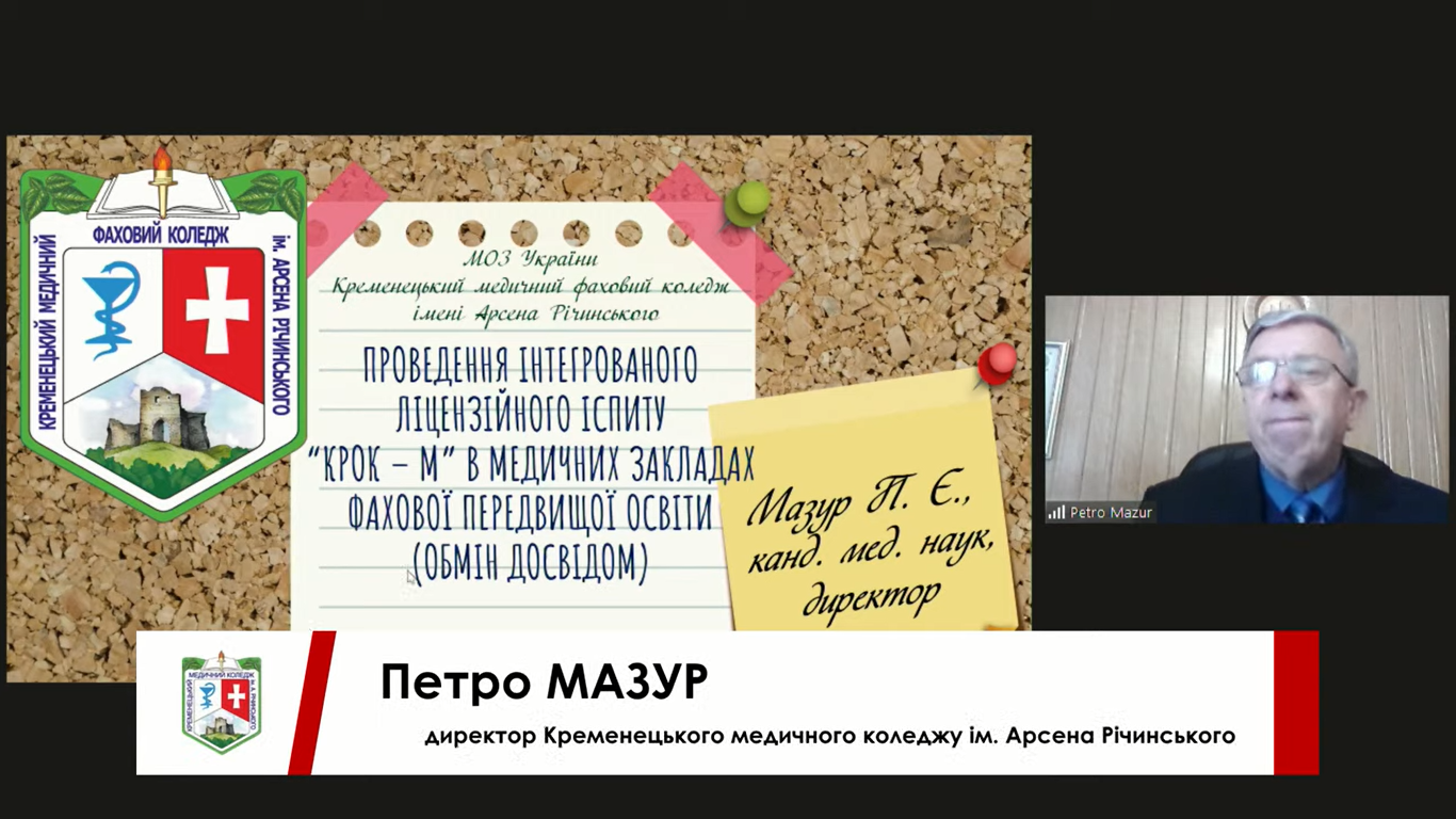 Петро МАЗУР, канд.мед. наук, директор Кременецького медичного коледжу ім. Арсена Річинського з практичним обговоренням проблематики проведення інтегрованого ліцензійного іспиту «Крок-М» в медичних закладах фахової передвищої освіти
