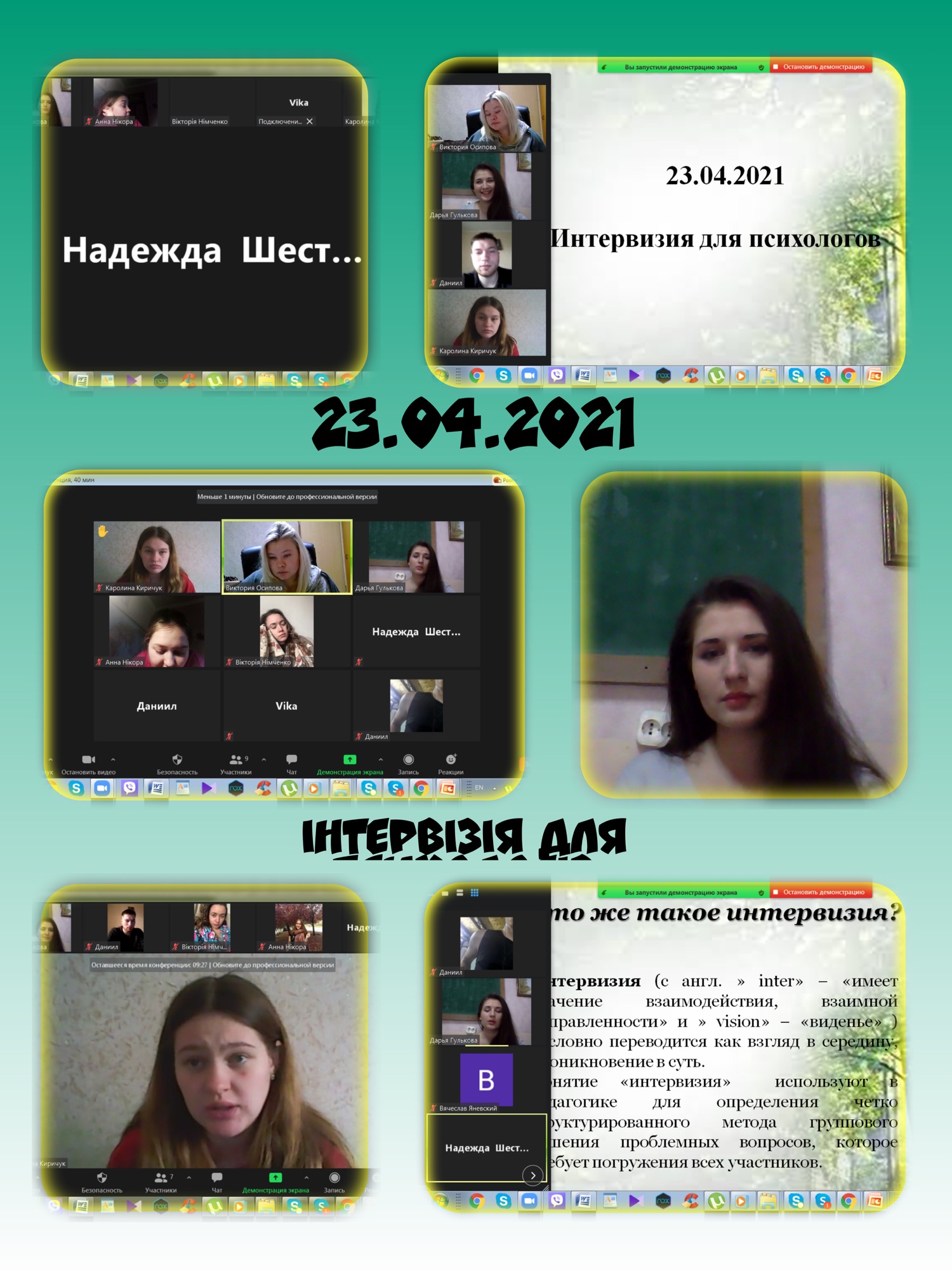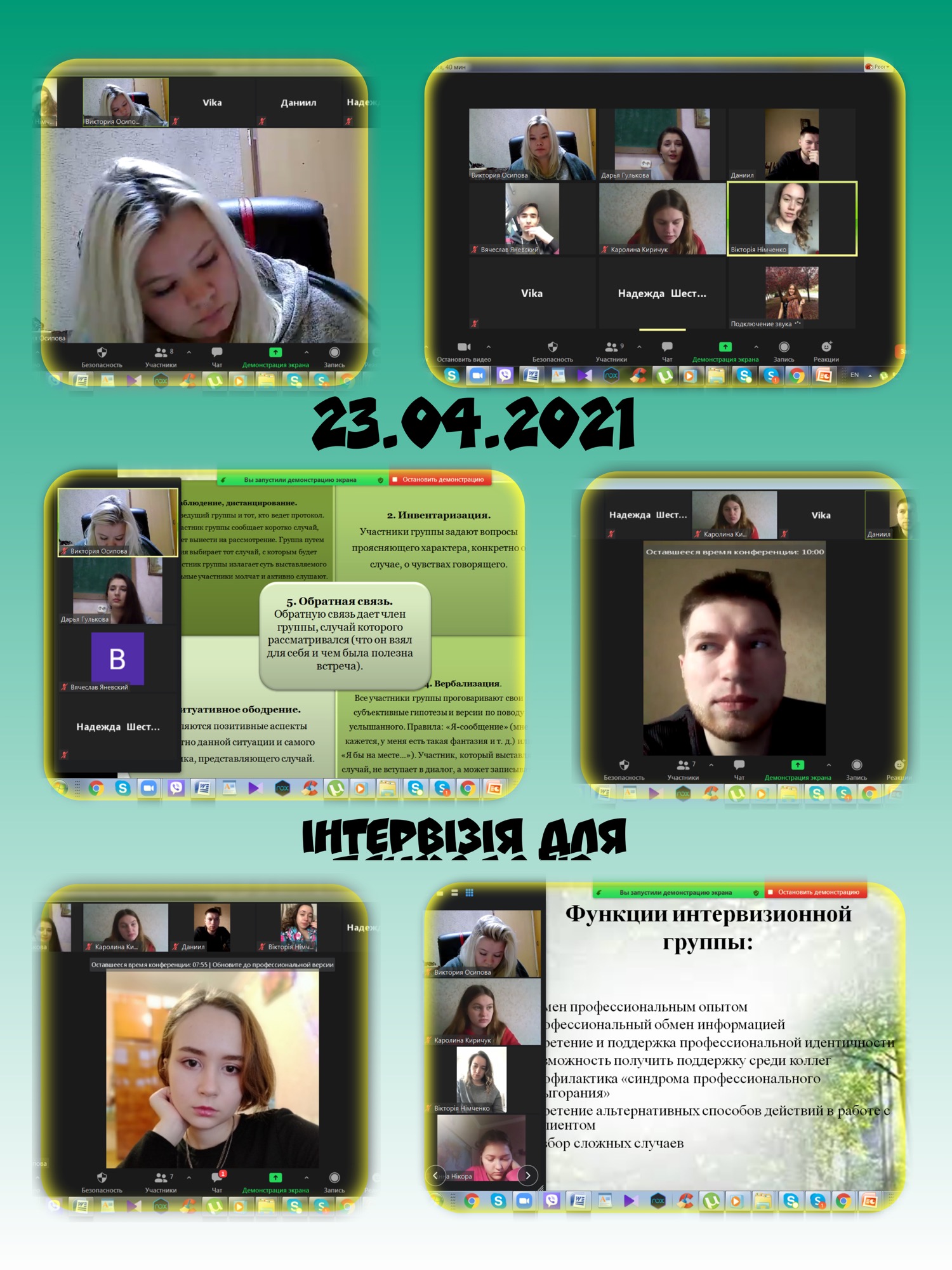 23 квітня 2021 року в міжнародний день психолога для студентів-психологів 3, 4, 5 курсів та випускників, а також для волонтерів Центру психологічної служби було проведено он-лайн заняття ” Інтервізія для психологів”.