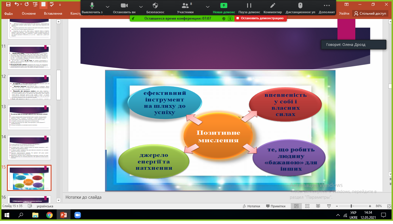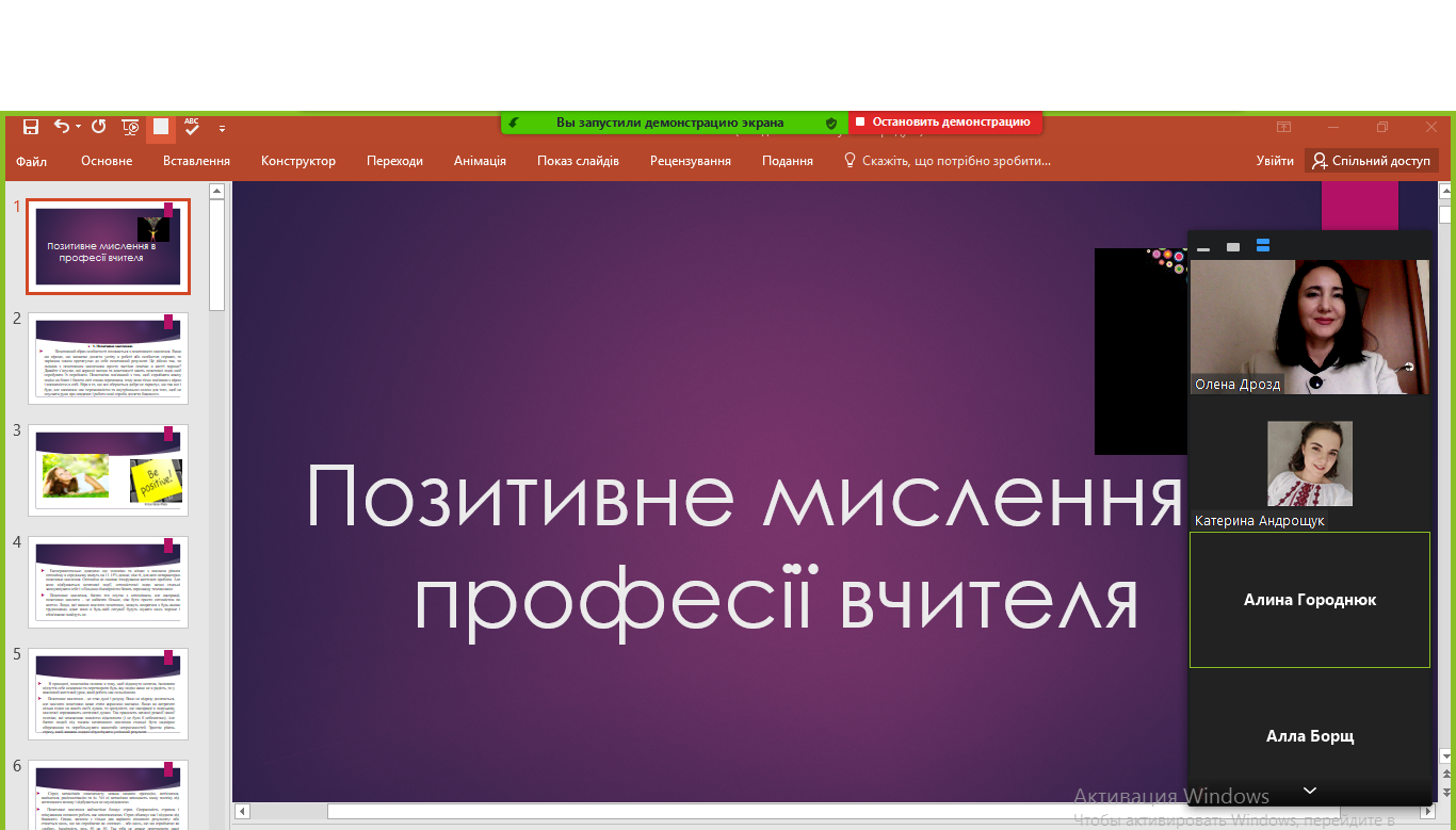 Модератор наголосила на важливості позитивного світогляду педагогічного працівника, запропонувала вправи і техніки на подолання стресу, тривоги, страхів, підкреслила доцільність емоційної саморегуляції.
