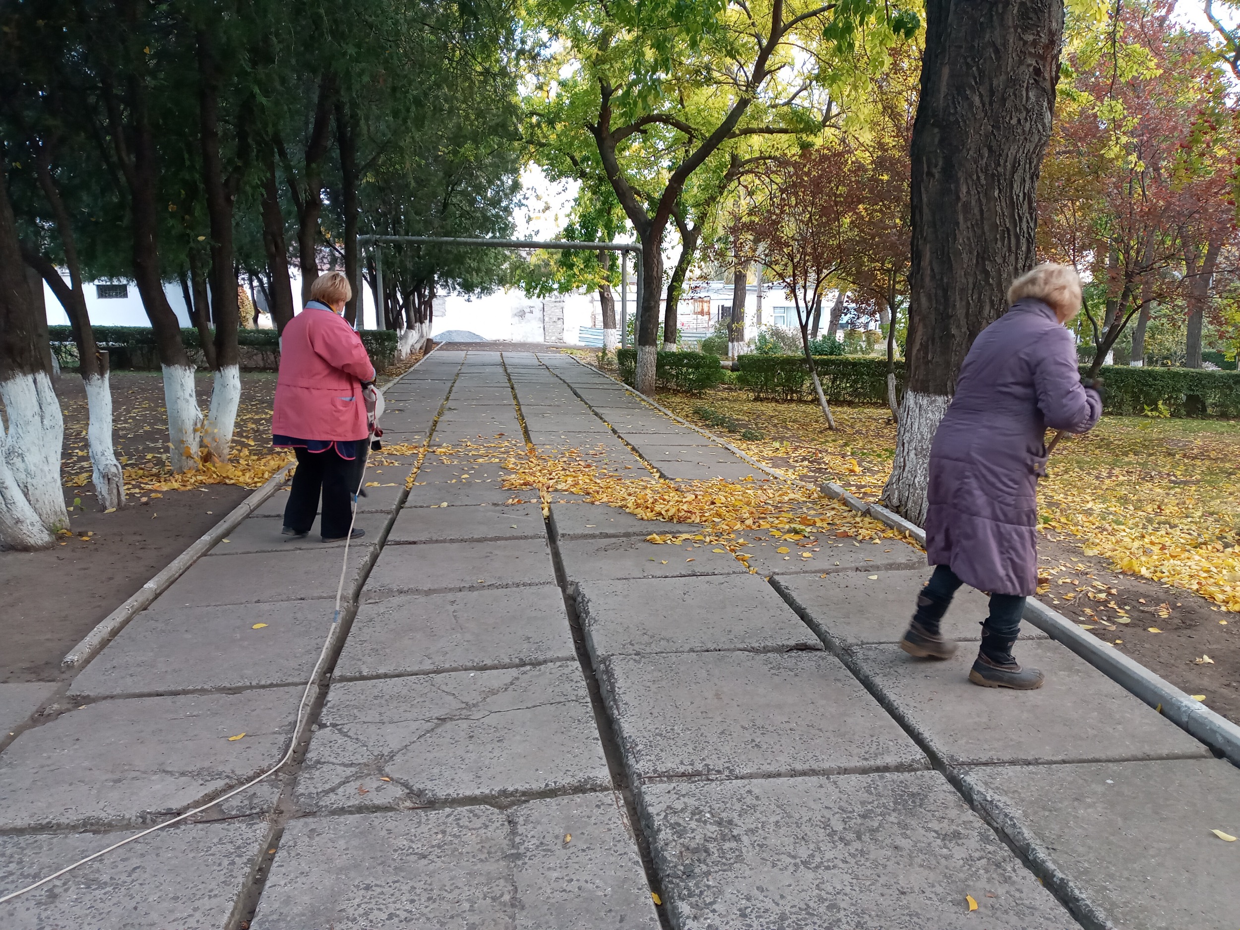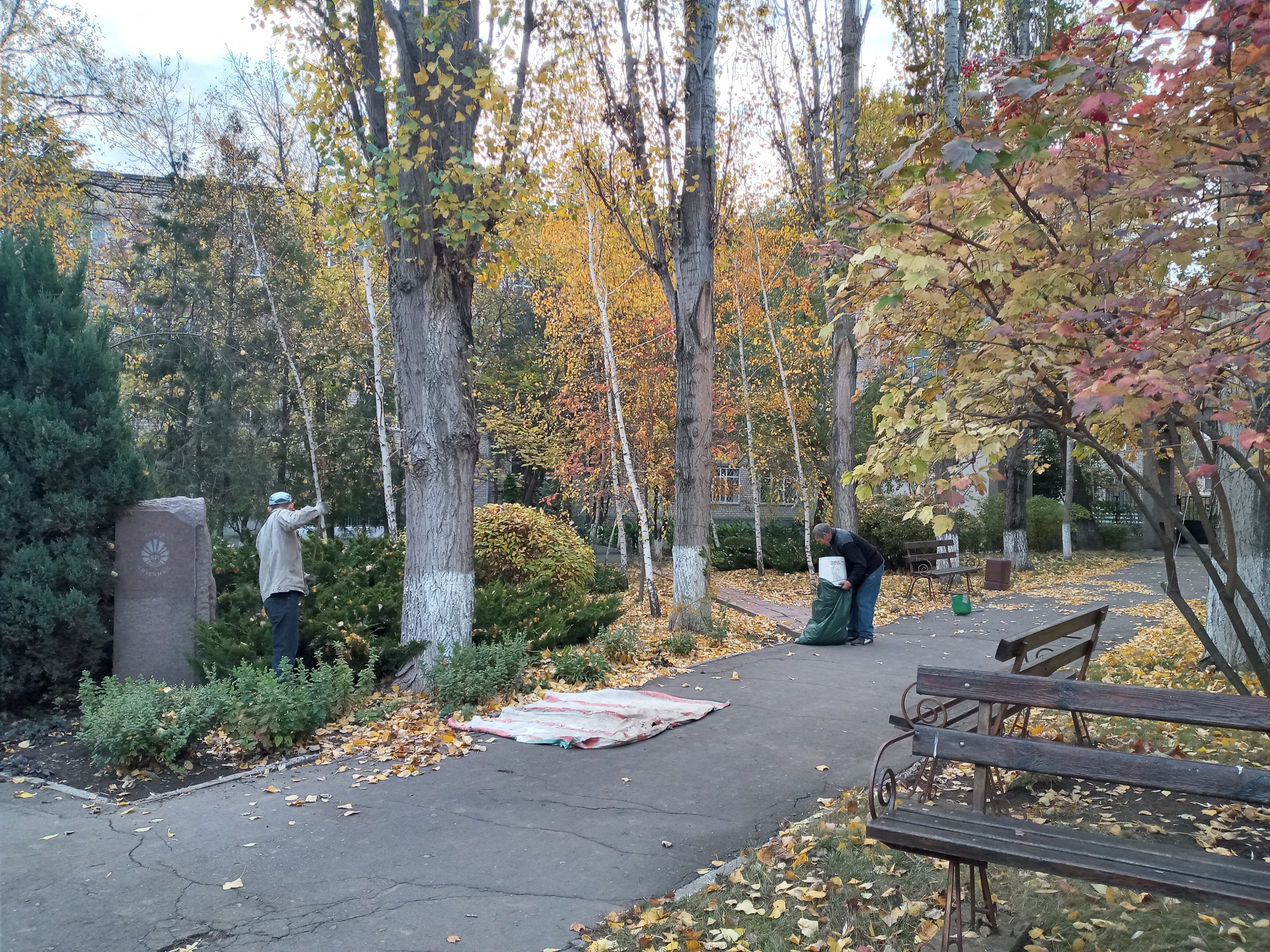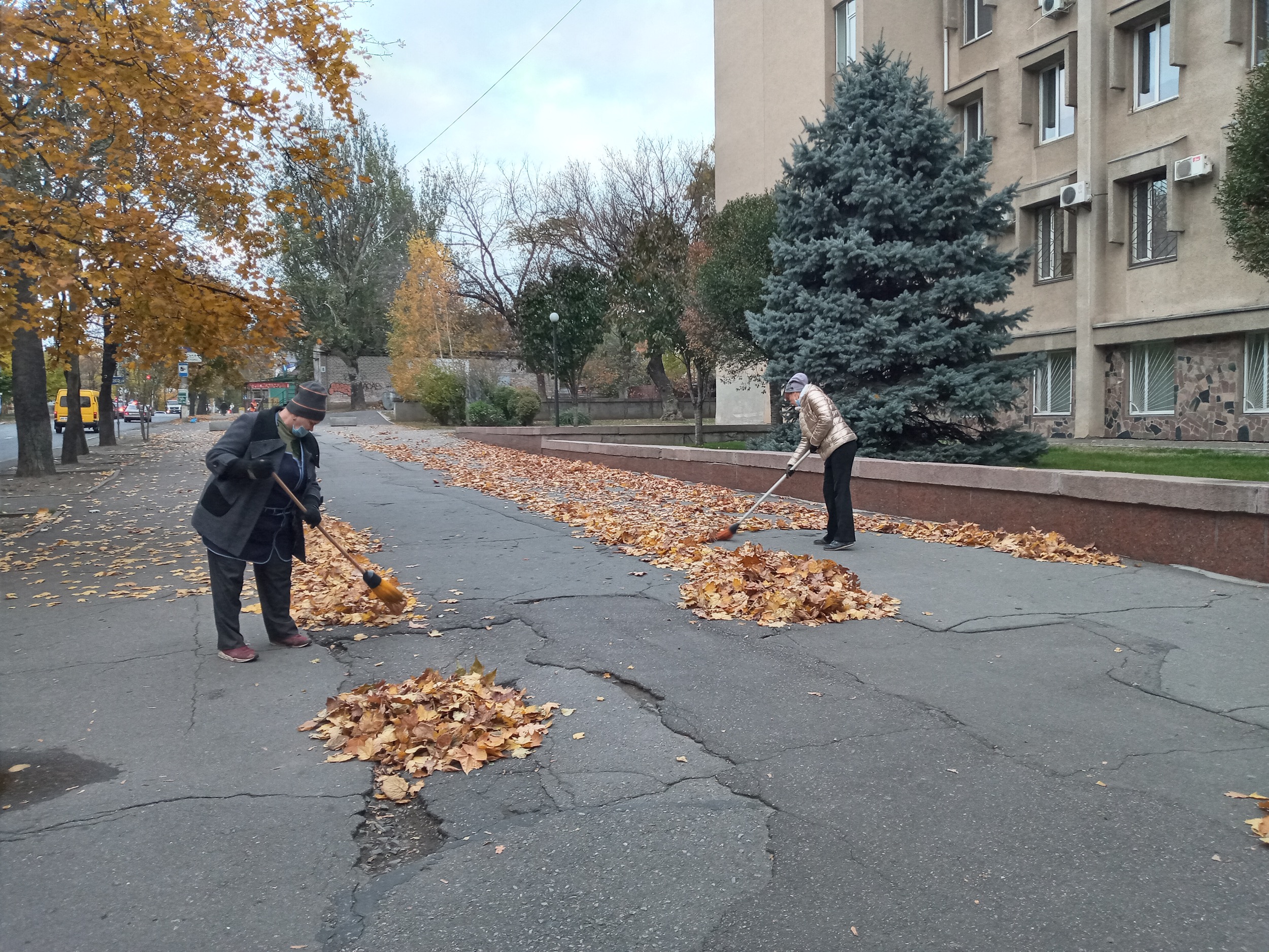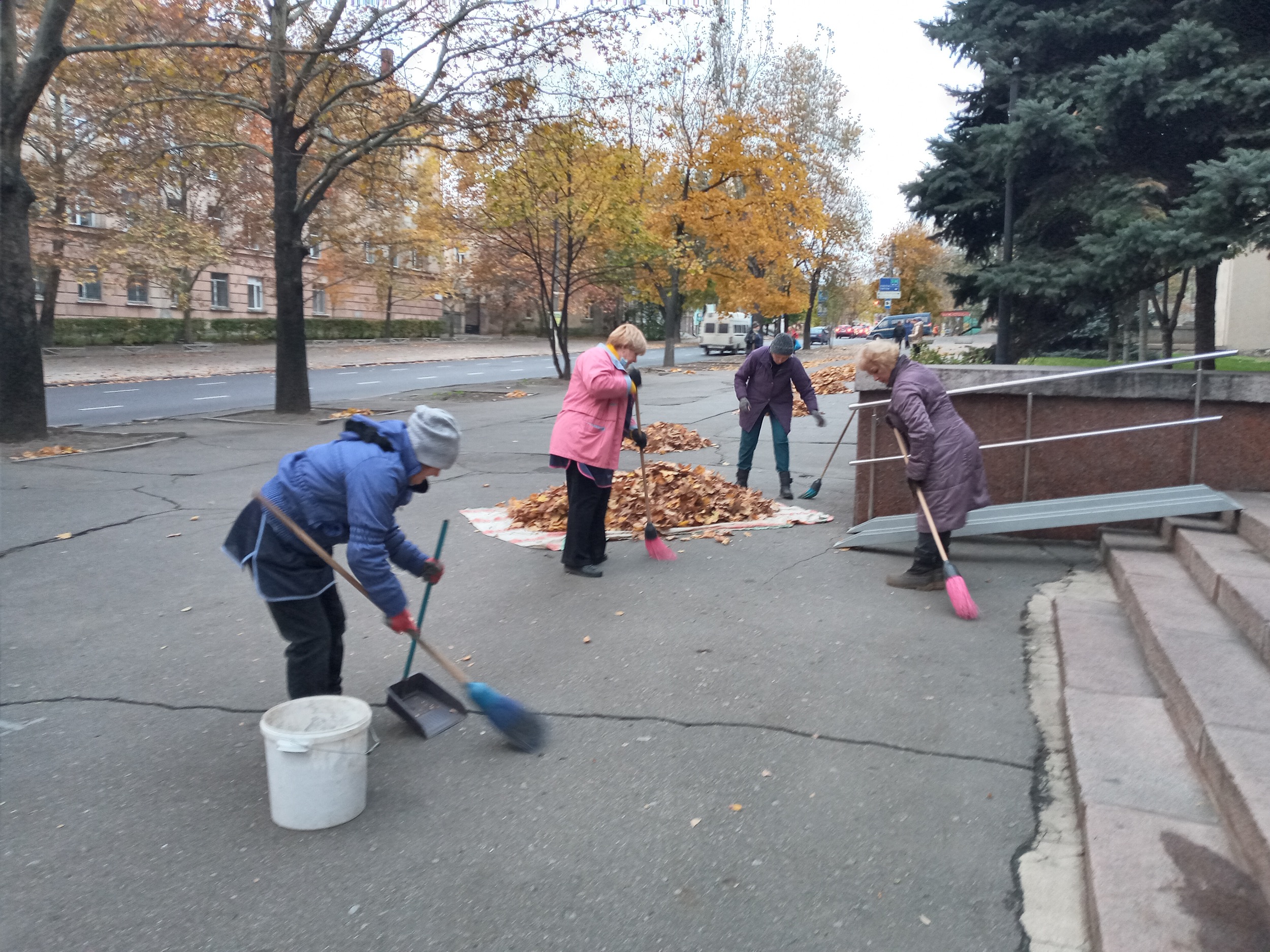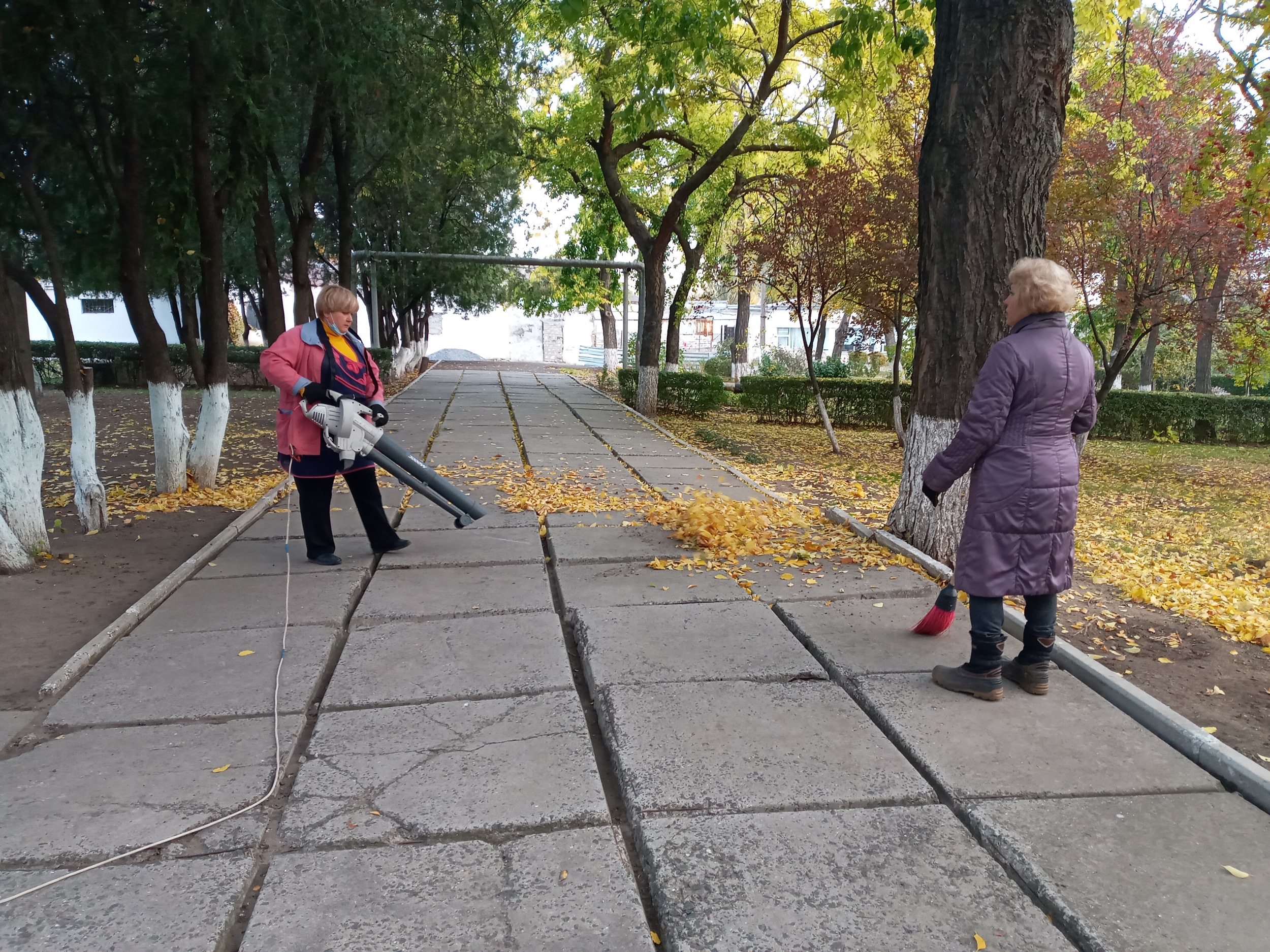 Осіння пора не тільки радує око красою пейзажів, але й додає роботи працівникам господарчої частини університету. Відповідальні та завзяті прибиральники й прибиральниці піклуються про зовнішній вигляд навчального закладу. Кожного дня, коли інші співробітники тільки приходять до університету, техпрацівники у поті чола вже гарують біля фасаду або в парку.