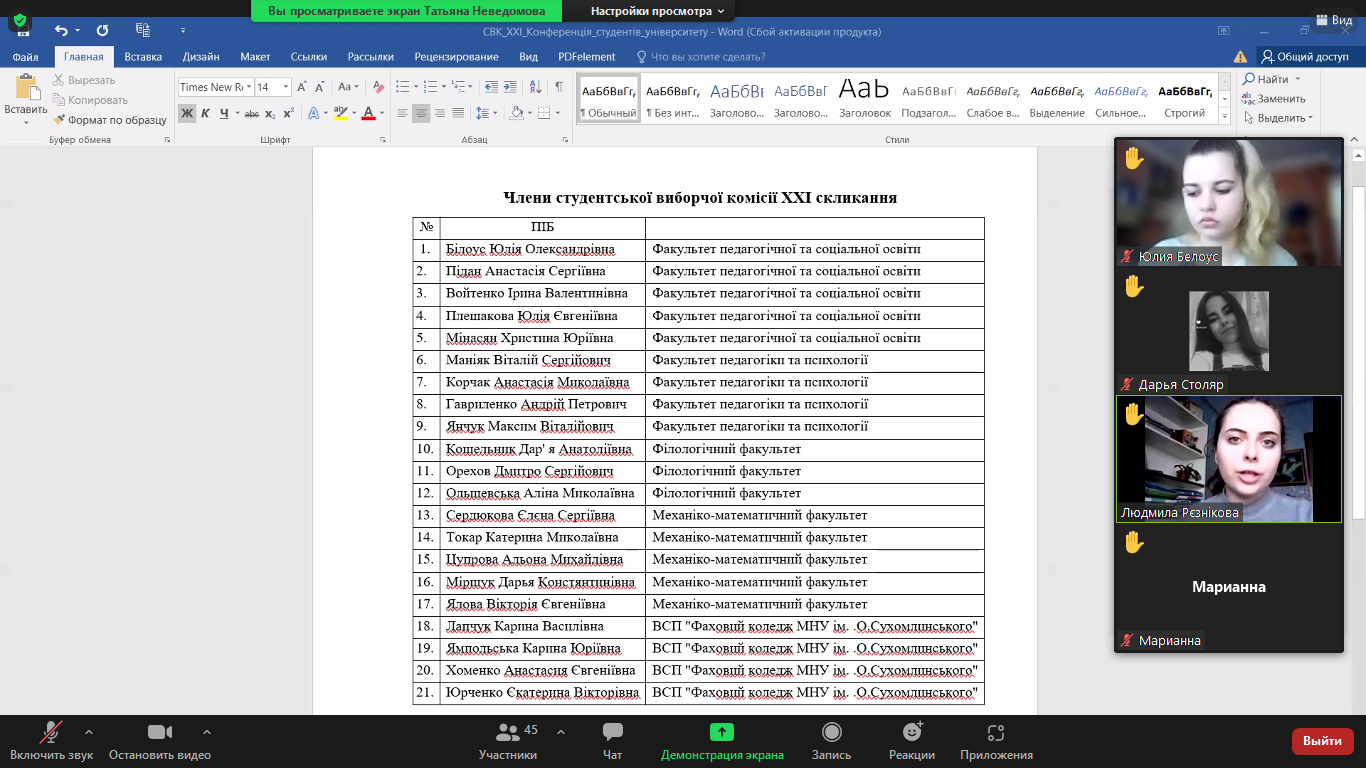 Під час онлайн Конференції студентів Університету, що відбулась 29 жовтня, після активного обговорення основних пунктів було затверджено Тимчасове положення про організацію та проведення виборів в органи студентського самоврядування Миколаївського національного університету імені В. О. Сухомлинського в дистанційному режимі. Також було затверджено склад студентської виборчої комісії XXI скликання.