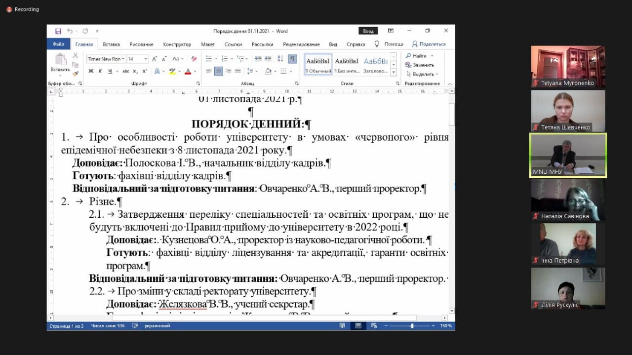 На початку засідання ректор університету В. Д. Будак наголосив на важливості виконання наказу МОЗ України № 2153 «Про затвердження Переліку професій, виробництв та організацій, працівники яких підлягають обов’язковим профілактичним щепленням» від 04 жовтня 2021 року.