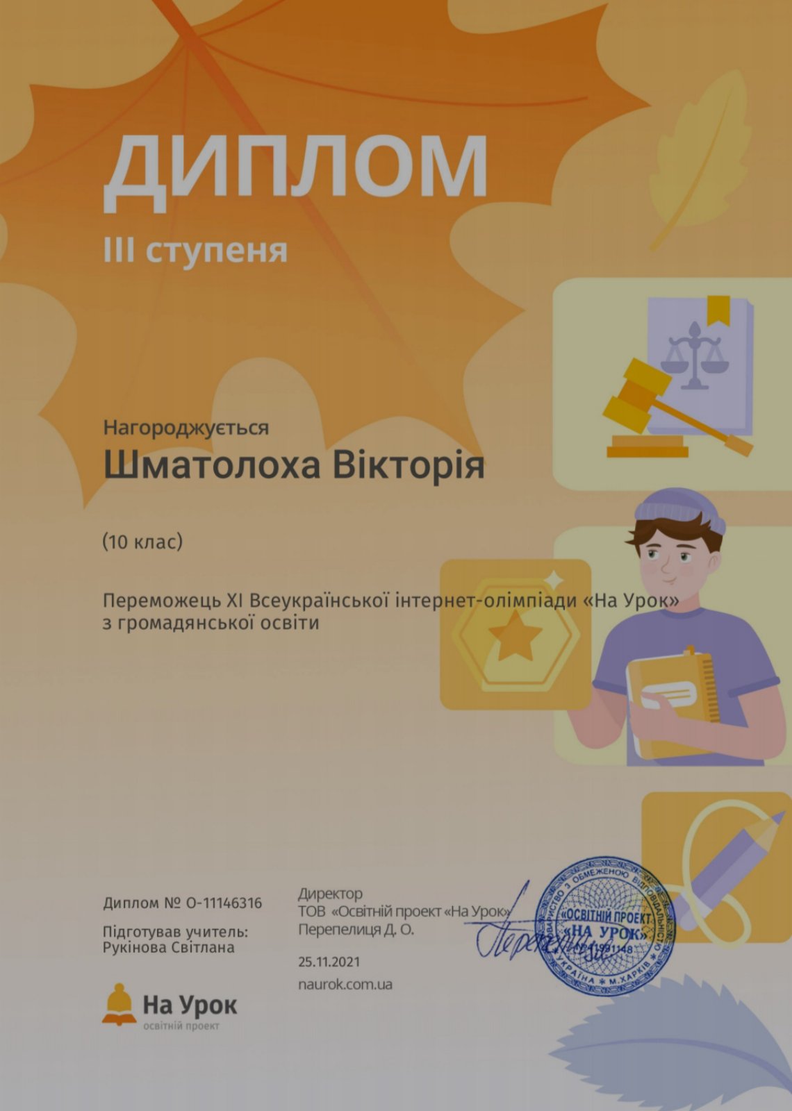 Наприкінці листопада було оголошено результати інтернет-олімпіади «На урок». За підсумками, студенти ВСП «Фаховий коледж МНУ імені В. О. Сухомлинського» отримали дипломи: