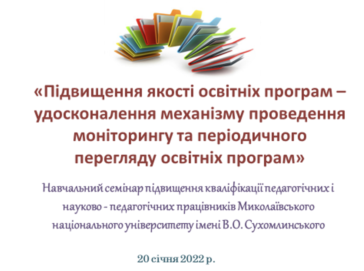 20 січня 2022 р. відбувся четвертий навчально-методичний семінар на тему «Підвищення якості освітніх програм – удосконалення механізму проведення моніторингу та періодичного перегляду освітніх програм» (відповідно до Програми підвищення кваліфікації педагогічних, науково-педагогічних працівників МНУ імені В. О. Сухомлинського). Спікерами семінару виступили проректор із науково-педагогічної роботи О. А. Кузнецова та в. о. керівника відділу ліцензування та акредитації Н. В. Данік.