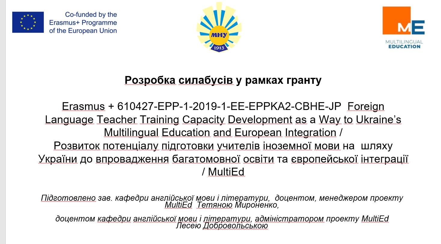 Представники університету команди міжнародного проекту Еразмус+ поділилися досвідом розробки силабусів і представили учасникам семінару доповідь – презентацію на тему «Розробка силабусів у рамках гранту Erasmus + 610427-EPP-1-2019-1-EE-EPPKA2-CBHE-JP «Foreign Language Teacher Training Capacity Development as a Way to Ukraine’s Multilingual Education and European Integration / Розвиток потенціалу підготовки учителів іноземної мови на шляху України до впровадження багатомовної освіти та європейської інтеграції / MultiEd», що була підготовлена завідувачем кафедри англійської мови і літератури, доцентом, менеджером проекту MultiEd Т. П. Мироненко та доцентом кафедри англійської мови і літератури, адміністратором проекту MultiEd Л. С. Добровольською.