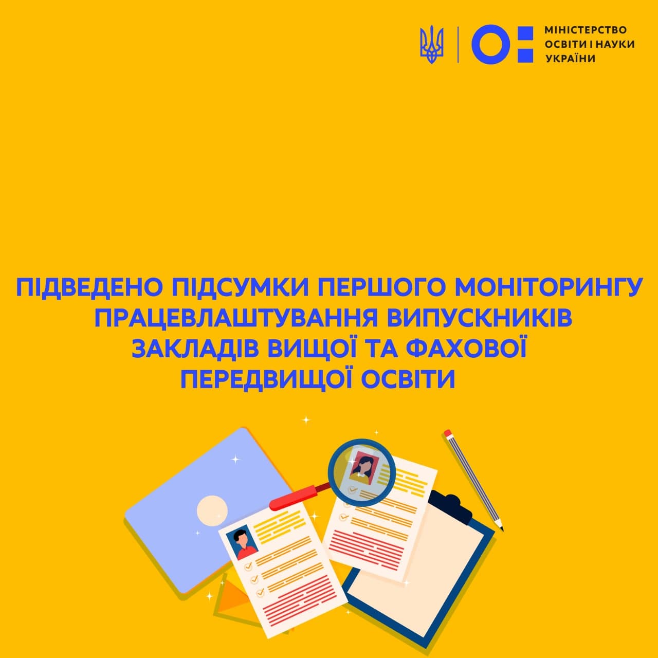 Посилання на ресурс: https://mon.gov.ua/ua/news/pidvedeno-pidsumki-pershogo-monitoringu-pracevlashtuvannya-vipusknikiv-zakladiv-vishoyi-ta-fahovoyi-peredvishoyi-osviti