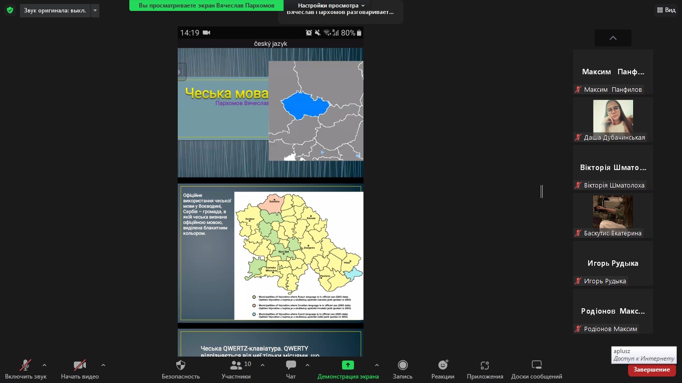 081 Право) описала шлях розвитку слов’янської писемності від рун до кирилиці. Пархомов В’ячеслав (155 група, спеціальність 123 Комп’ютерна інженерія) повідомив про одну із слов’янських мов – чеську. Баскутіс Катерина (125 група, спеціальність 231 Соціальна робота) підготувала презентацію про сербську мову.