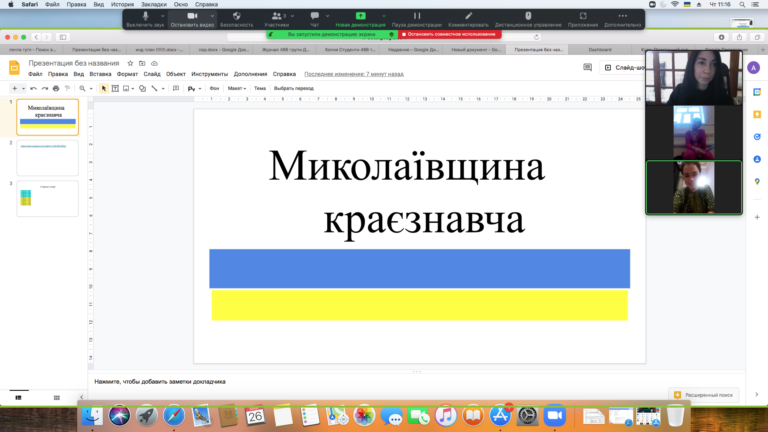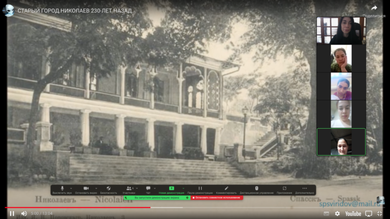 Доцент кафедри англійської мови і літератури Миколаївського національного університету мені В. О. Сухомлинського Садова Ганна Юріївна провела онлайн-екскурсію, побудовану на краєзнавчому матеріалі, під час якої познайомила студентів із Туркменістану з географічним розташуванням, природою, історичними фактами та подіями Миколаївщини, а також зі славетними справами його захисників сьогодні. Об’єктами краєзнавчої екскурсії послужили будинки, споруди, які безпосередньо пов’язані з життям, історією та розвитком культури міста Миколаєва, та окремі його частини (райони, мікрорайони, площі, вулиці, парки, сквери тощо). У ході екскурсії студенти познайомилися з багатьма назвами вулиць, площ, річок, споруд, що сьогодні зберігають пам’ять про сучасних мужніх народних героїв і події, які пов’язані з Миколаєвом.