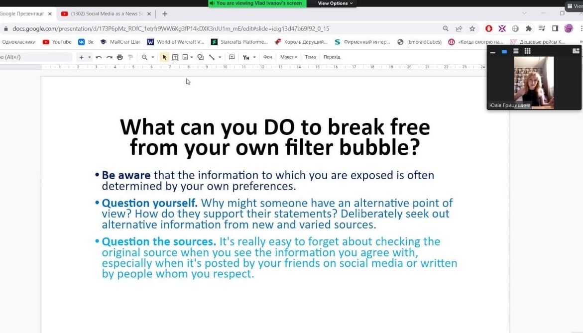 В умовах війни уміння критично аналізувати інформацію, виявляти дезінформацію, протистояти їй набули особливого значення. Зважаючи на актуальність розвитку навичок медіаграмотності серед молоді, команда викладачів кафедри германської філології і студентів філологічного факультету долучилася до організації та проведення двох інтерактивних онлайн тренінгів.