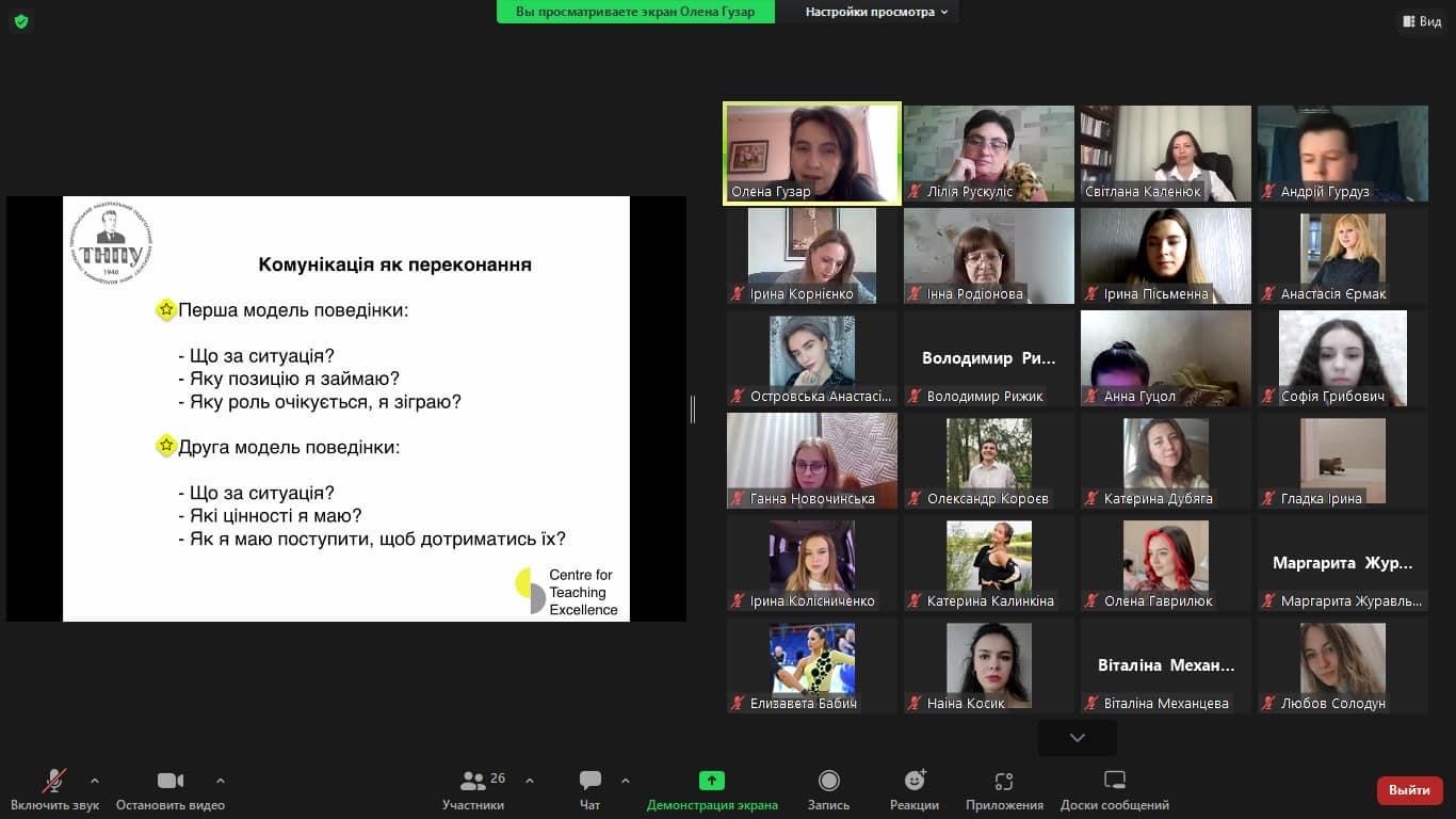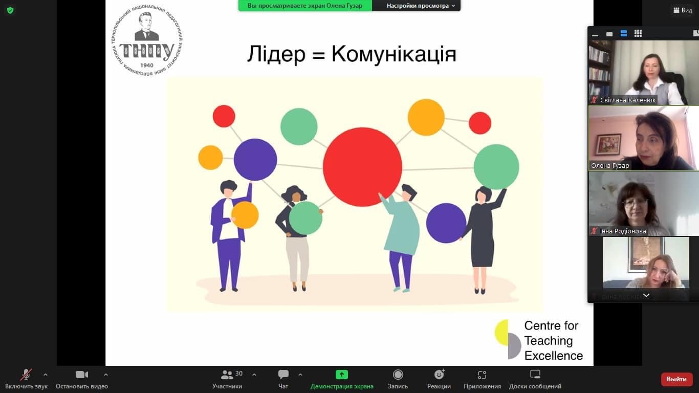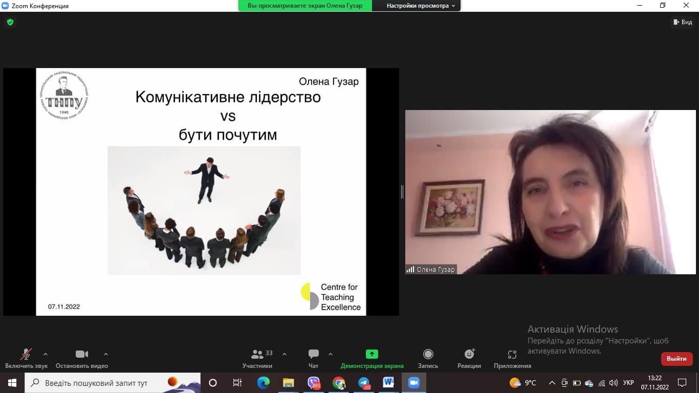 7 листопада 2022 року студенти й викладачі Миколаївського національного університету імені В. О. Сухомлинського мали можливість прослухати лекцію Олени Гузар, кандидата філологічних наук, доцента, керівника Центру професійного розвитку та лідерства національного педагогічного університету імені В. Гнатюка. Лекторка відгукнулася на запрошення кафедри української мови і літератури й провела онлайн-заняття з актуальної теми – «Комунікативне лідерство».