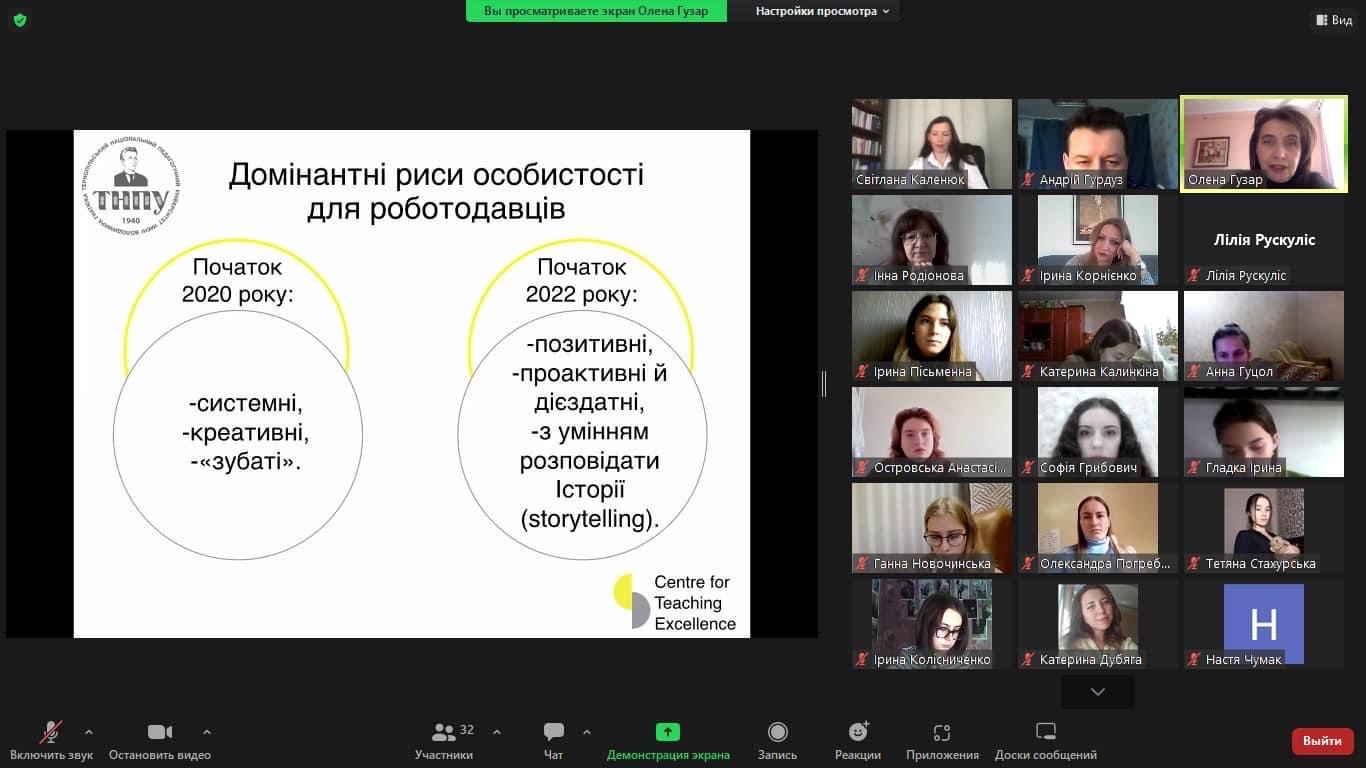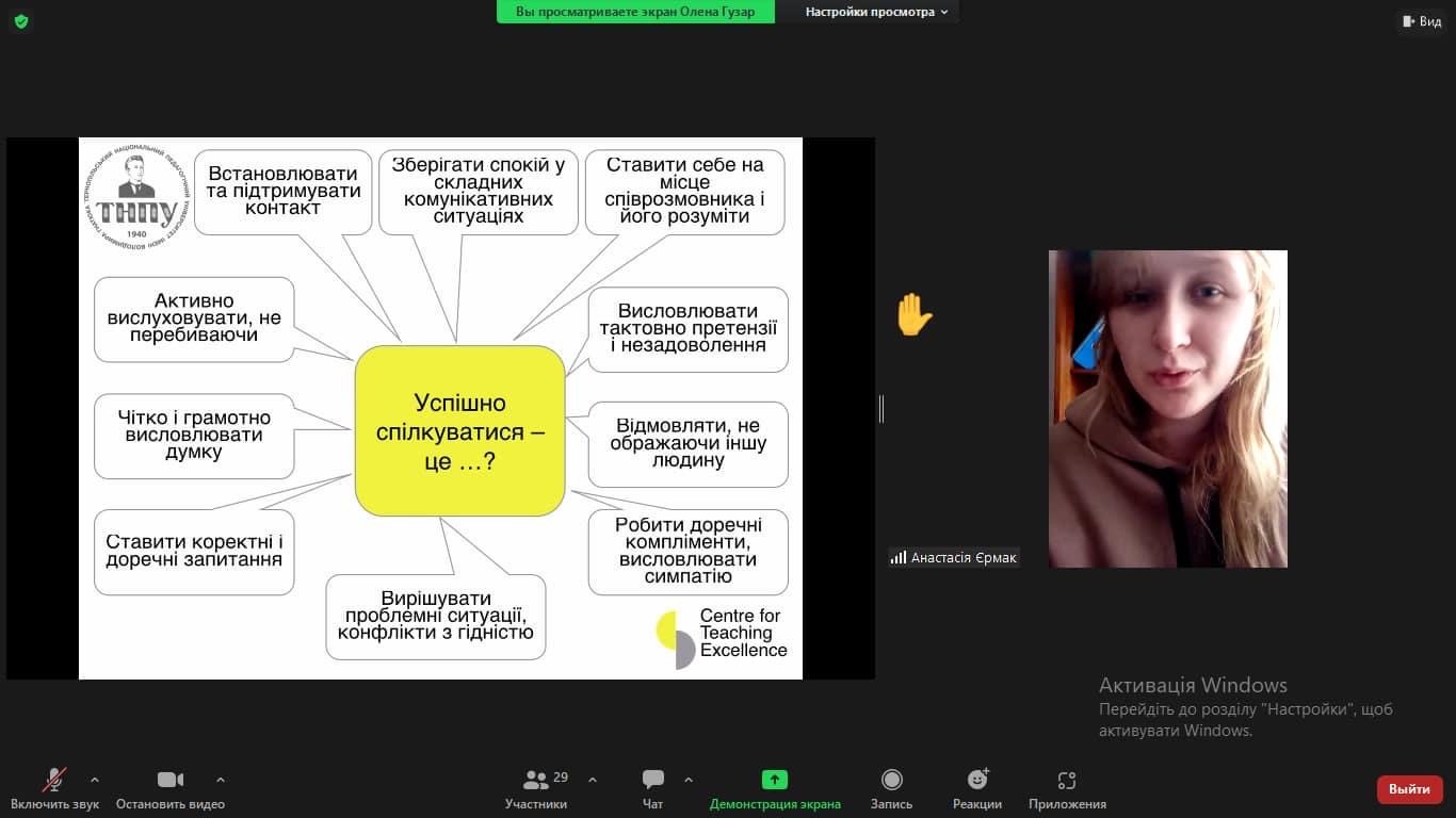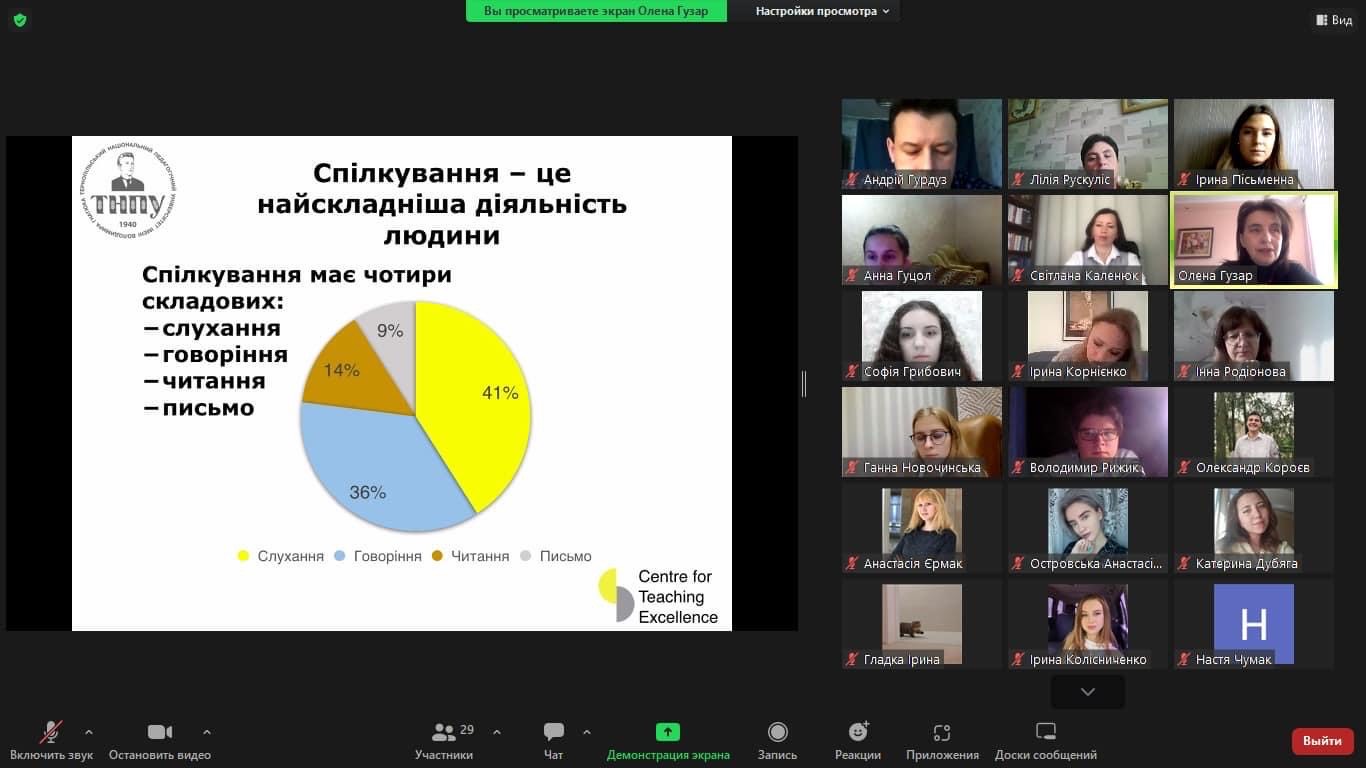 Олена Володимирівна ознайомила присутніх із фрагментами розвитку комунікативного лідерства шляхом визначення спілкування й комунікативної компетентності як частини професійної компетентності; окреслила домінантні риси особистості для роботодавців, а також розкрила основи успішного спілкування.