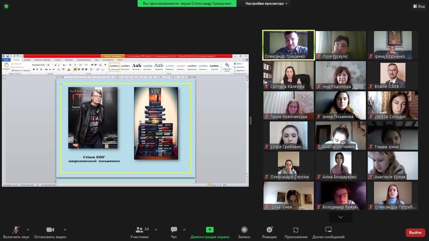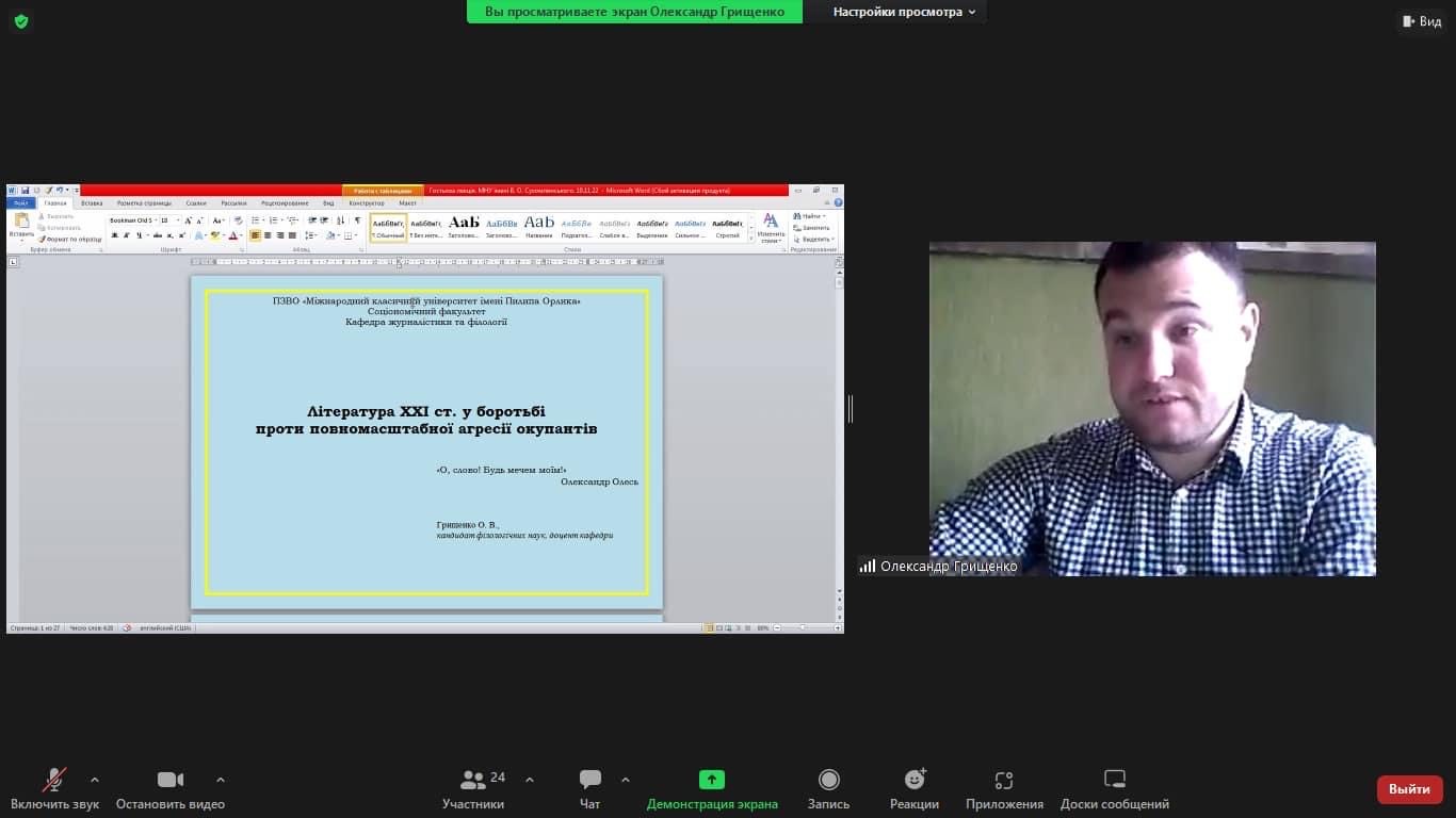 Непідробний інтерес у слухачів серії «гостьових» лекцій викликала надзвичайно актуальна тема «Література ХХІ ст. у боротьбі проти повномасштабної агресії окупантів», представлена кандидатом філологічних наук, доцентом кафедри журналістики та філології ПЗВО «Міжнародний класичний університет ім. Пилипа Орлика» О. В. Грищенком.