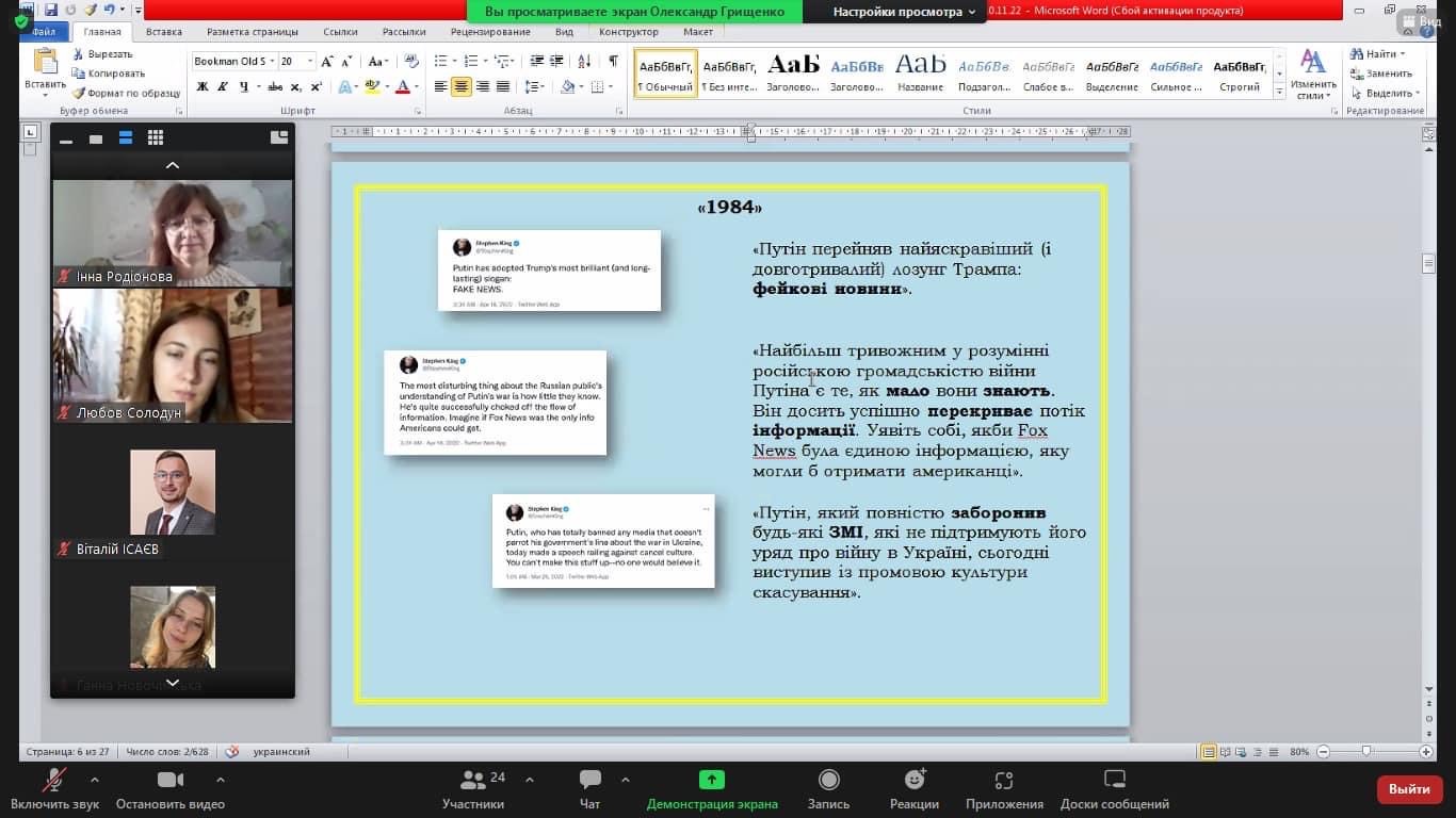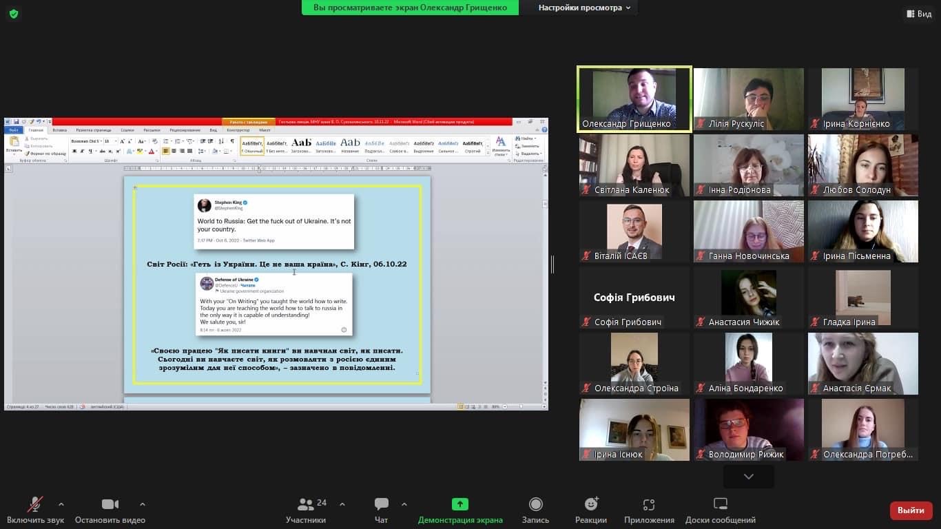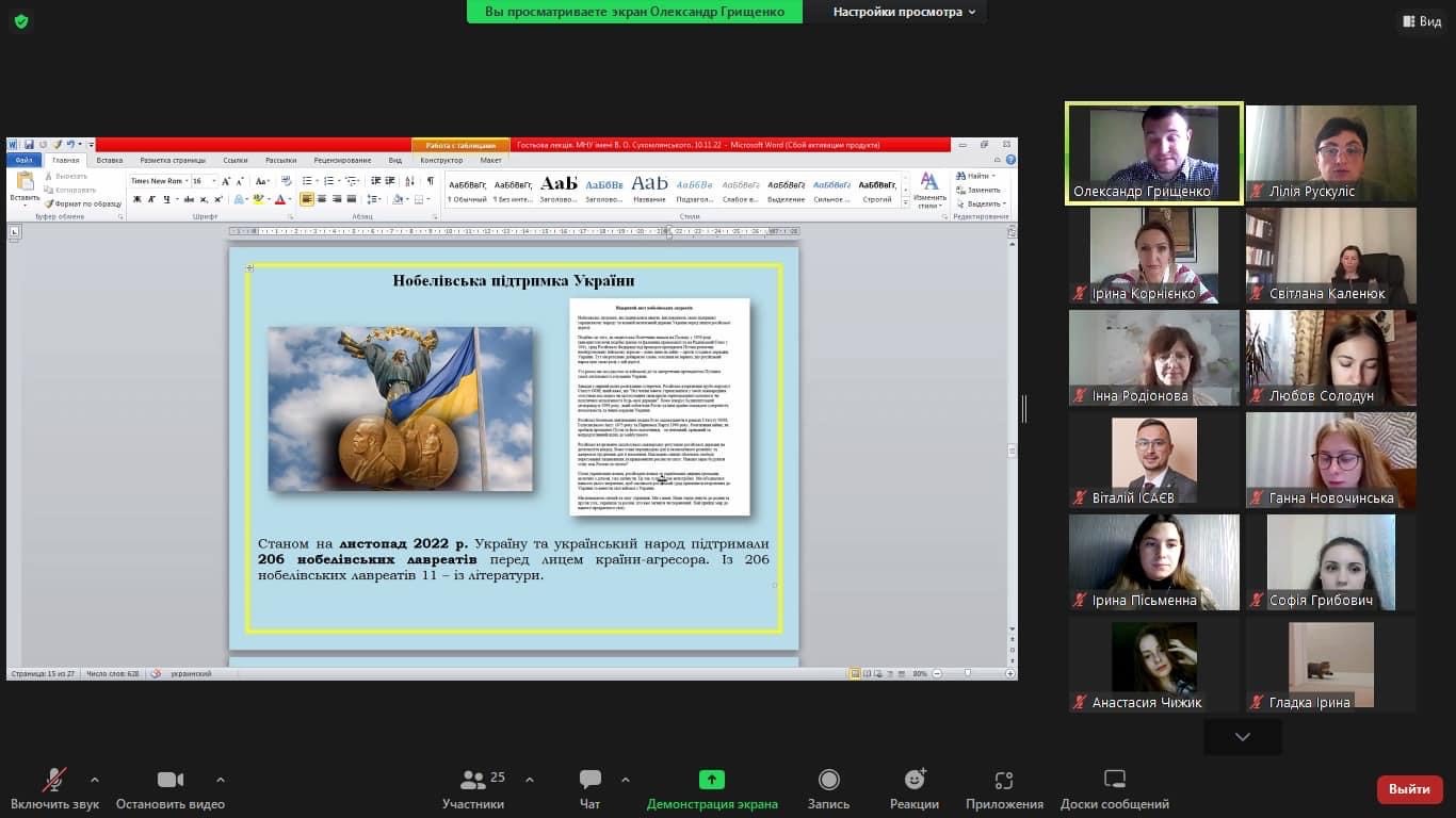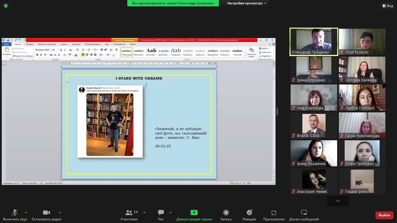 Лектору дав можливість присутнім ознайомитися з позицією письменників світового рівня щодо злочинних дій російських окупантів в Україні.