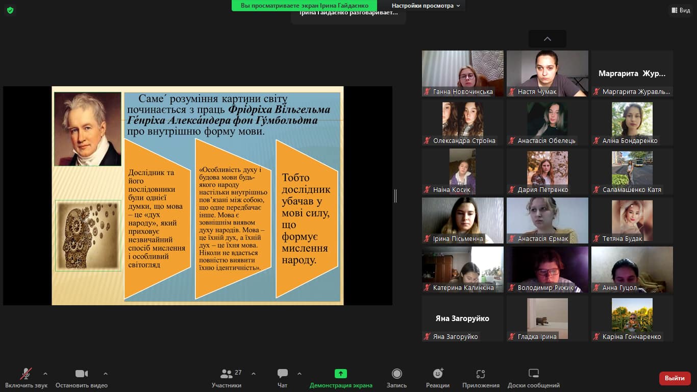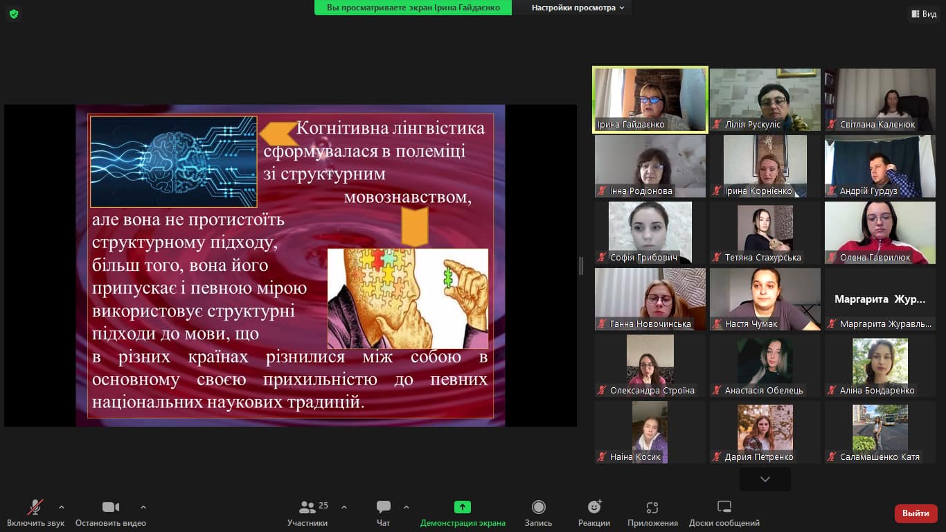 11 листопада 2022 року гостьову лекцію для студентів Миколаївського національного університету імені В. О. Сухомлинського читала Ірина Гайдаєнко – кандидат філологічних наук, доцент кафедри української філології та журналістики Херсонського державного університету. Тема лекції: «Когнітивна лінгвістика: від мовної картини світу до слота». У ході заняття проаналізовано історію виникнення та становлення когнітивної лінгвістики; з’ясовано категорії цієї науки; закцентовано увагу на специфіці об’єктивації концепту «війна» в романі Ю. Винничука «Танго смерті» й створенні індивідуально-авторської картини світу.