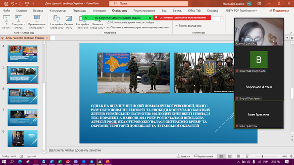 22 листопада 2022 року викладачами ВСП «Фаховий коледж МНУ імені В. О. Сухомлинського» було проведено кураторську годину з нагоди Дня Гідності та Свободи. Викладачі розповіли про історію заснування цього свята, провели хвилину мовчання за загиблими в Революції гідності та у війні, яку розв’язала росія проти нашої держави.